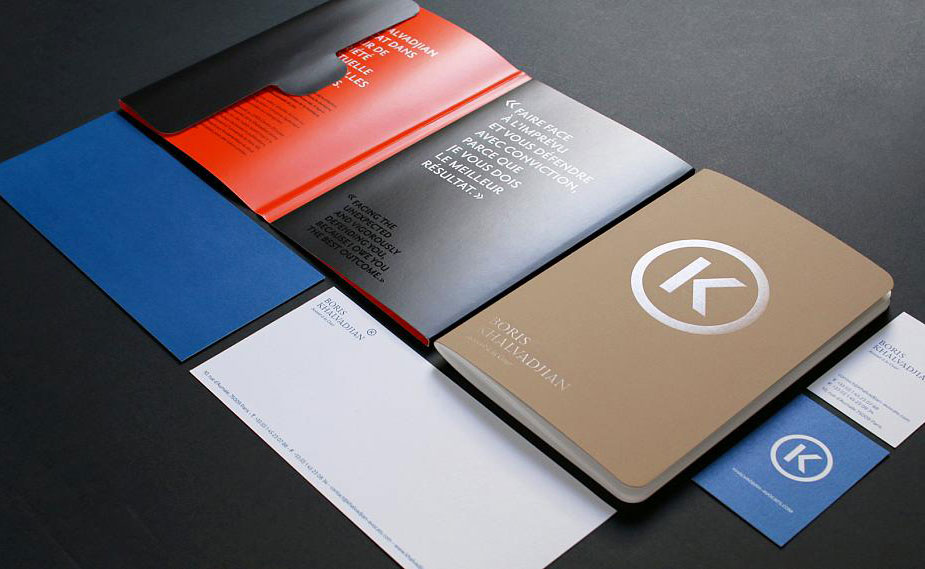 Boris Khalvadjian vient de faire évoluer la communication de son cabinet d'avocats en confiant à Graphéine la création de sa plaquette commerciale. Dédié à la création, la production et à l'innovation, son cabinet est spécialisé dans la propriété intellectuelle. Afin de faire connaitre son activité, et répondre à sa volonté d'originalité, nous avons développé pour lui un objet d'édition singulier. Notre réponse a donc pris la forme d'une plaquette qui est à la fois un support de communication et un objet "gift" qui va pouvoir accompagner les personnes au quotidien dans leur activité professionnelle. Le dépliant commercial est réalisé et monté comme une sur-couverture qui enveloppe un carnet de notes dont le rôle sera d'être le meilleur allié de son destinataire. Se glissant aisément dans une sacoche, et discrètement marqué du logotype monogramme "K" de Boris Khalvadjian ce carnet prolonge affectueusement la mission purement publicitaire du dépliant commercial. À noter que cet emblème, et son bloc typographique, ont été réalisés avec talent par la DA Marie-Pierre Pastini.