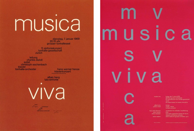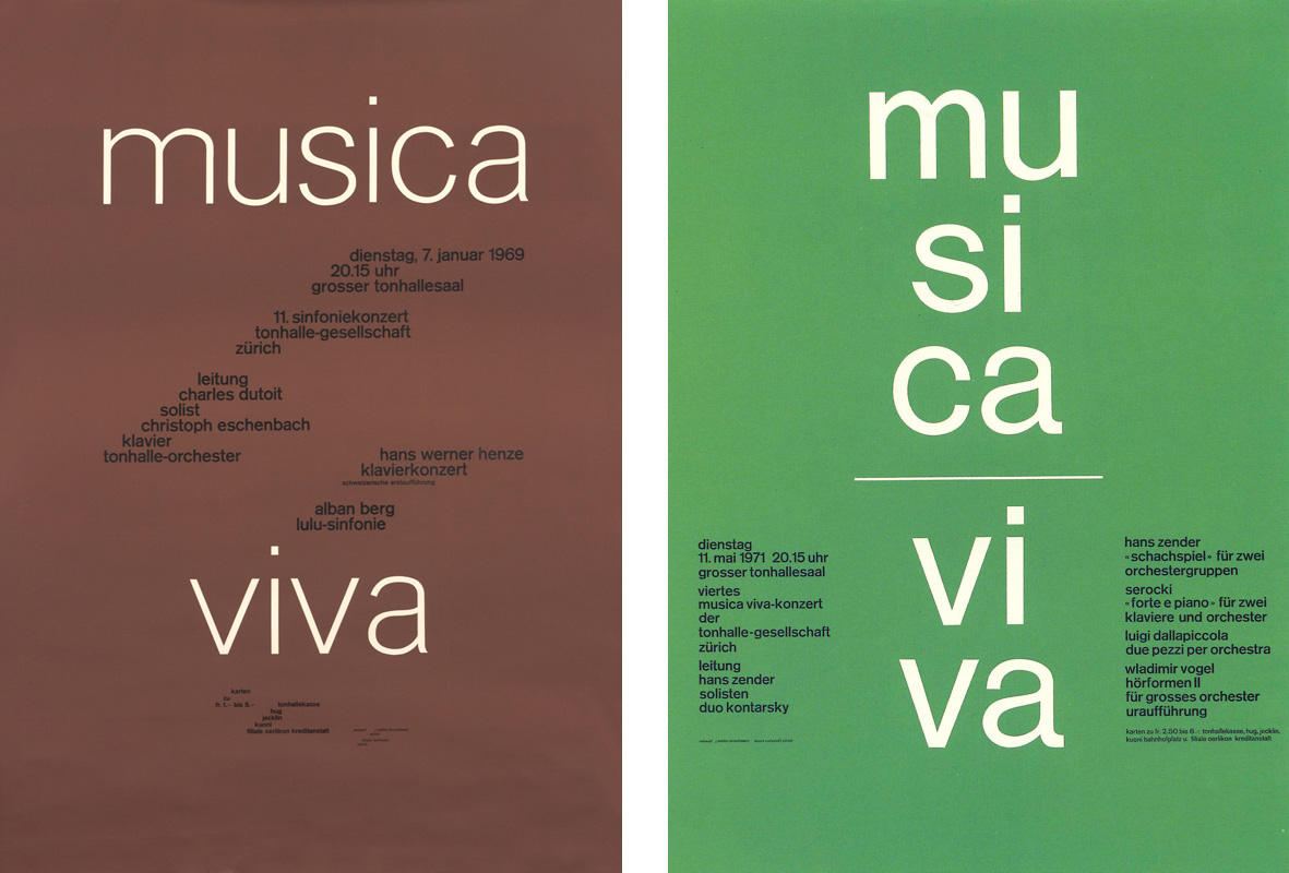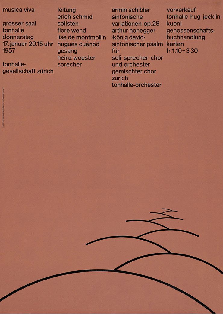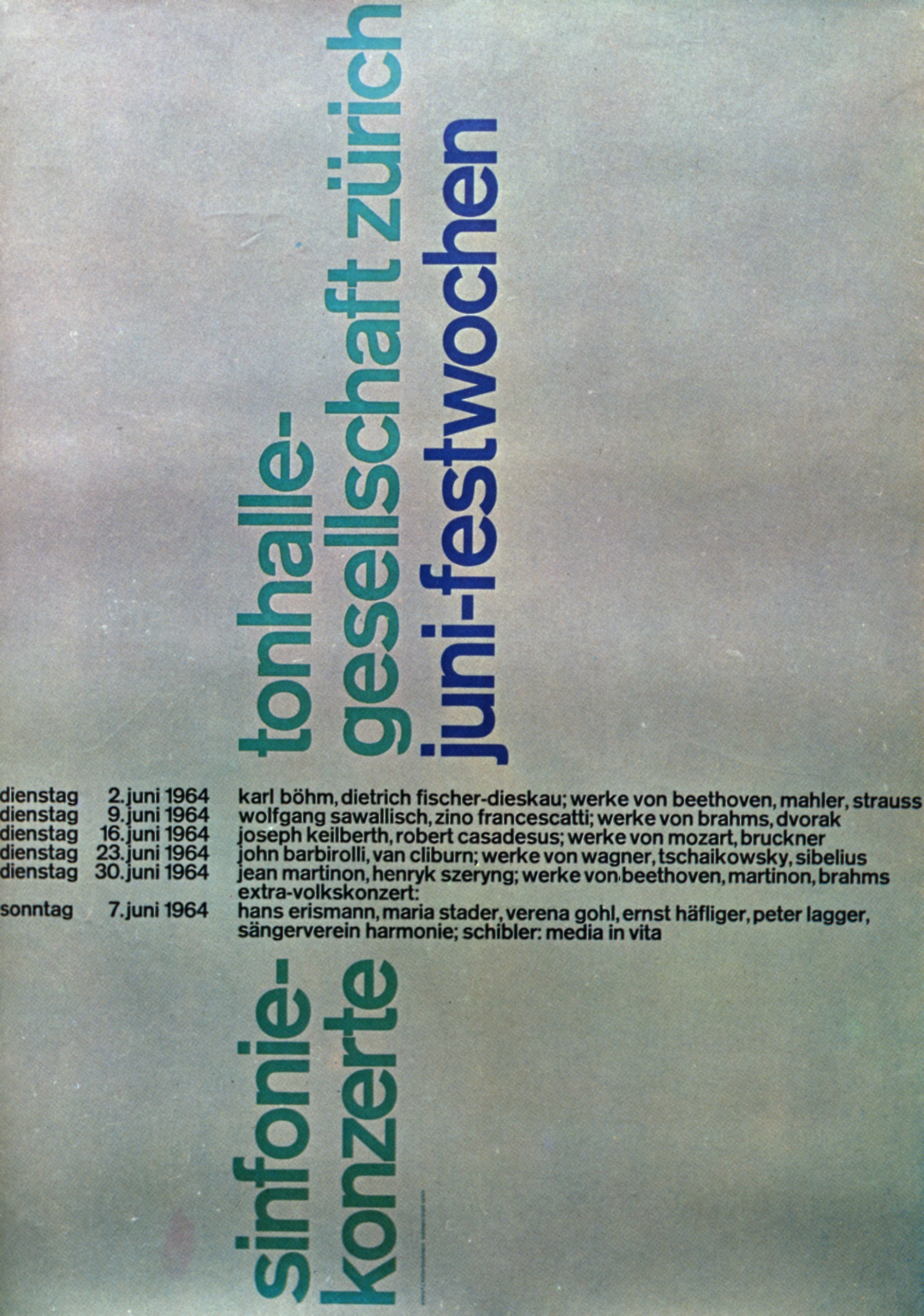 Nous-mêmes chez Graphéine, nous ne pouvons nier son influence. Les affiches que nous avons réalisées pour le Chœur et Orchestre de l'Université Paris-Sorbonne en sont un bon exemple ! D'ailleurs elles sont composées en Akzidenz Grotesk, la typographie de prédilection de Brockmann !