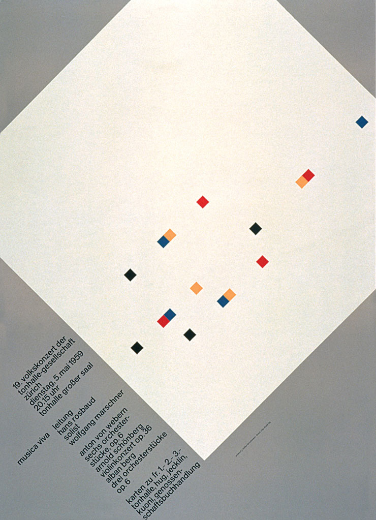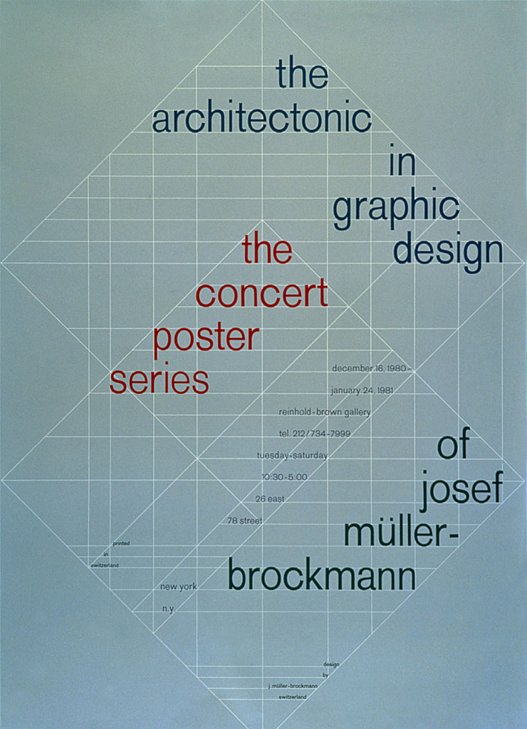 Ces règles peuvent se résumer par l'utilisation de grilles de composition très strictes, de photographies objectives afin d'éviter les émotions, l'importance du rythme, de l'harmonie, des compositions mathématiques et géométriques. Par exemple, à cette époque, Brockmann, voit la musique comme un art abstrait, il envisage donc ses affiches de concert de manière abstraites. L'éditeur Lars Müller décrira d'ailleurs l'affiche de Beethoven (1955) comme l'exemple ultime de "musicalité en design".