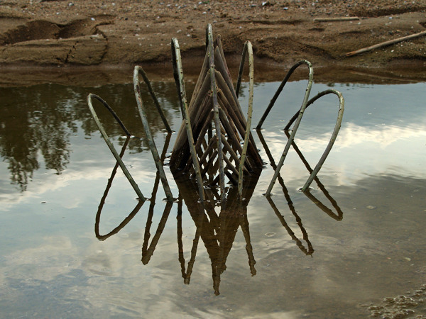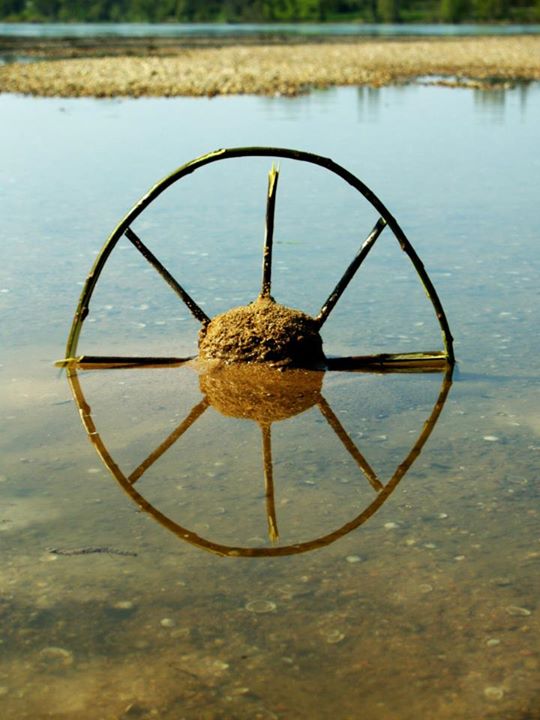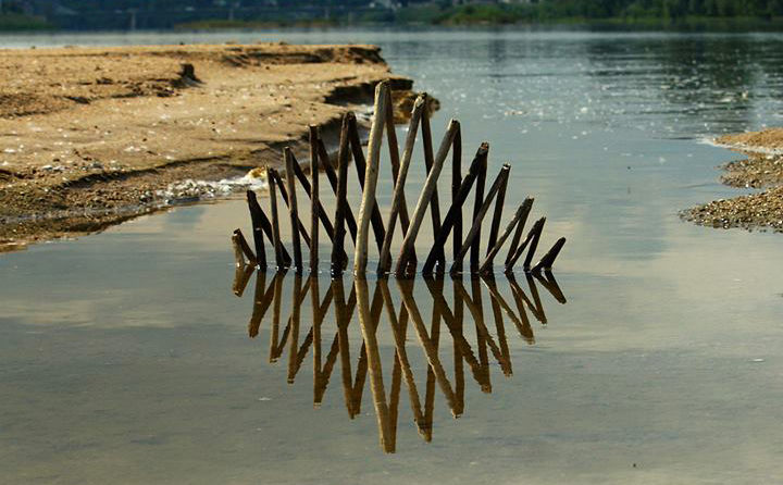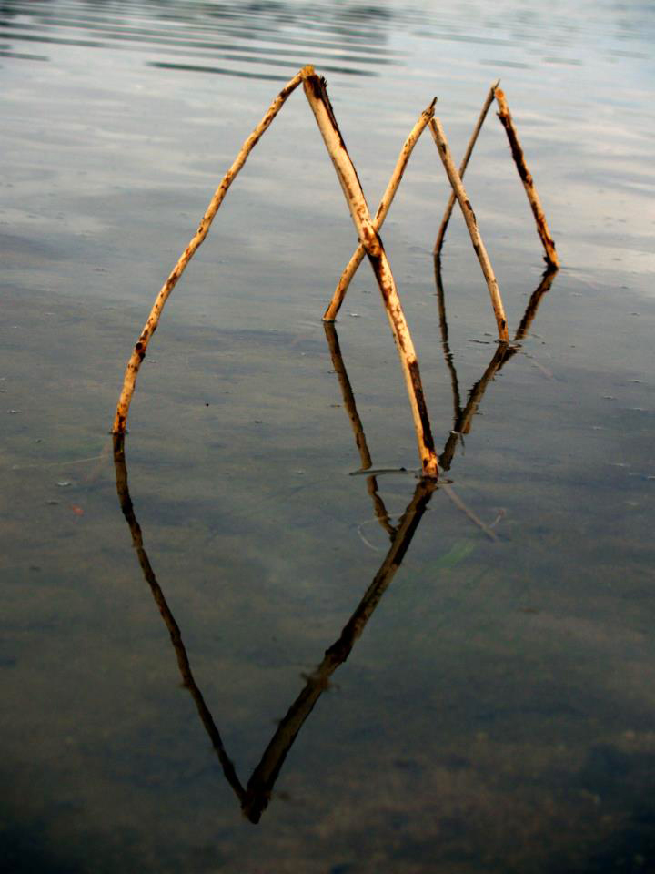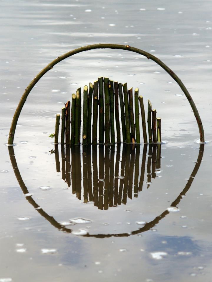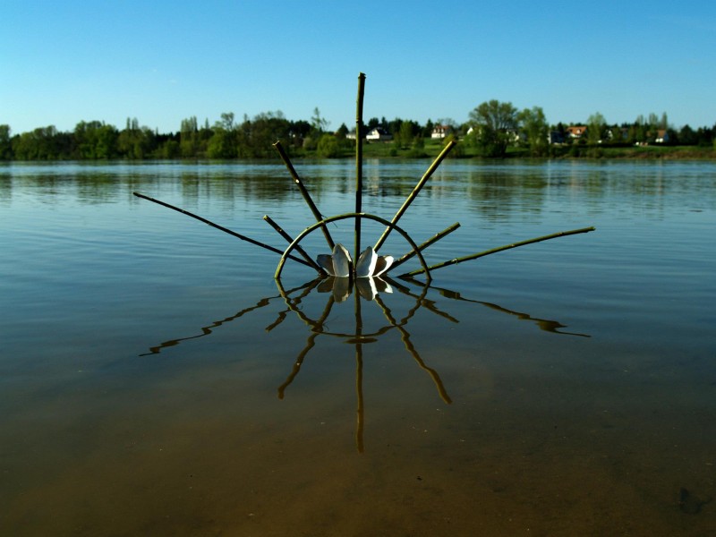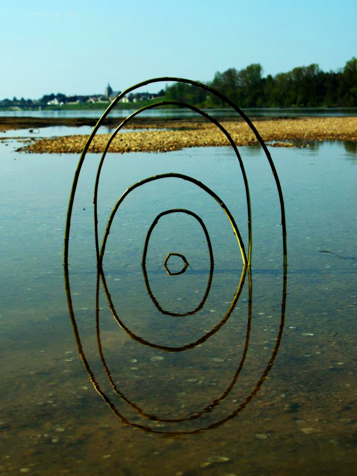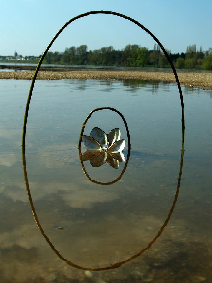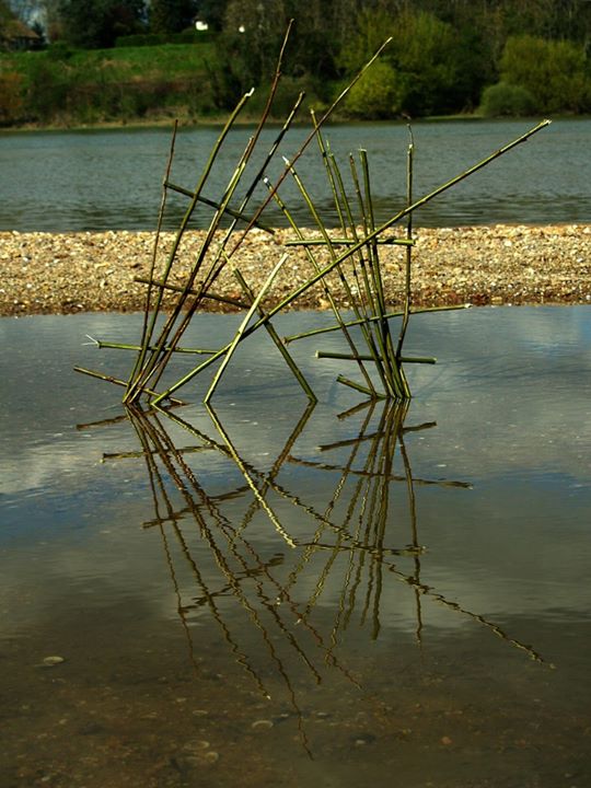 Depuis les bord de Loire, l'eau devient miroir, et transforme par symétrie ses œuvres éphémères en compositions surréalistes. Son crayon est un canif, une lame en guise de mine de plomb. La nature semble revivre. Les branches mortes reprennent forme. Le jonc devient coloriage. Le feuillage devient couleur. Quelle poésie dans ces images.