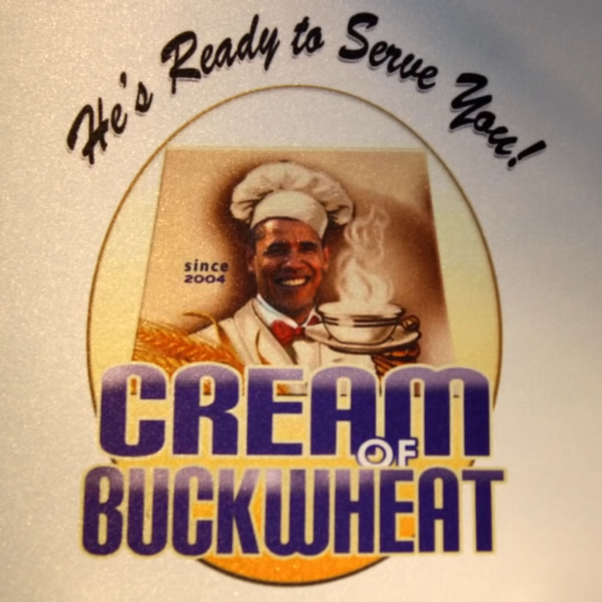 Last but not least, during Obama's investiture, the racists were very creative. The figure of Mammy and Rastus from Cream of Wheat were hijacked featuring the face of the president. Please note the eloquent play on words consisting in changing the word wheat into buckwheat (black wheat)... accompanied by the slogan "he is ready to serve you".