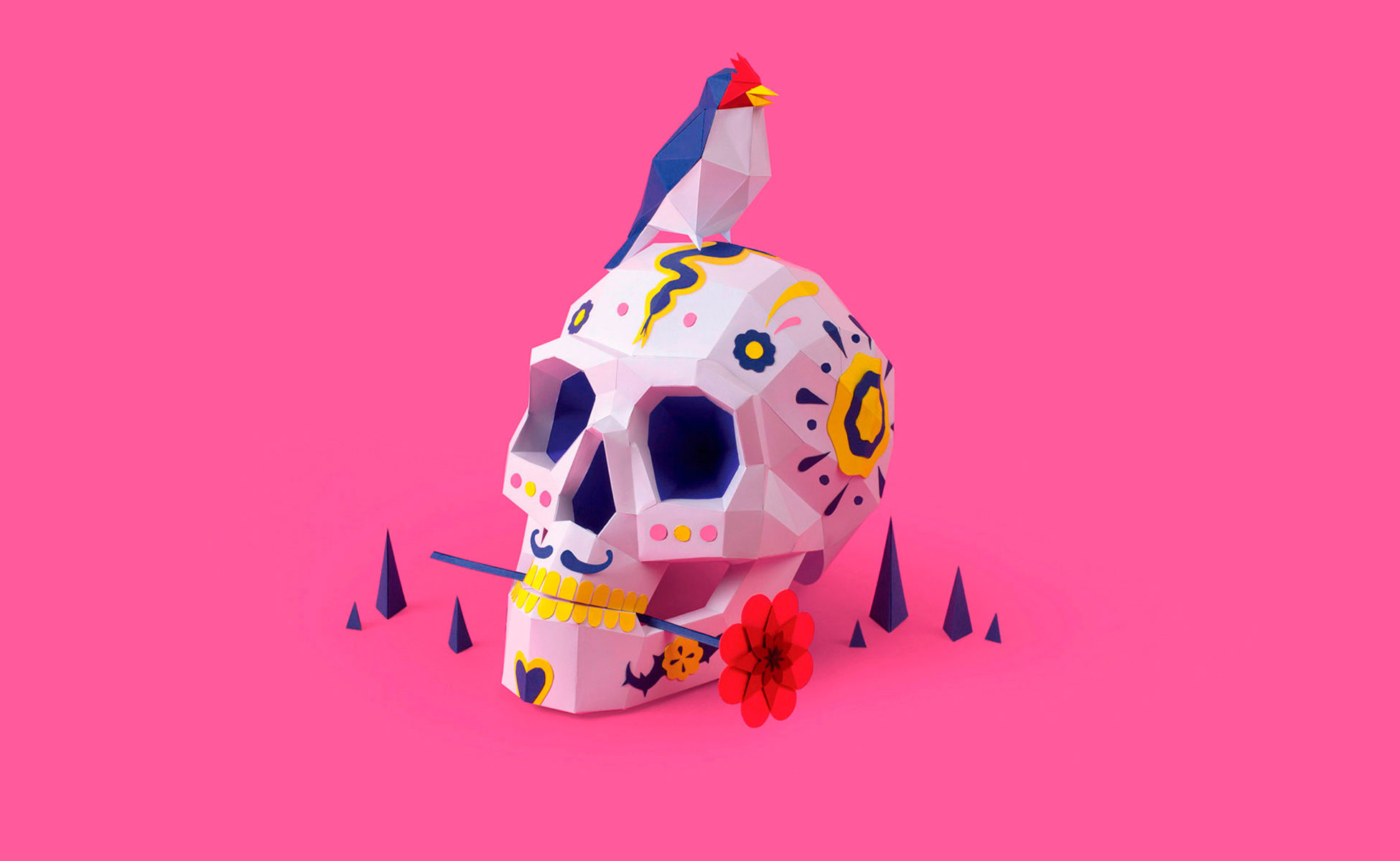 Communication of the 2017 Pérouges Festival: poster design, paper art, brochures... Imagine a paper skull, a multicoloured bird, all forming a contemporary vanity