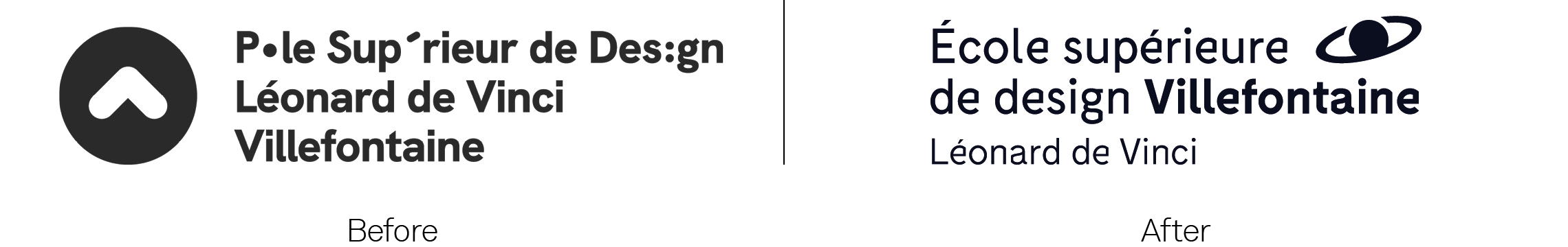 In 2022, the health context of the last few years and the competition between schools raise the question of the school's own distinctive character and identity. The "Pôle Supérieur de Design" then becomes "École Supérieure de Design Villefontaine": more legitimate, more competitive, more distinguishable. New strategic issues were taken into account: the course of study had to be more distinct from the other courses offered by the school, while remaining associated with them. Graphically, the previous logo already met strong identification and demarcation needs. The arrow, whose sign has been removed from the circumflex accent of "pole", plays its role as a signpost to which everyone can refer. But beyond a message of progression, it did not tell much. A big miss when you know the strength of the storytelling built in 2012 and in particular of the baseline "A degree from elsewhere".