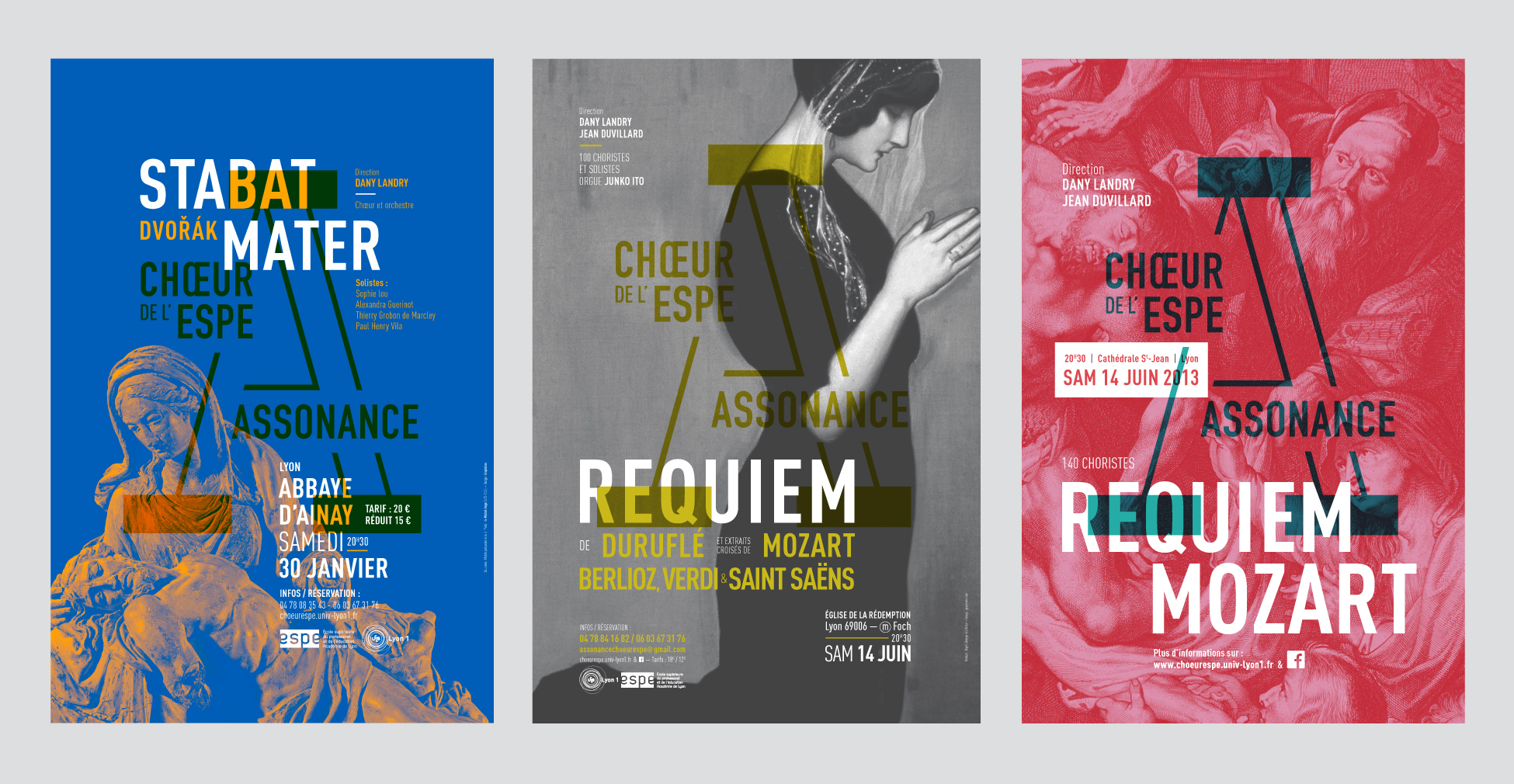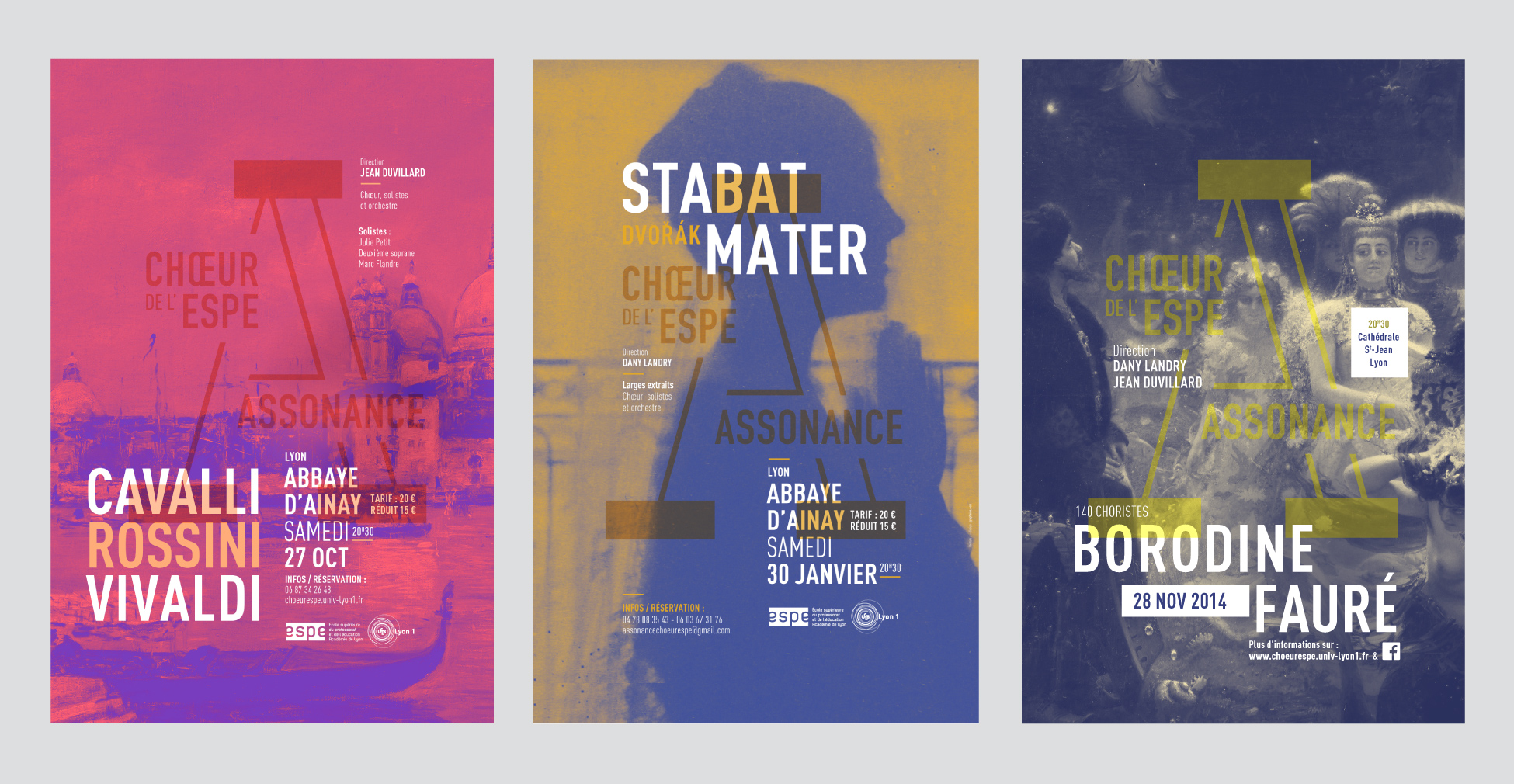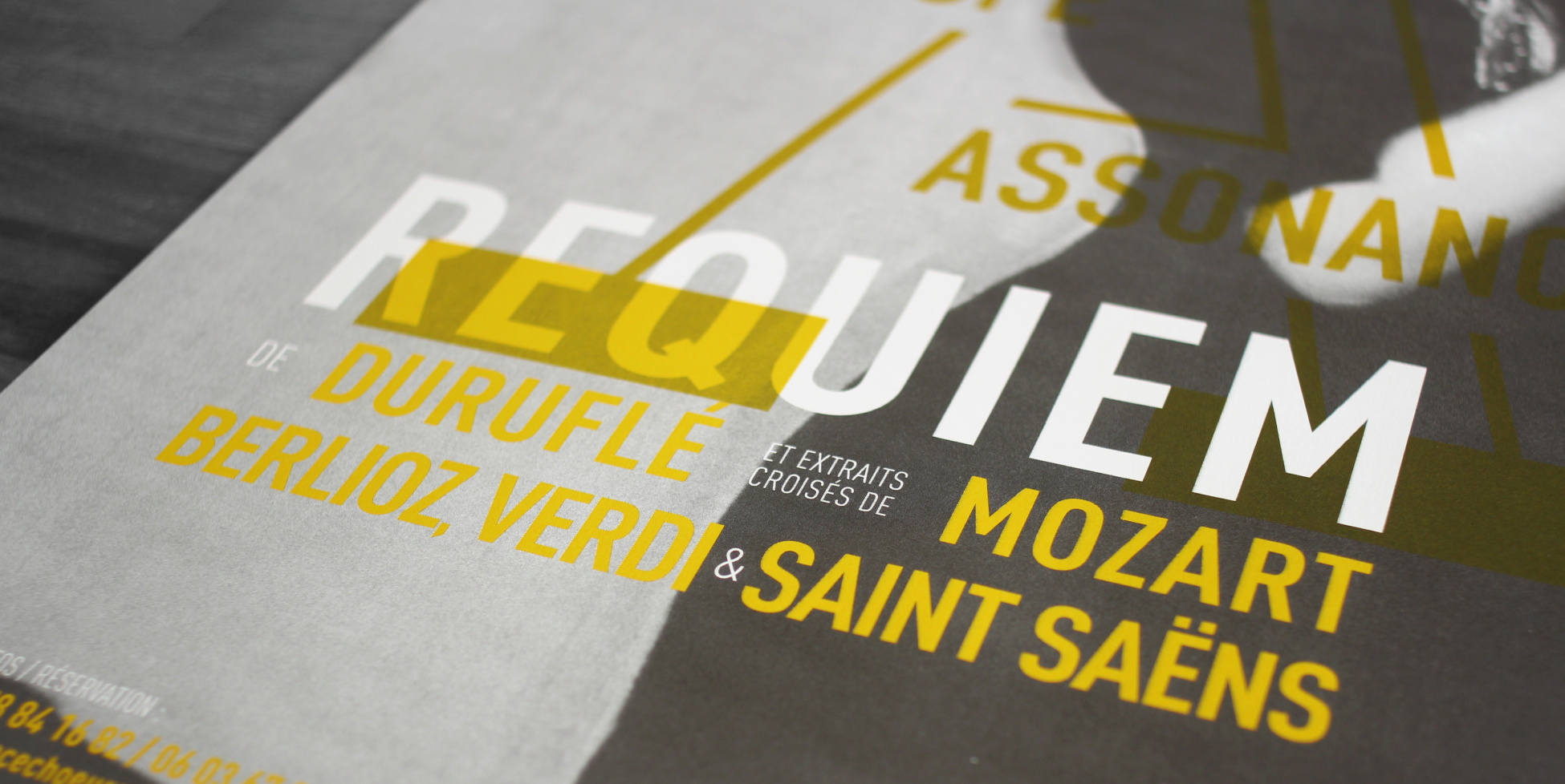 Le chœur Assonance, avec un statut d'association, fait parti de ces ensembles amateurs dont le niveau s'approche des choeurs professionnels. En choisissant de les accompagner quasi bénévolement depuis plus de 5 ans, nous bénéficions en retour d'une grande marge de liberté créative. Chaque affiche fait l'objet d'expérimentations techniques, comme des jeux d'impression en ton direct avec des Pantones avec lesquels nous aurions rarement l'occasion de jouer. Encres métalliques, fluo, pastels, jeux de surimpression ...