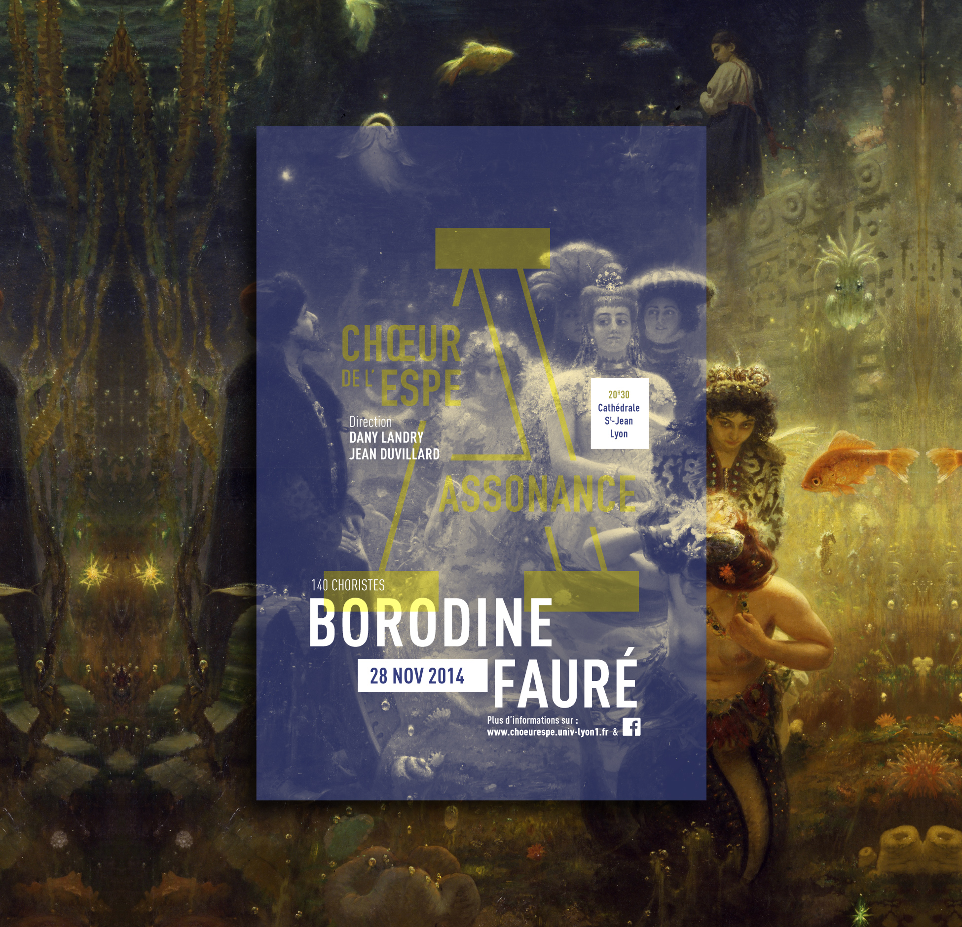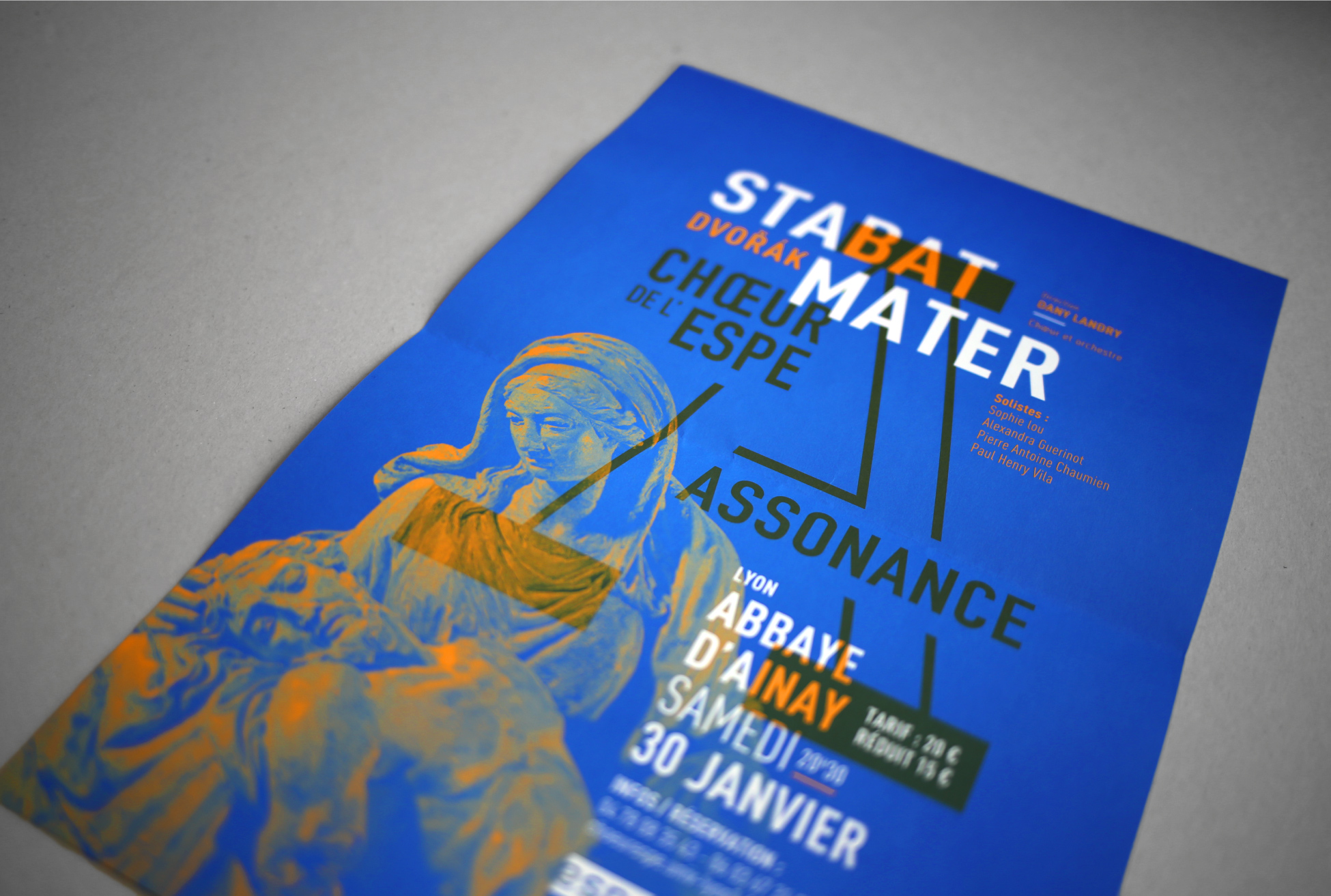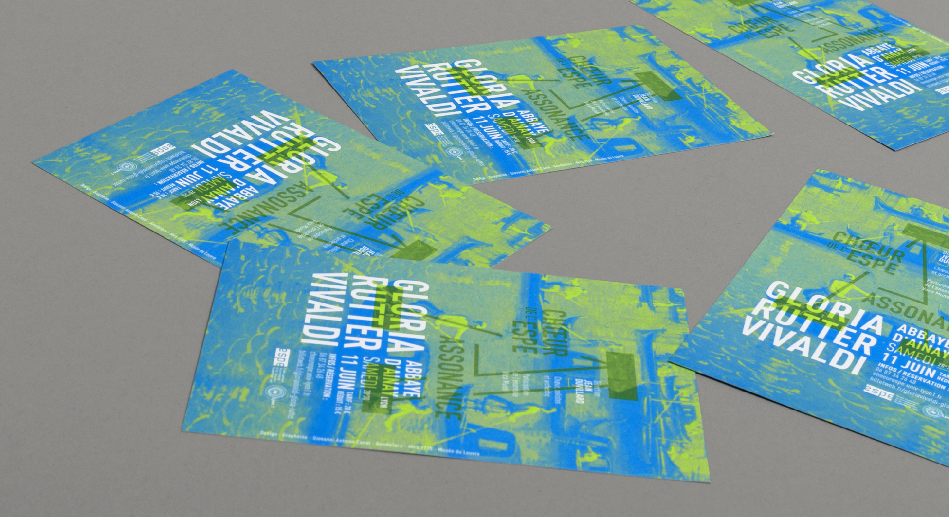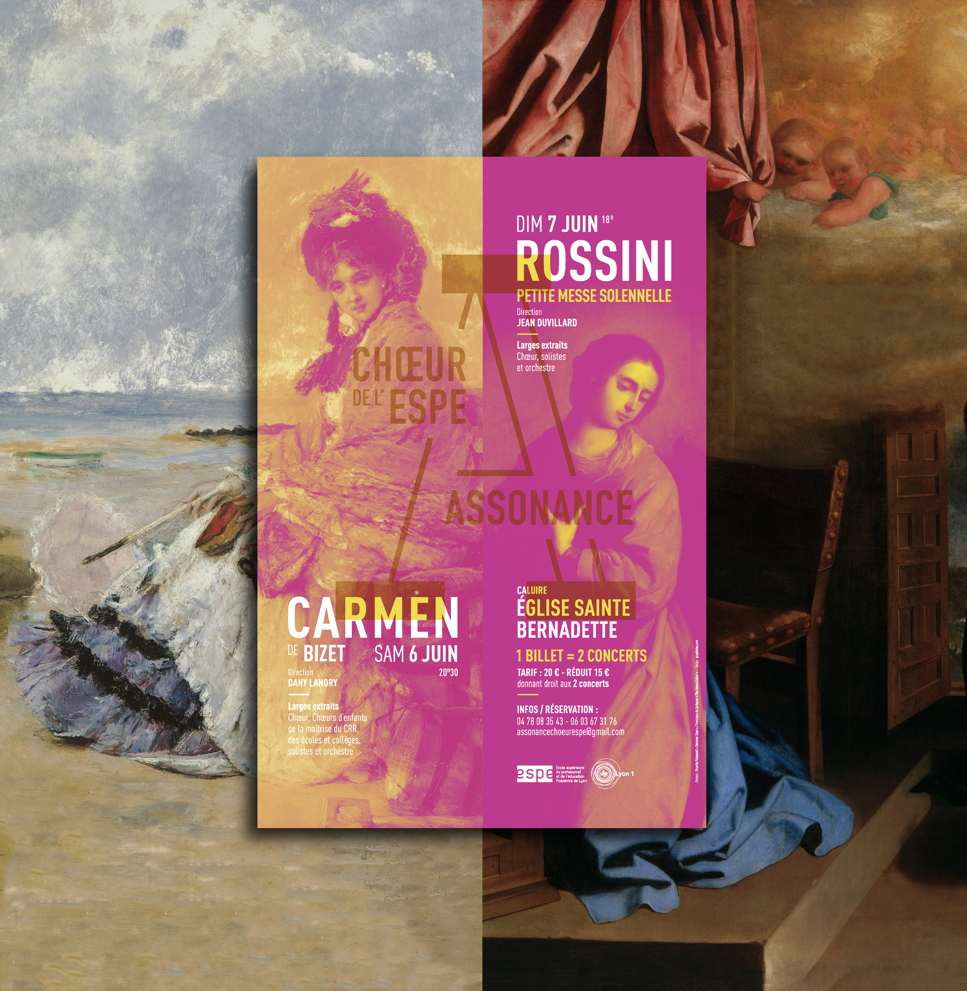 Le chœur Assonance, avec un statut d'association, fait parti de ces ensembles amateurs dont le niveau s'approche des choeurs professionnels. En choisissant de les accompagner quasi bénévolement depuis plus de 5 ans, nous bénéficions en retour d'une grande marge de liberté créative. Chaque affiche fait l'objet d'expérimentations techniques, comme des jeux d'impression en ton direct avec des Pantones avec lesquels nous aurions rarement l'occasion de jouer. Encres métalliques, fluo, pastels, jeux de surimpression ...