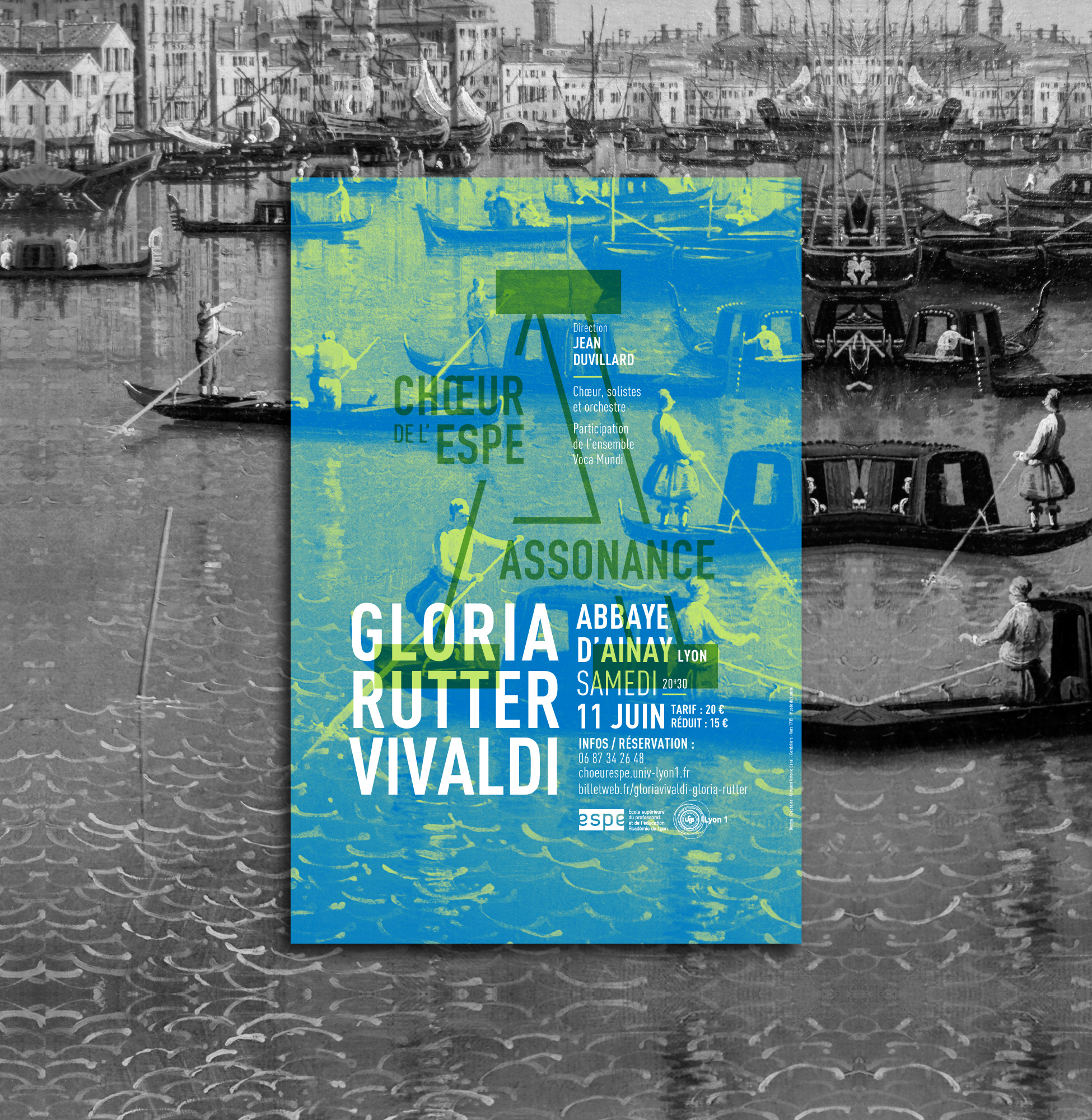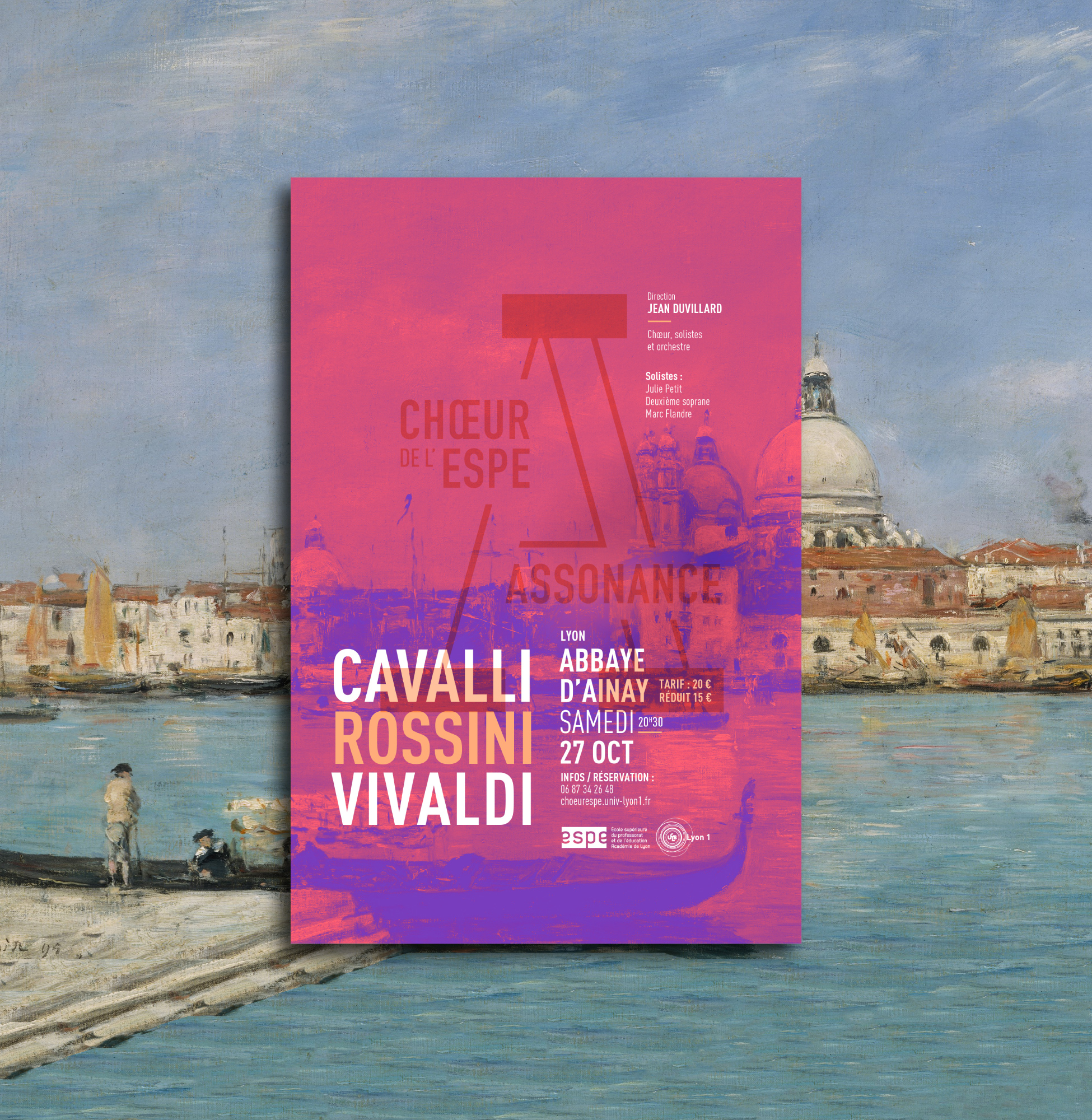 Cette identité se déploie principalement sur les affiches des concerts. Le logo devient l’une des composantes principales des affiches, il est toujours présent de manière centrale et imposante. Il sert de grille à la composition des titres, avec lesquels il joue par superposition. En fond, des recadrages de peintures classiques permettent d’illustrer la thématique du concert. Les images sont traitées en bichromie, les couleurs sont tantôt vives et puissantes, tantôt calme et douces. On essaie de jouer avec les contrastes simultanés pour créer une tension visuelle et apporter de la modernité à un sujet par nature classique.