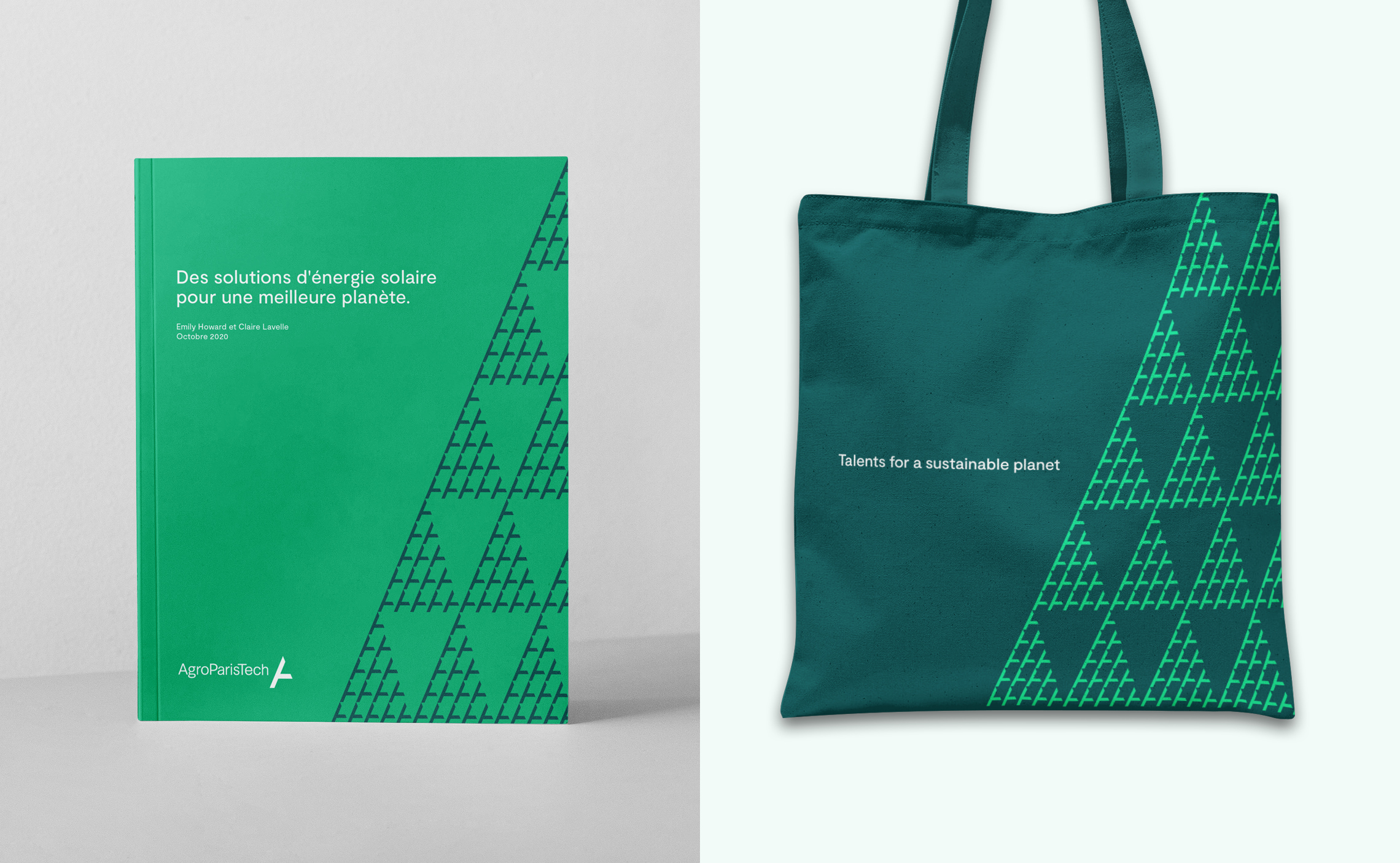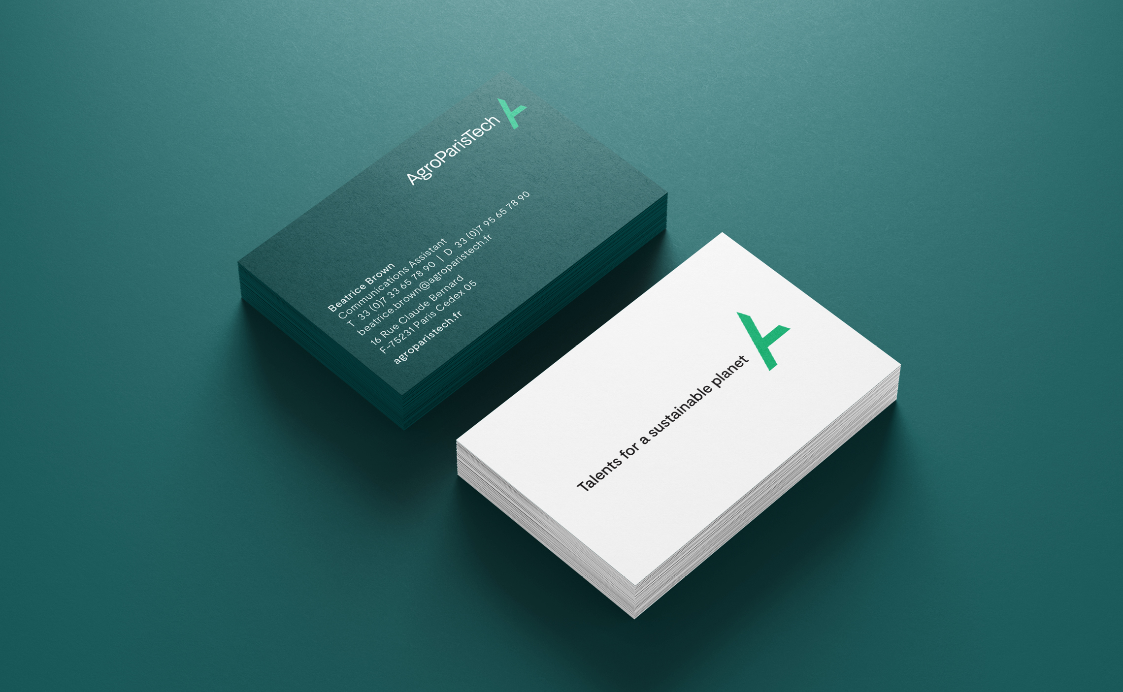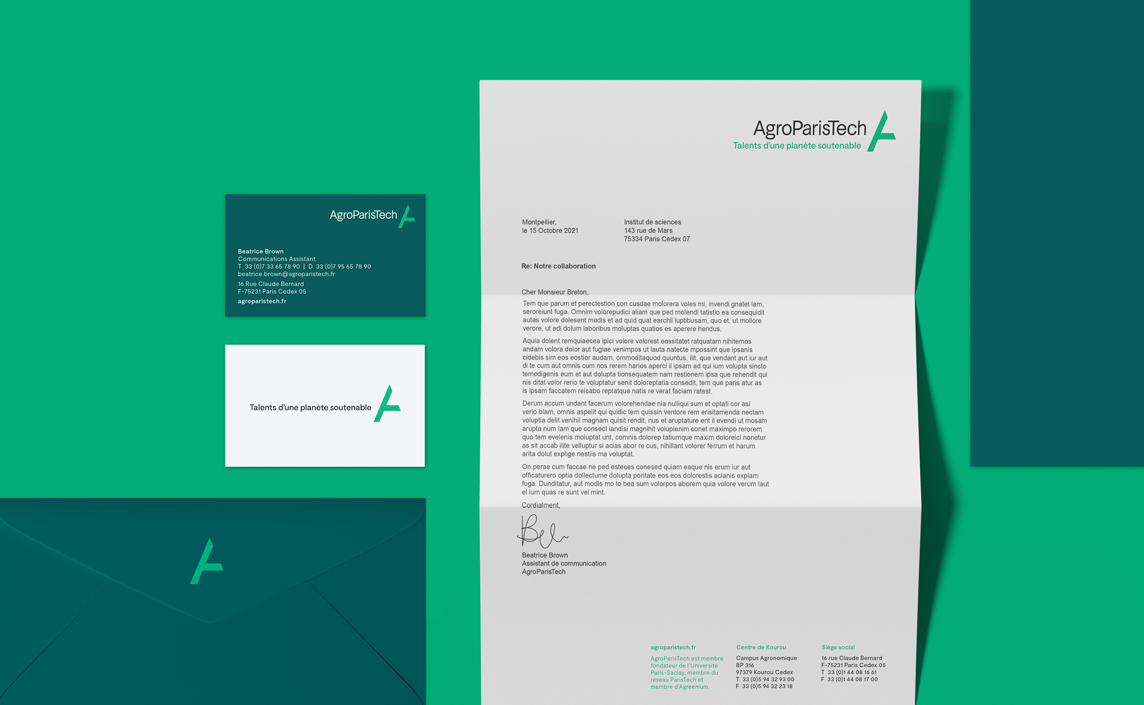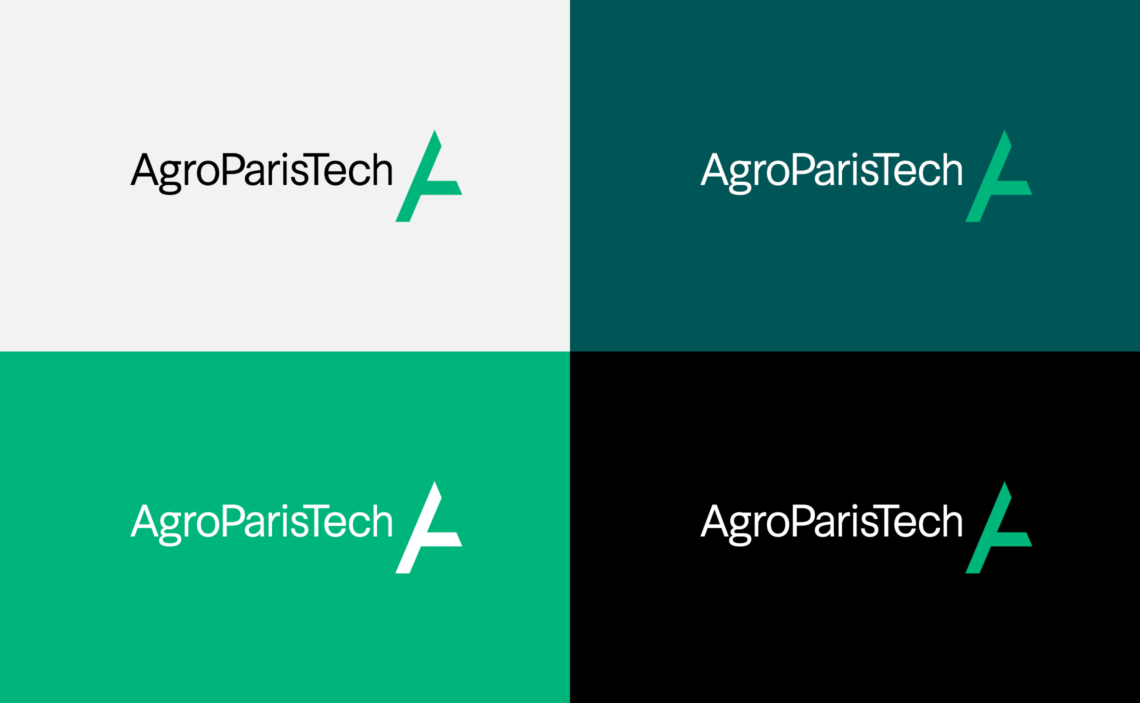 Le bloc typo « AgroParisTech » s’émancipe définitivement de la graphie historique « ParisTech » pour affirmer « AgroParisTech » comme marque. En perdant ses empattements, le lettrage s’actualise aux codes contemporains. Il a été dessiné sur-mesure pour assurer un confort de lecture maximale, ainsi que pour optimiser la longueur de l’ensemble. La couleur AgroParisTech s’illumine avec un nouveau vert plus vibrant et rayonnant. Synonyme d’une vision résolument optimiste du futur, le vert Pantone 3504C se distingue des autres verts utilisés chez ses partenaires.
