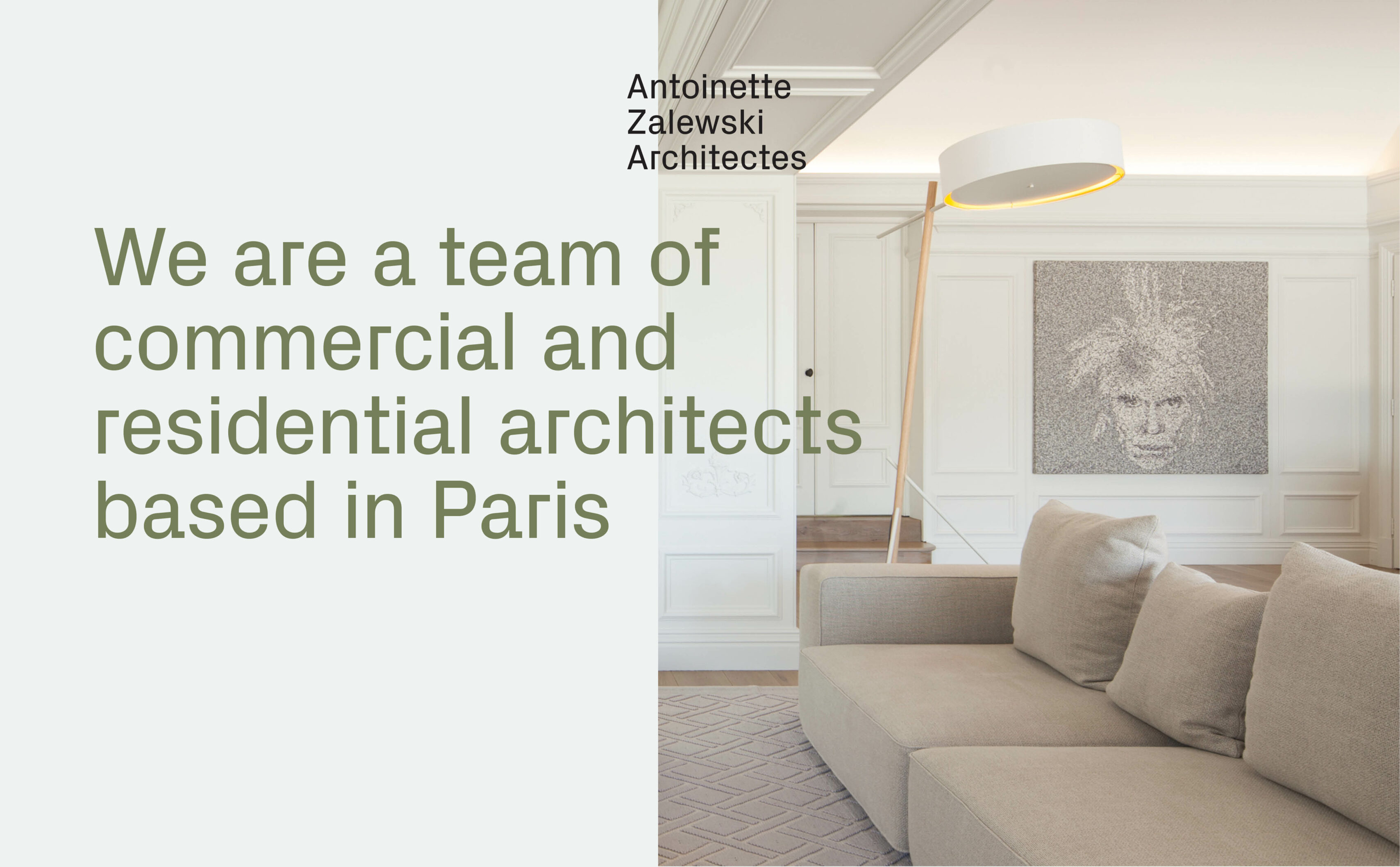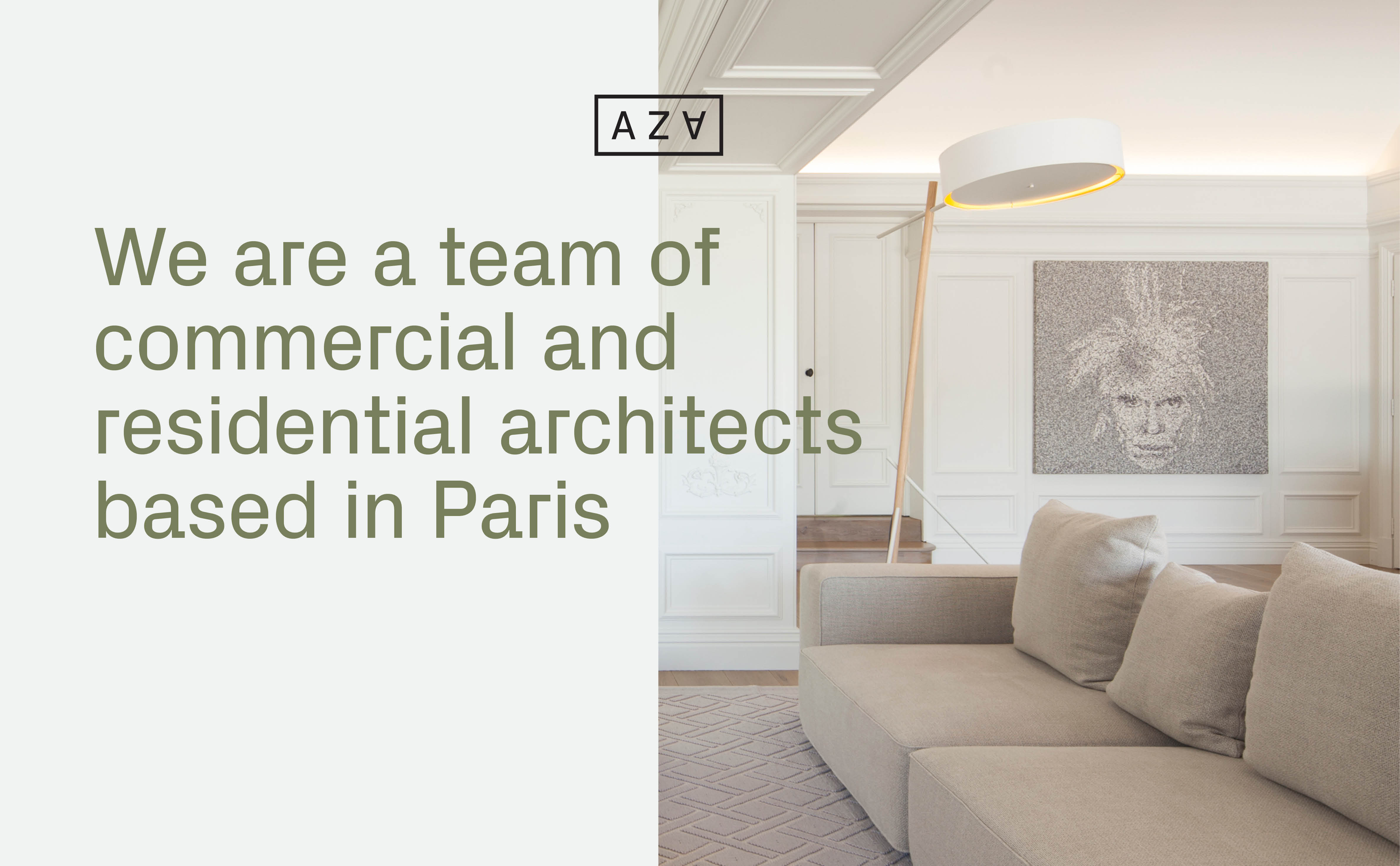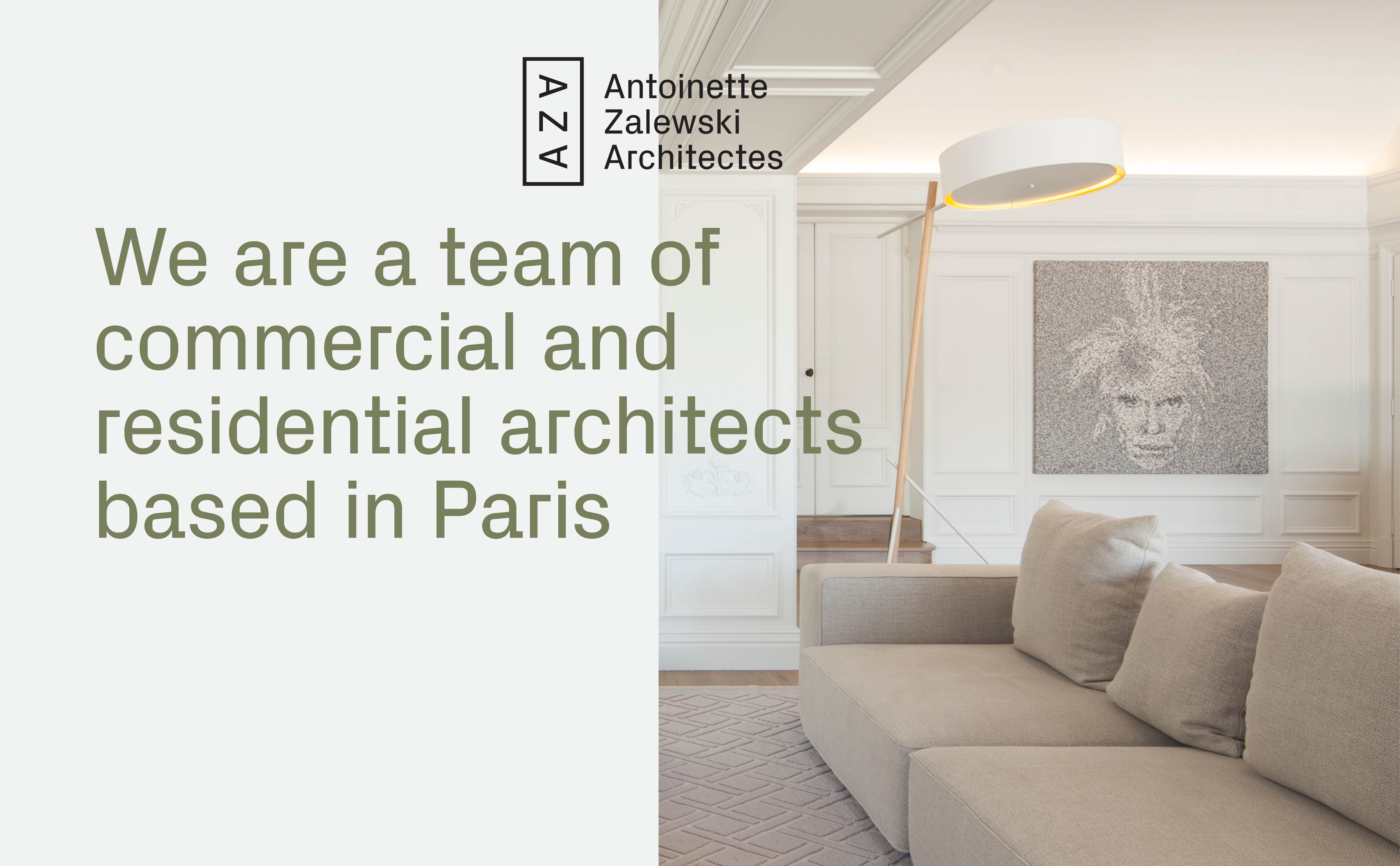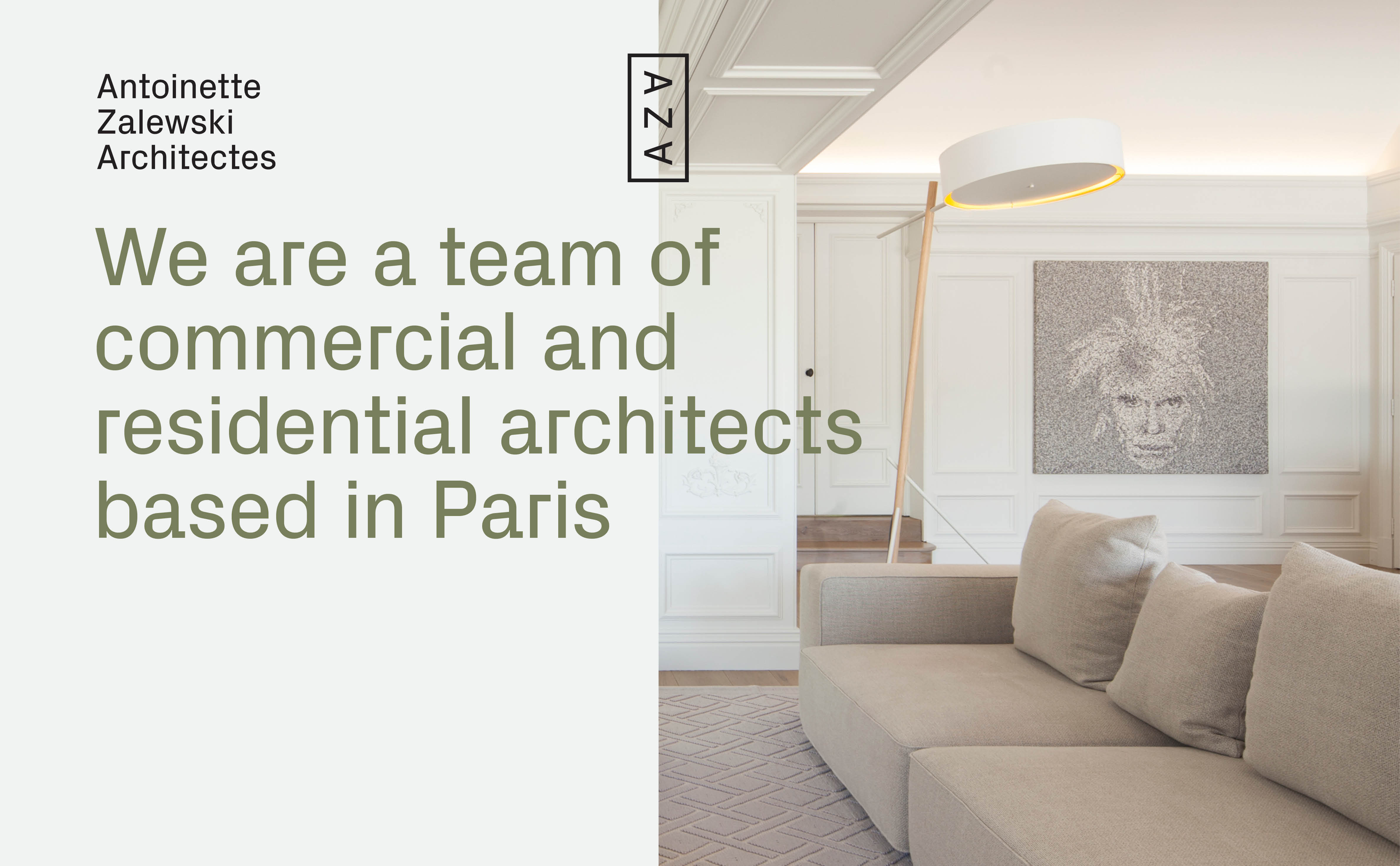 Lorsque nous sommes missionnés, l'agence porte l’acronyme AZ en référence à sa fondatrice, Antoinette Zalewski. Un premier audit, nous a amené a suggéré une évolution de son nom : AZA pour Antoinette Zalewski Architectes. La mention « Architectes » reflète l’ambition et la croissance de l'agence désormais portée par une dizaine de collaborateurs.