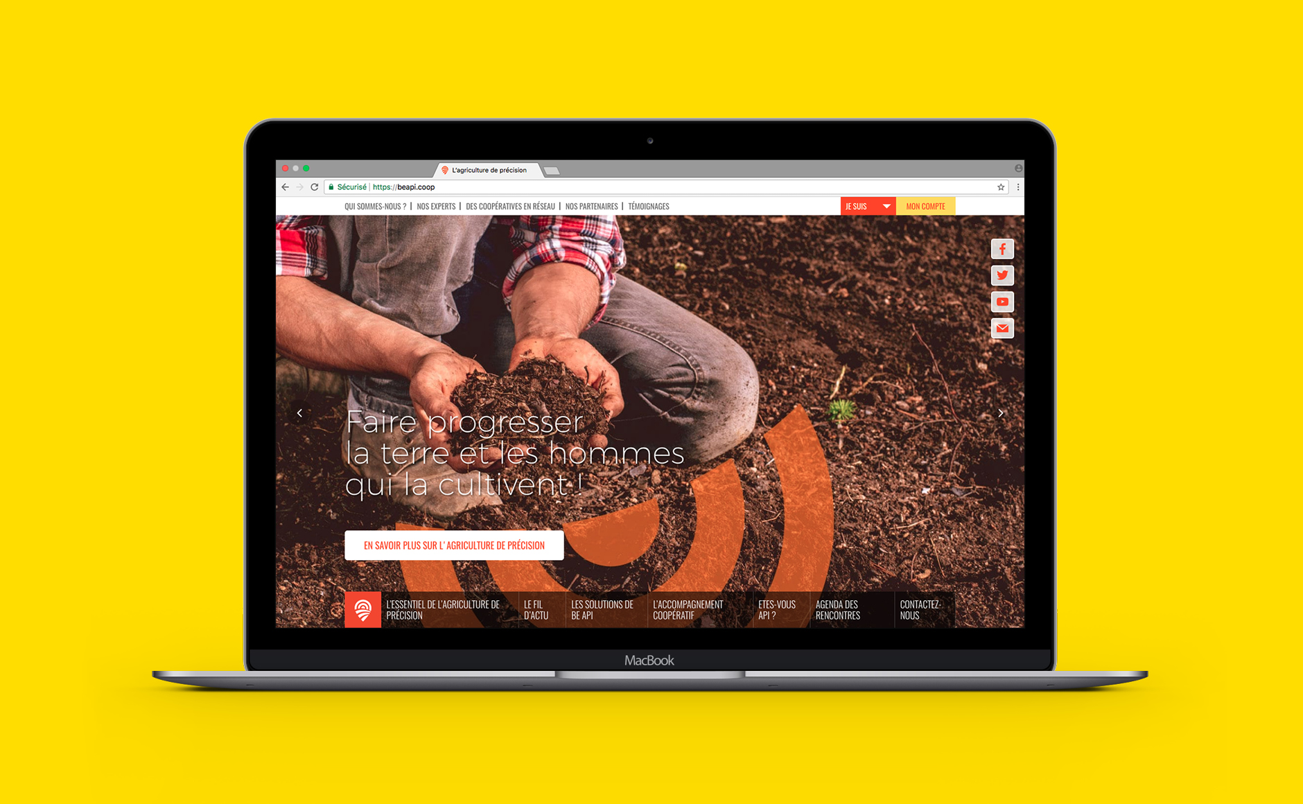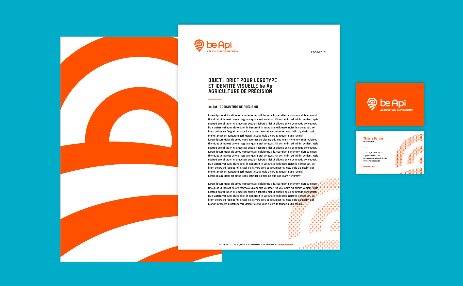 L’objectif de l’identité visuelle était de développer la notoriété de la marque Be Api pour fédérer le plus grand nombre d’agriculteurs. Notre proposition s’est donc concentrée sur la création d’un signe qui a pour vocation de symboliser le concept d’agriculture de précision en faisant la synthèse de ses enjeux technologiques, économiques et environnementaux. Le logotype de Be Api est le symbole d’une agriculture à la fois innovante et respectueuse de la terre et des hommes qui la cultivent.