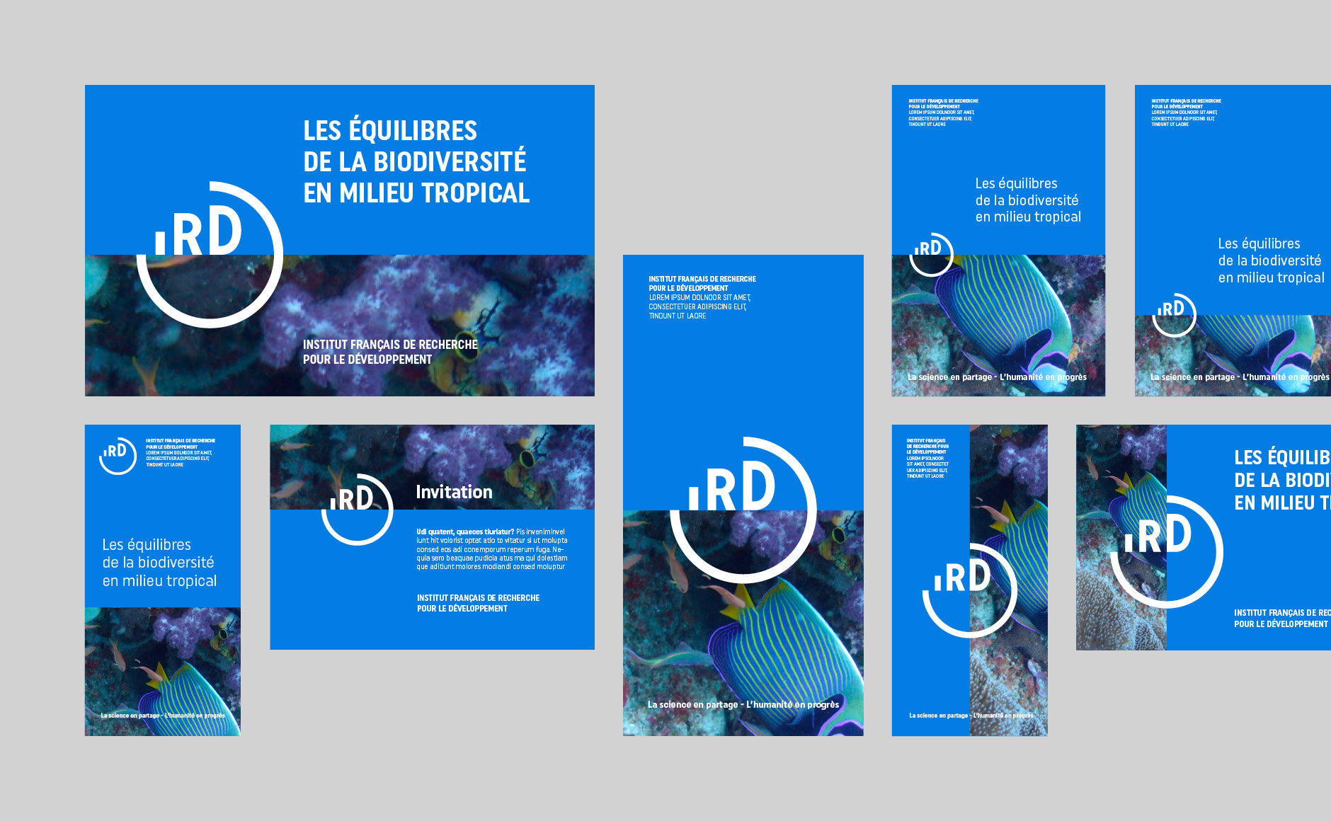 Ensuite, dans la charte graphique, le logo vient se positionner à la frontière du nord et du sud, illustrant l’idée de “science en partage”, et permettant de valoriser l'incroyable fond iconographique dont dispose l'IRD.