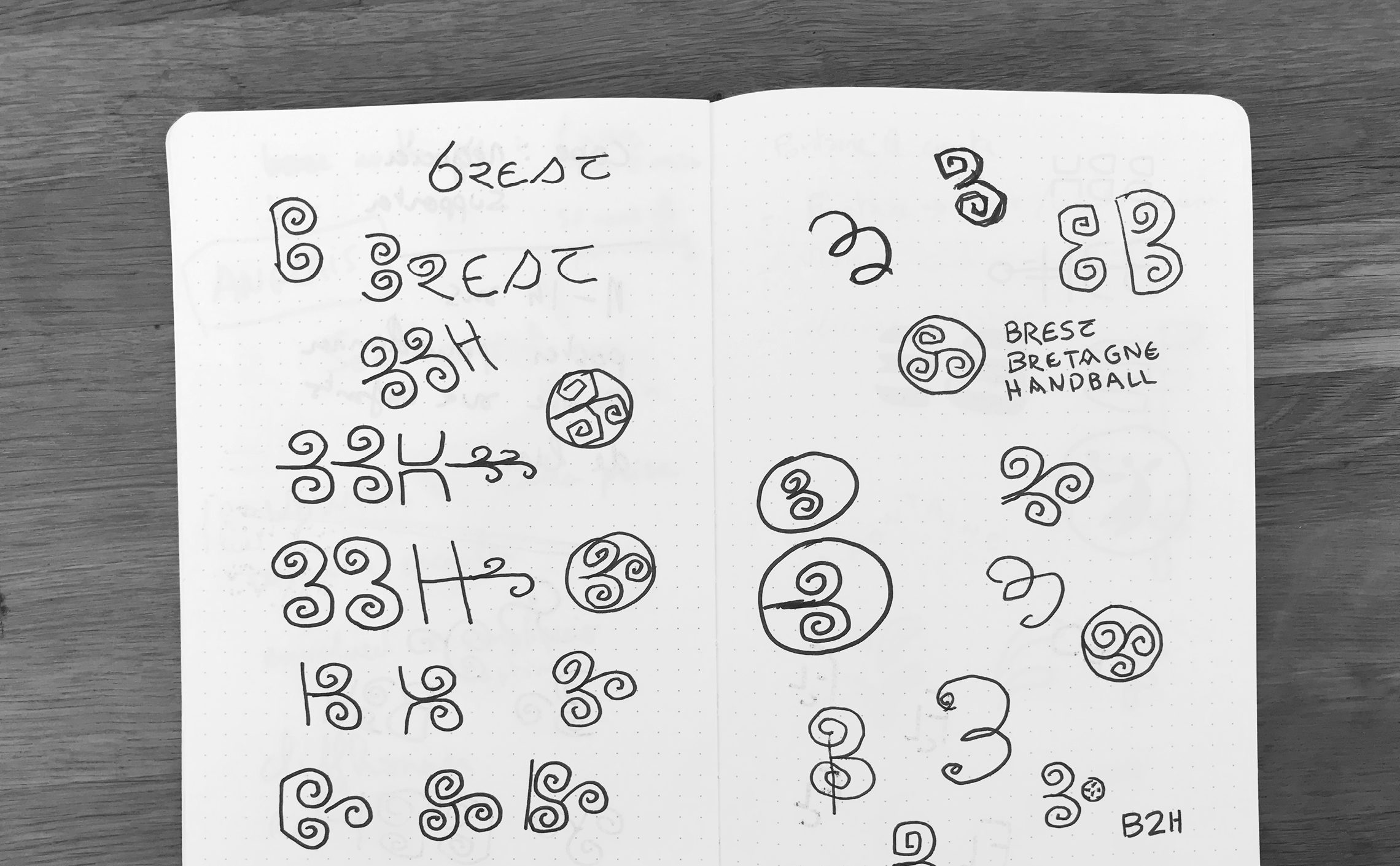 Nous avons donc mixé les rayures du drapeau et la forme du triskèle avec la sphère d'une balle de Handball. En résulte une relecture contemporaine de symboles ancestraux. Le tout est composé dans une silhouette de blason renvoyant à l'esprit conquérant du club.