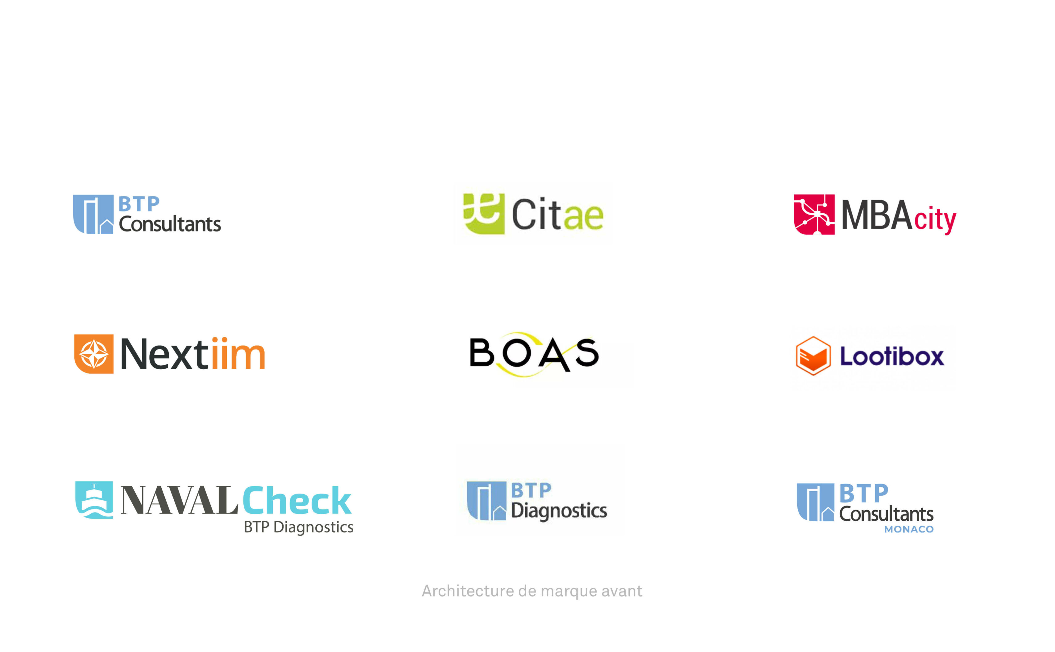 L’identité visuelle en place manquait de cohérence, d’harmonie et de lisibilité. Le groupe n’était pas formalisé dans l’identité visuelle et les marques filles se composaient d’emblèmes différents. Un emblème pictographique figuratif pour BTP Consultants, une version abstraite pour MBAcity et un jeu de ligature typographique pour Citae. Les blocs typographiques manquaient, eux aussi, de cohérence.