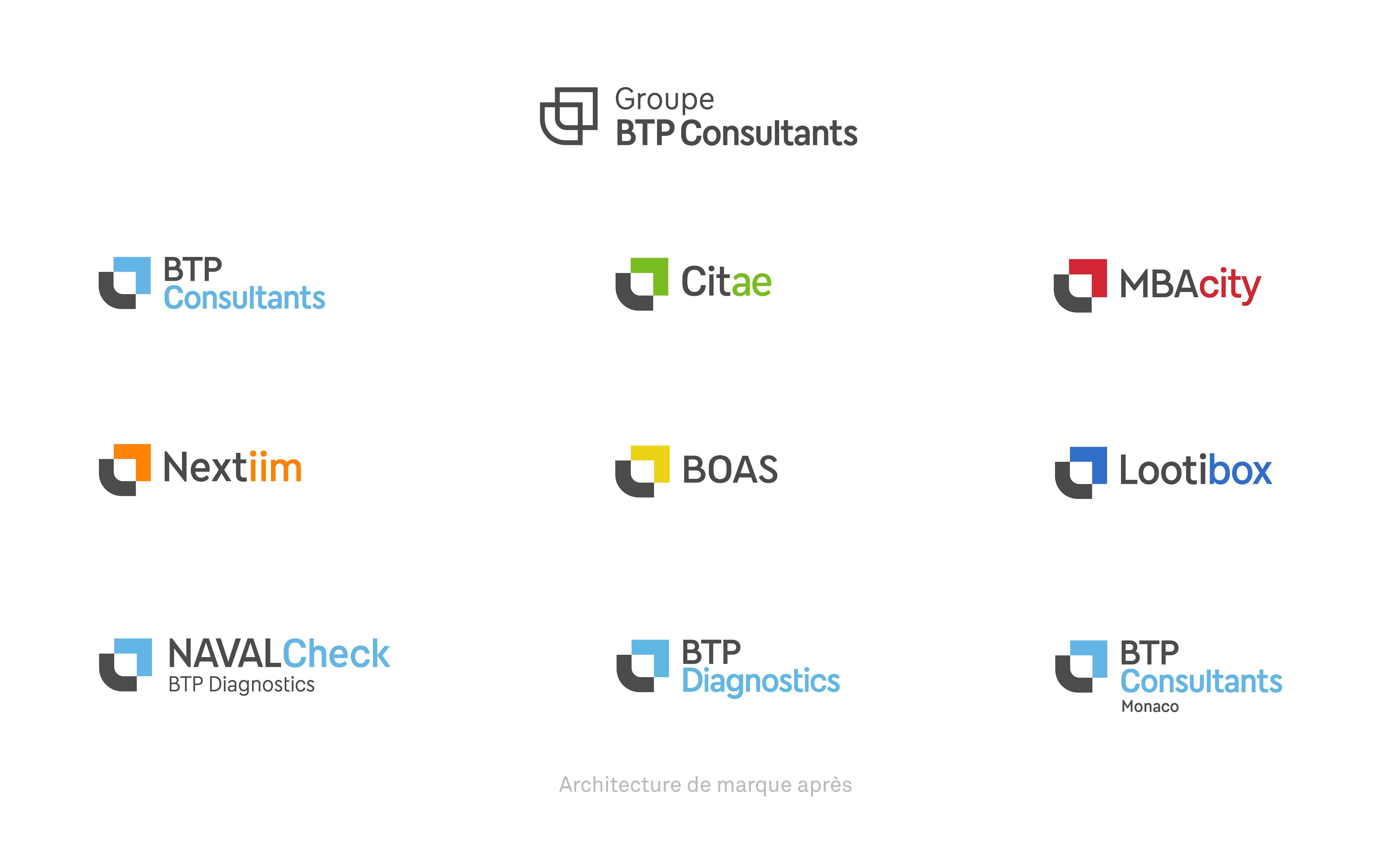 Le groupe BTP Consultants est un acteur de la transformation des secteurs de l’immobilier et de la construction. Suite à l'acquisition successive de différentes filiales, le groupe a souhaité repenser son image de marque et améliorer la lisibilité de son architecture de marque.