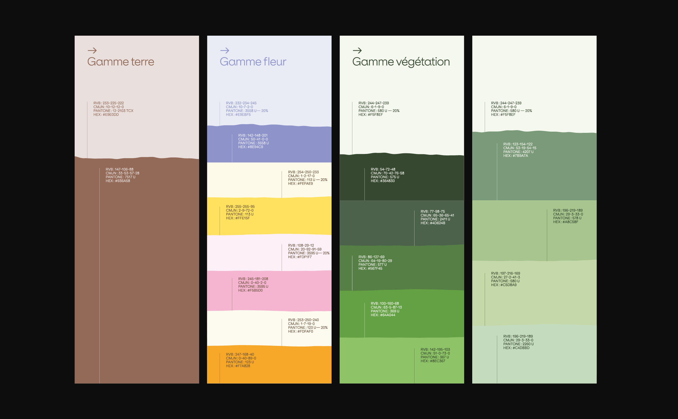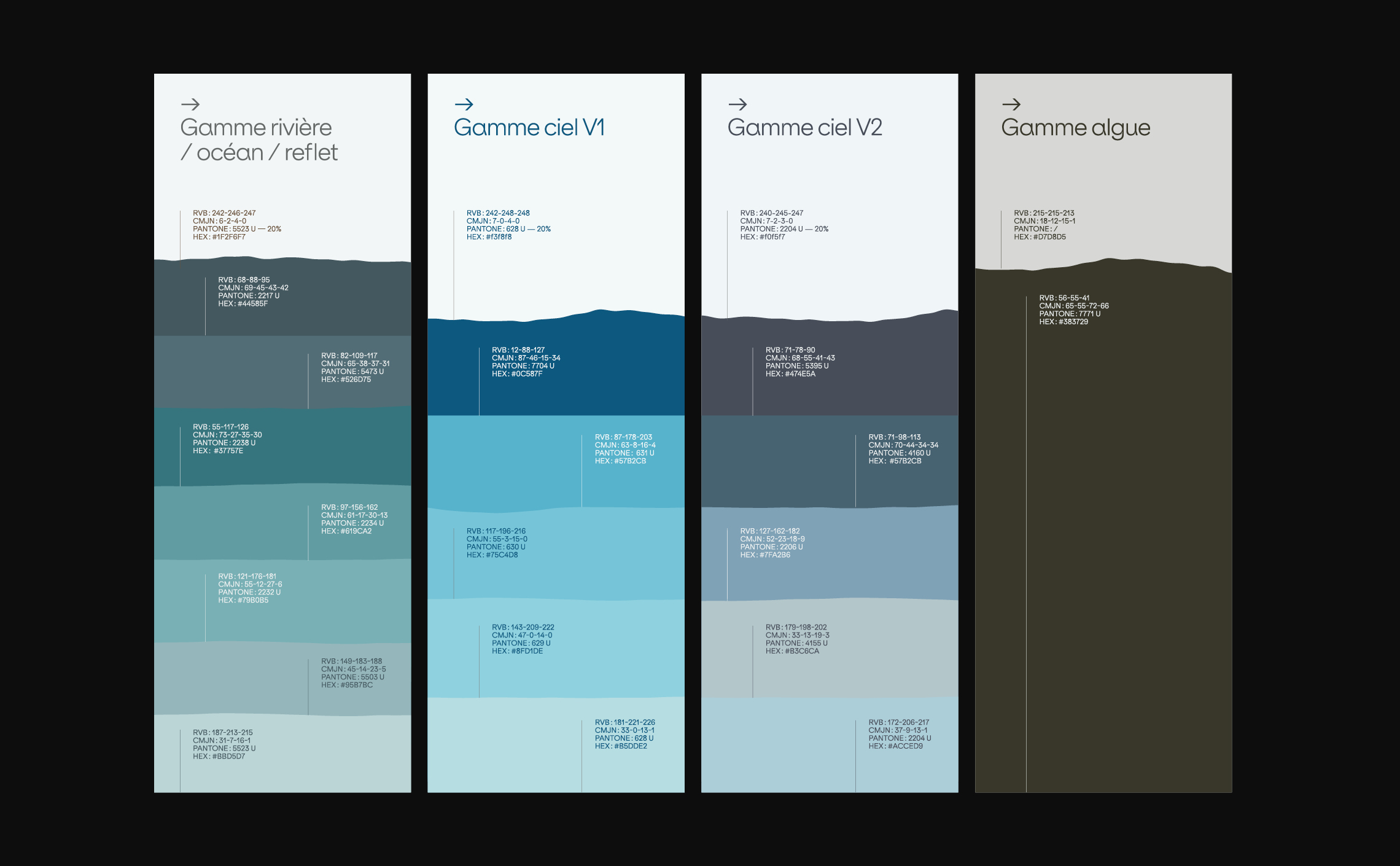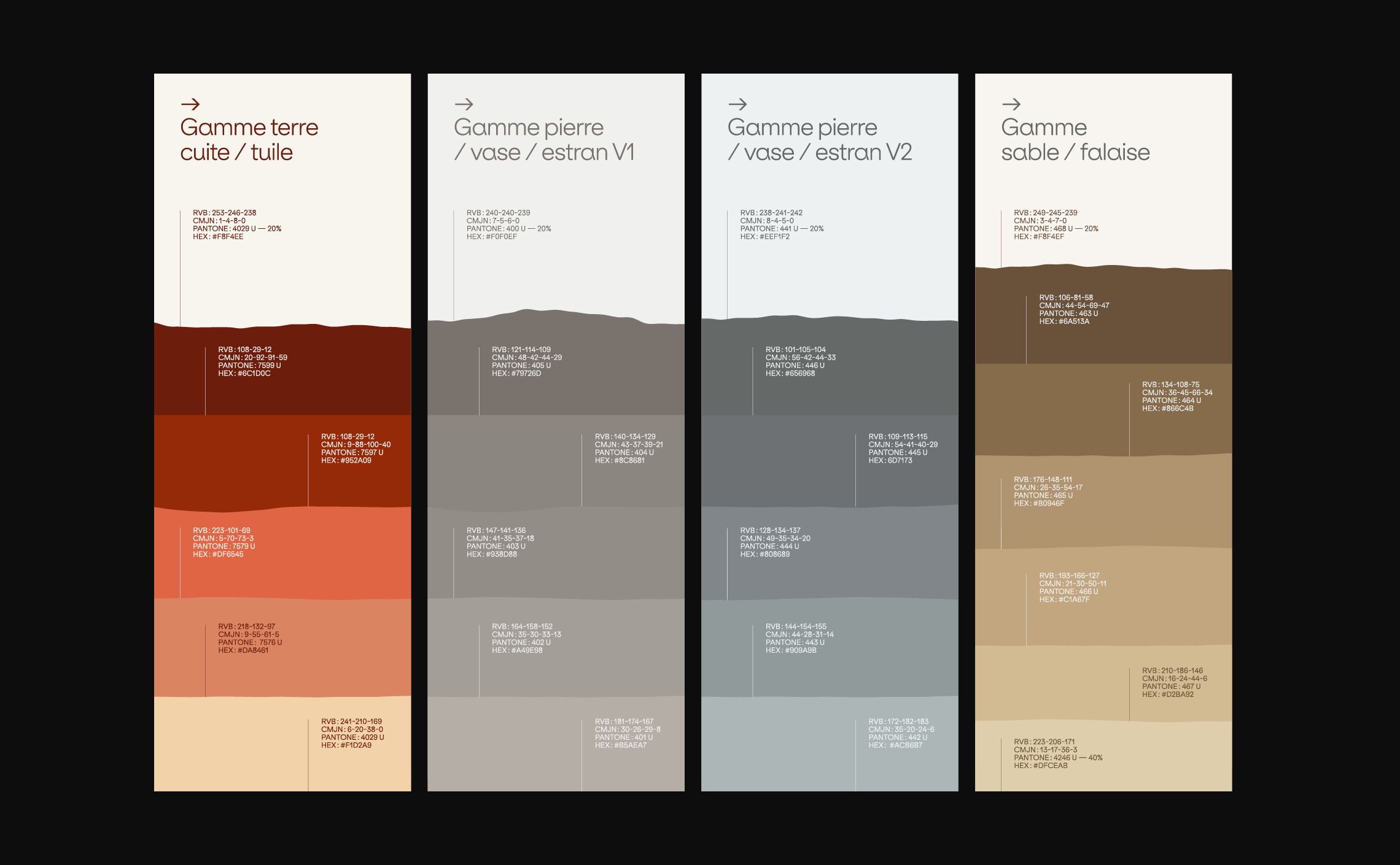 Un territoire est une mosaïque de paysages aux mille nuances. En collaboration avec les équipes du CAUE, nous avons élaboré une palette de couleurs reflétant l'essence unique de la Charente-Maritime. Les verts vibrants de la végétation se marient avec les bleus profonds de l'océan, les teintes sombres de l'estran contrastent avec les couleurs vives des fleurs, le tout rehaussé par des tons chaleureux de brique. Cette palette incarne la diversité et la richesse du territoire, apportant une identité visuelle forte et évocatrice.