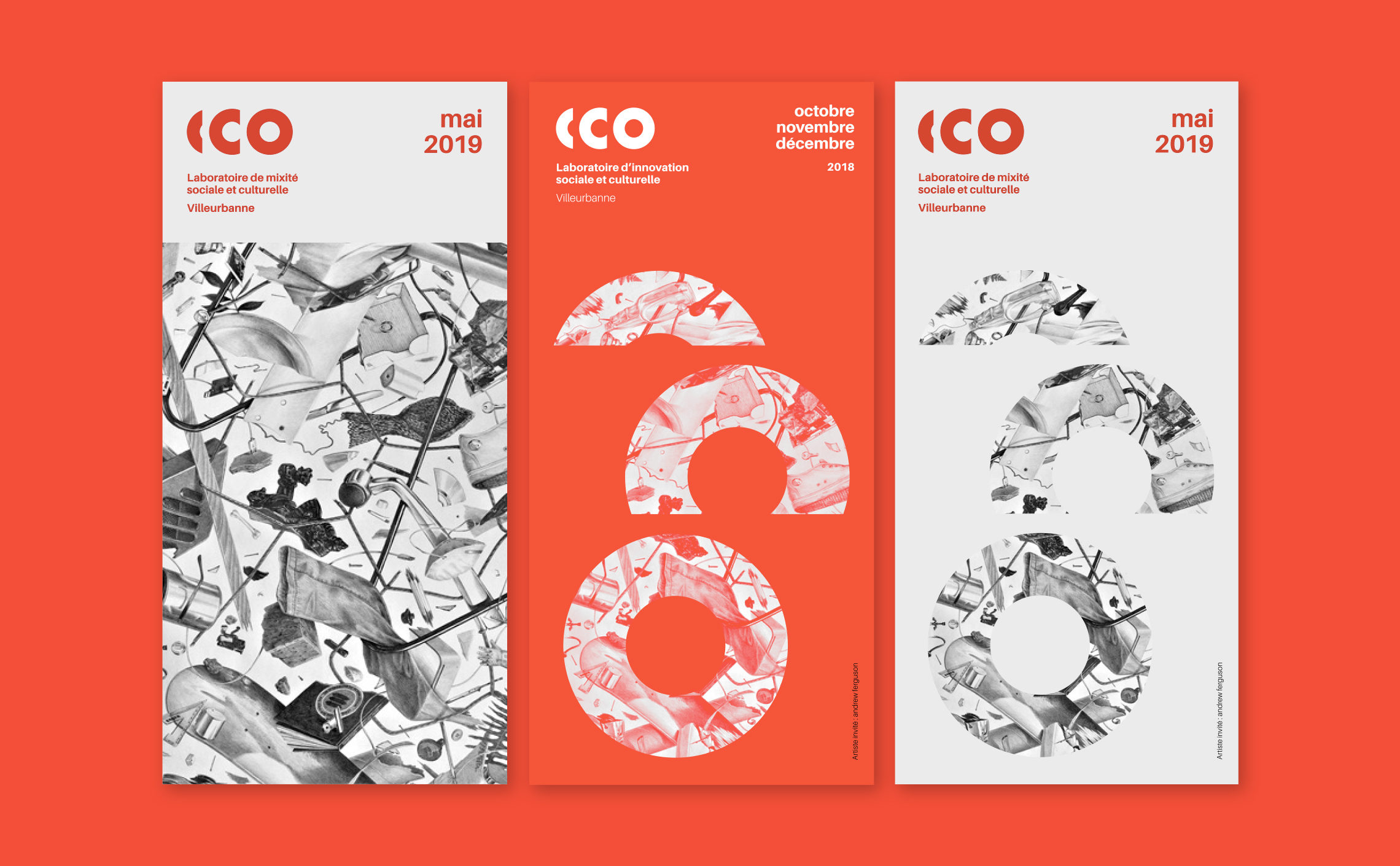 Pour tenter de résoudre le déficit d'impact visuel auquel faisait face le CCO, nous avons mis en place un principe basé sur un signe simple et facilement reconnaissable. Celui-ci joue avec les bases formelles des lettres de l'acronyme pour induire les idées de mouvement, d'émergence et d'évolution. Expériences sociales, art et rencontres sont au cœur du projet de l'institution. Le logo évoque l'acte de création en utilisant une forme géométrique unique comme séquence.