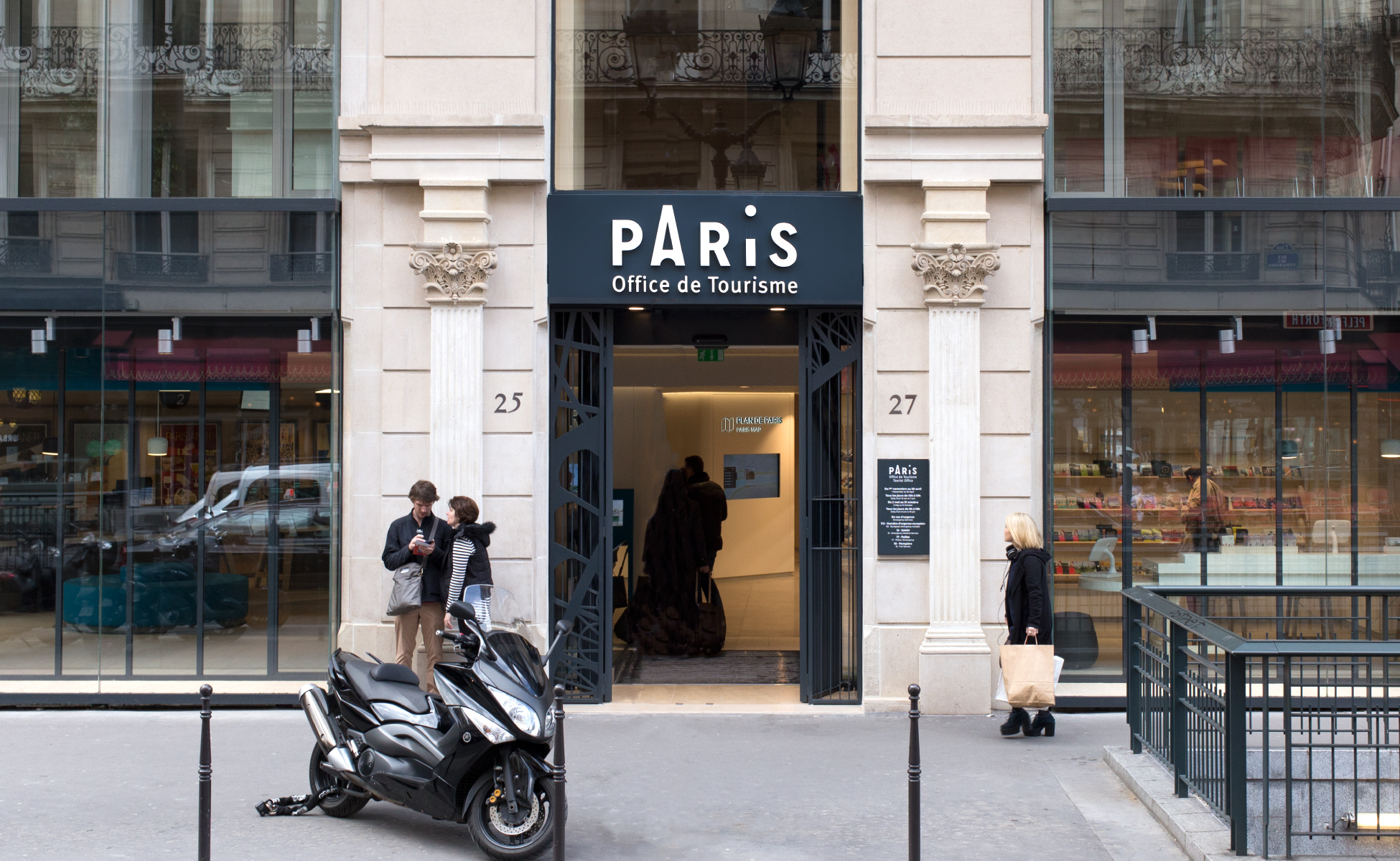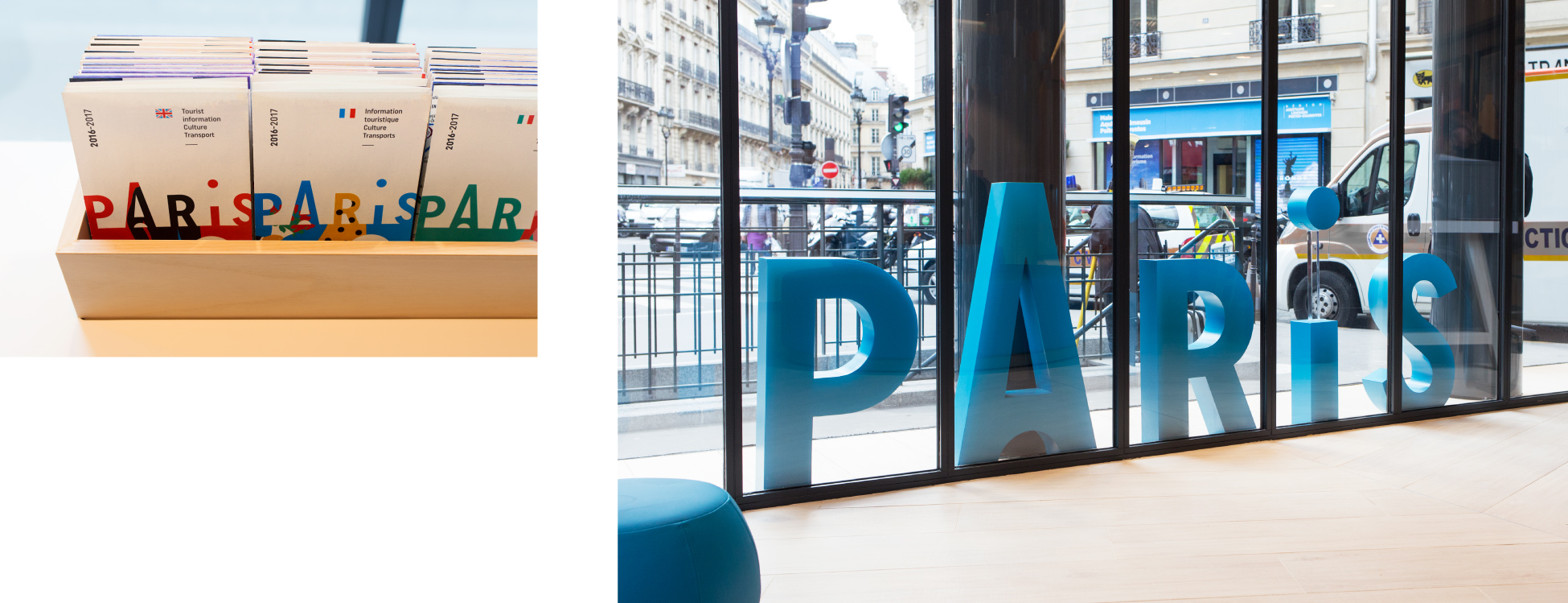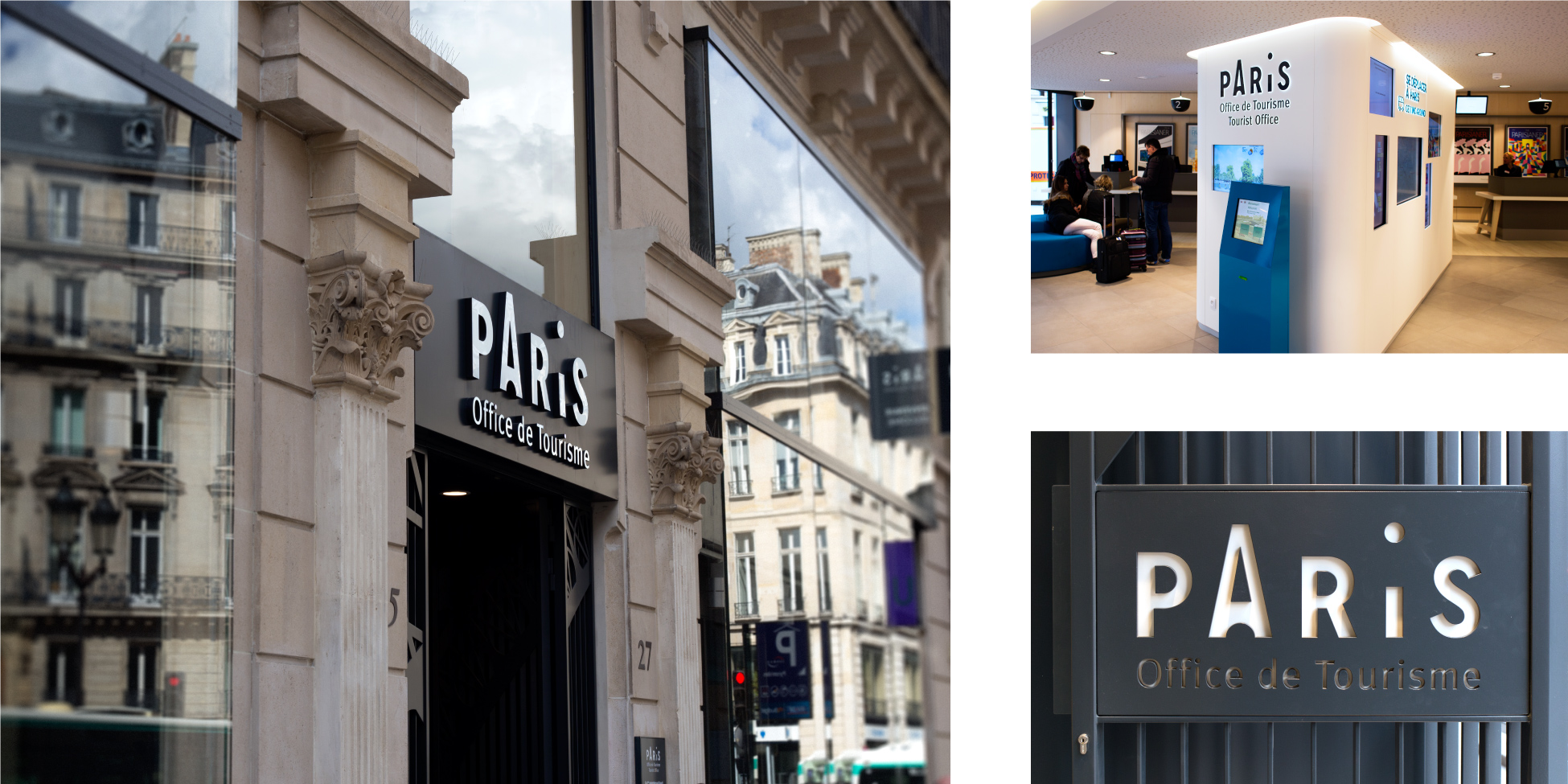 L'Office de Tourisme dispose de 5 points d'accueil. Le principal bureau, situé 25 rue des Pyramides, dans le 1er arrondissement, vient d'être entièrement rénové. Le logotype que nous avons conçu y figure donc logiquement en bonne place.