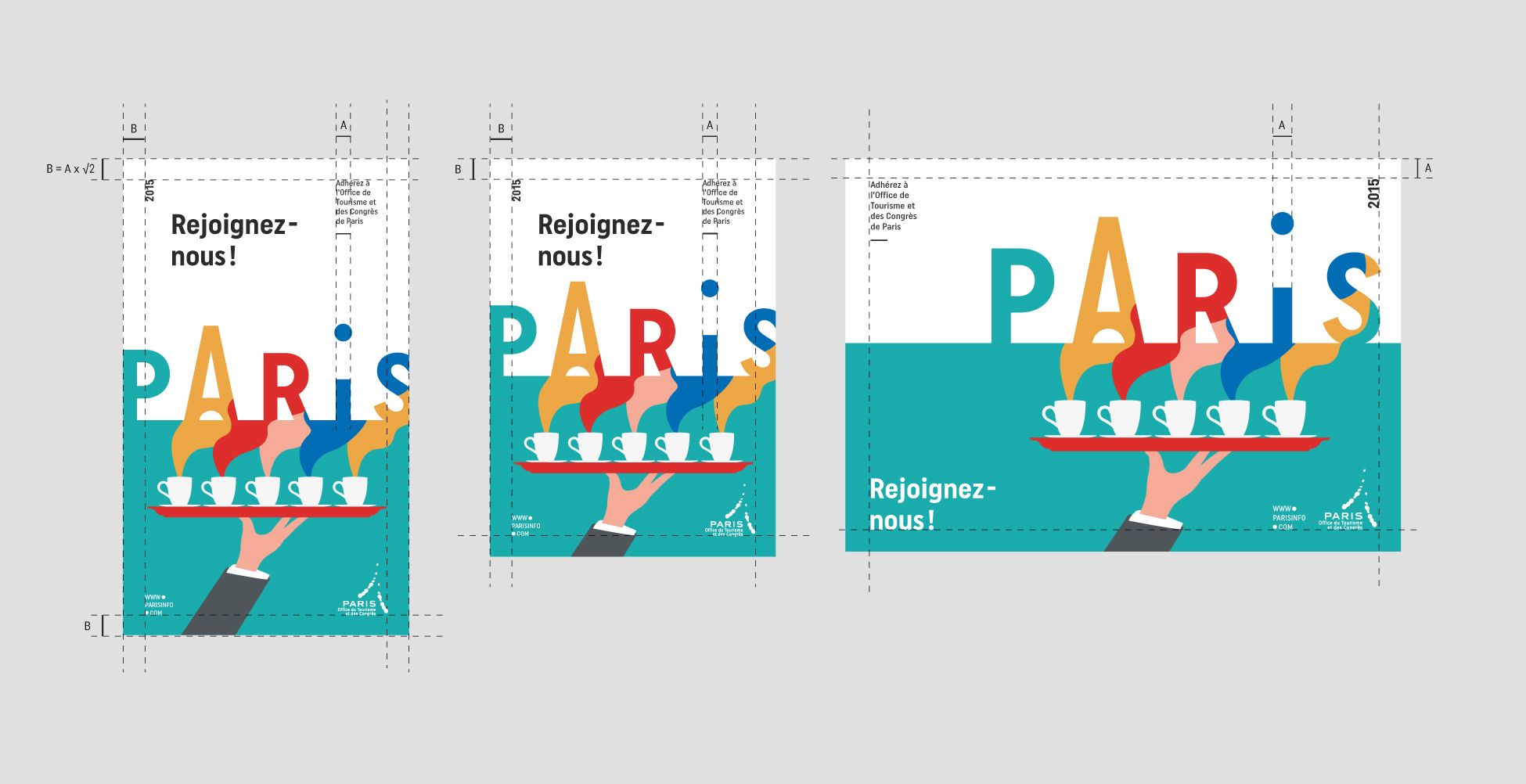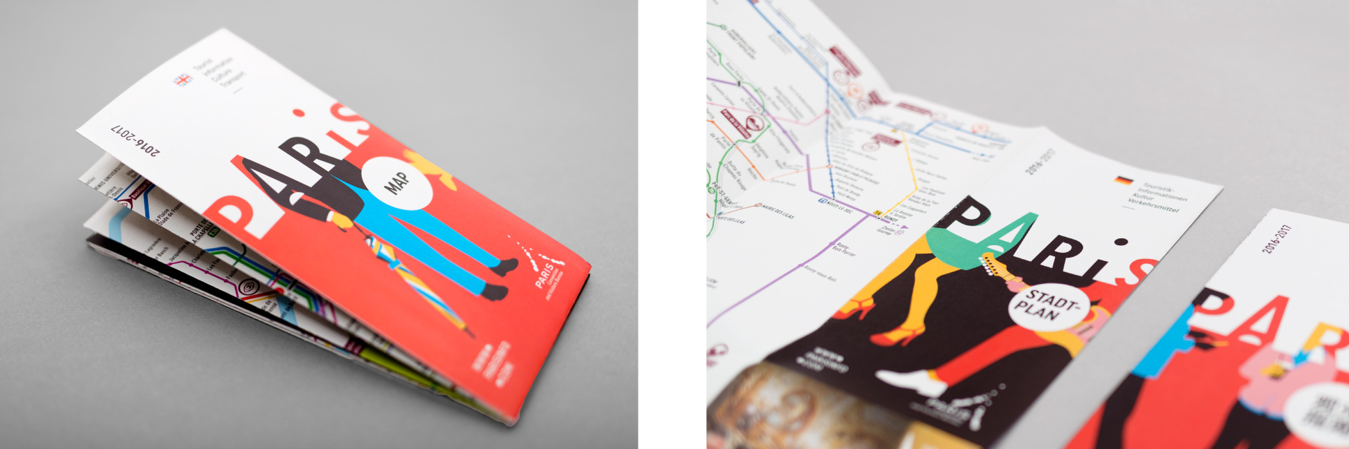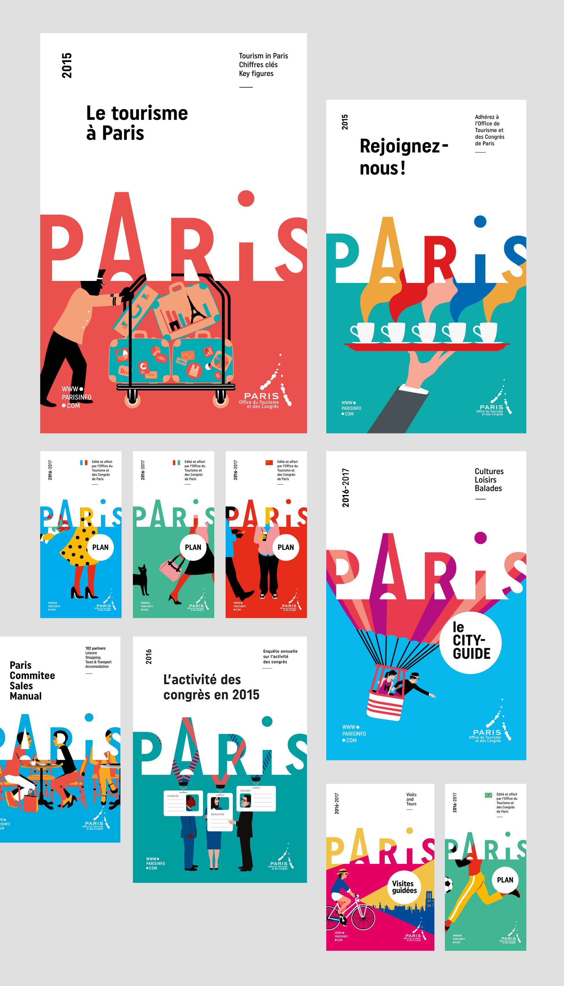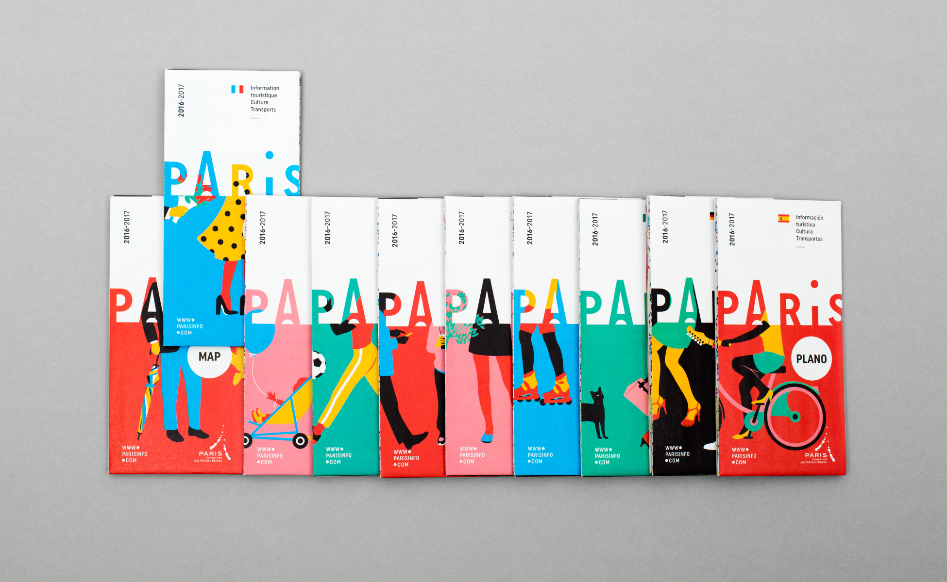 La déclinaison que nous avons proposée raconte sobrement l'idée de déplacement entre plusieurs destinations, d'un point clef à l'autre. L'ensemble permettant de dessiner une carte touristique de Paris.
