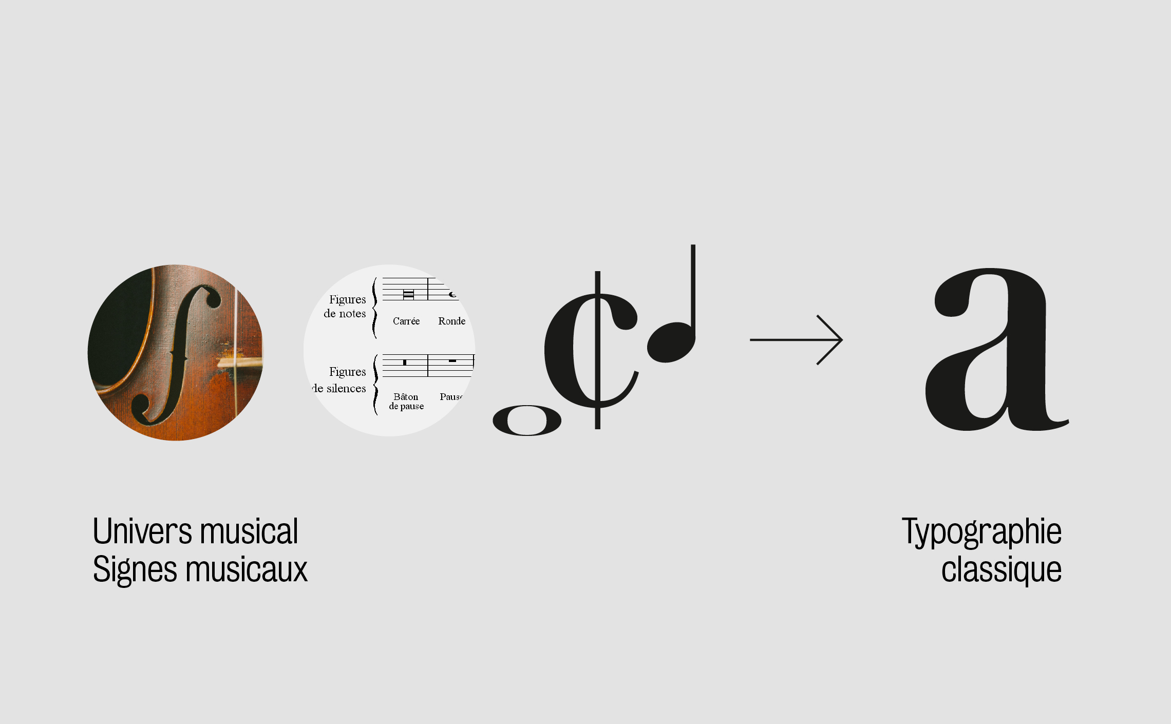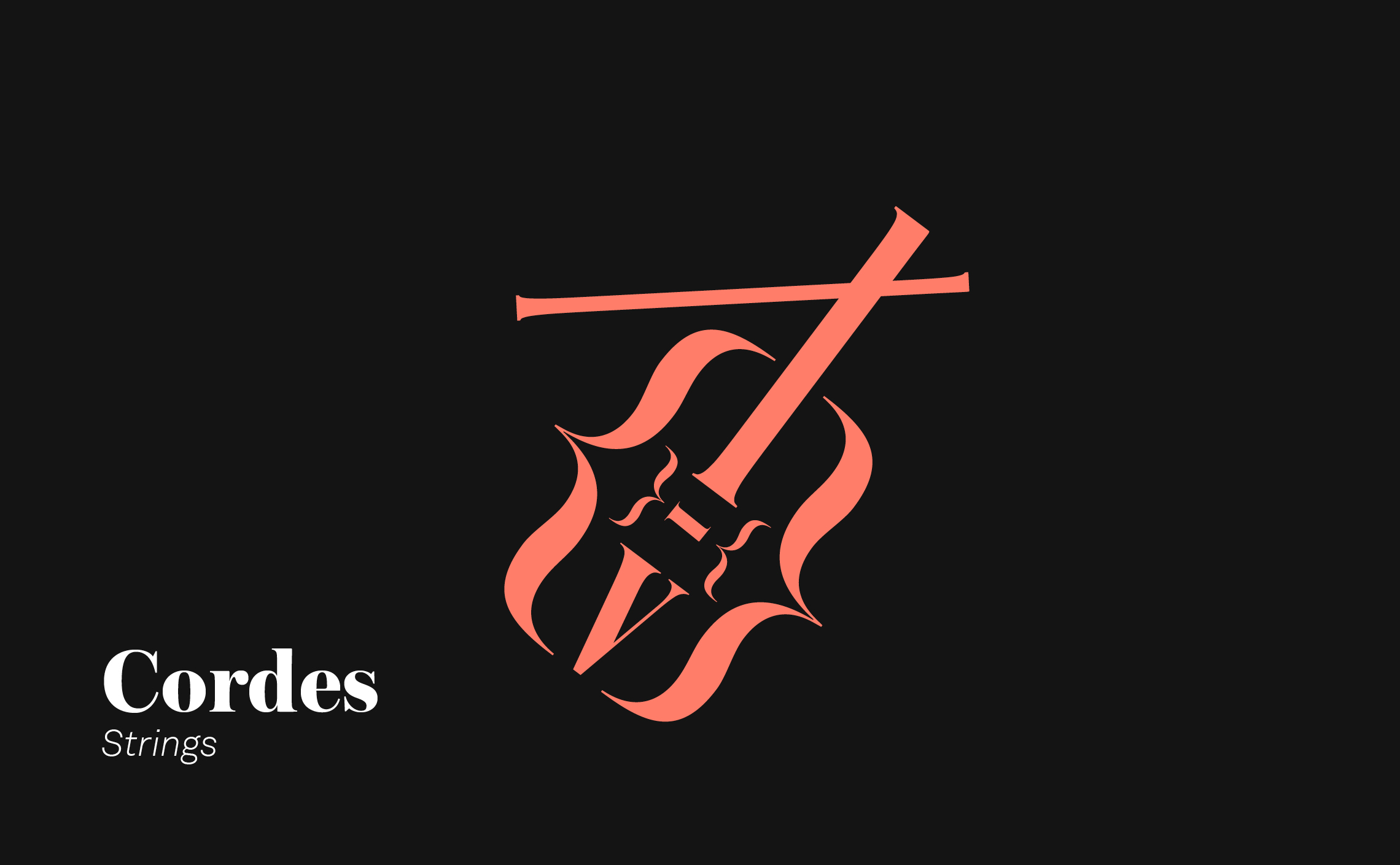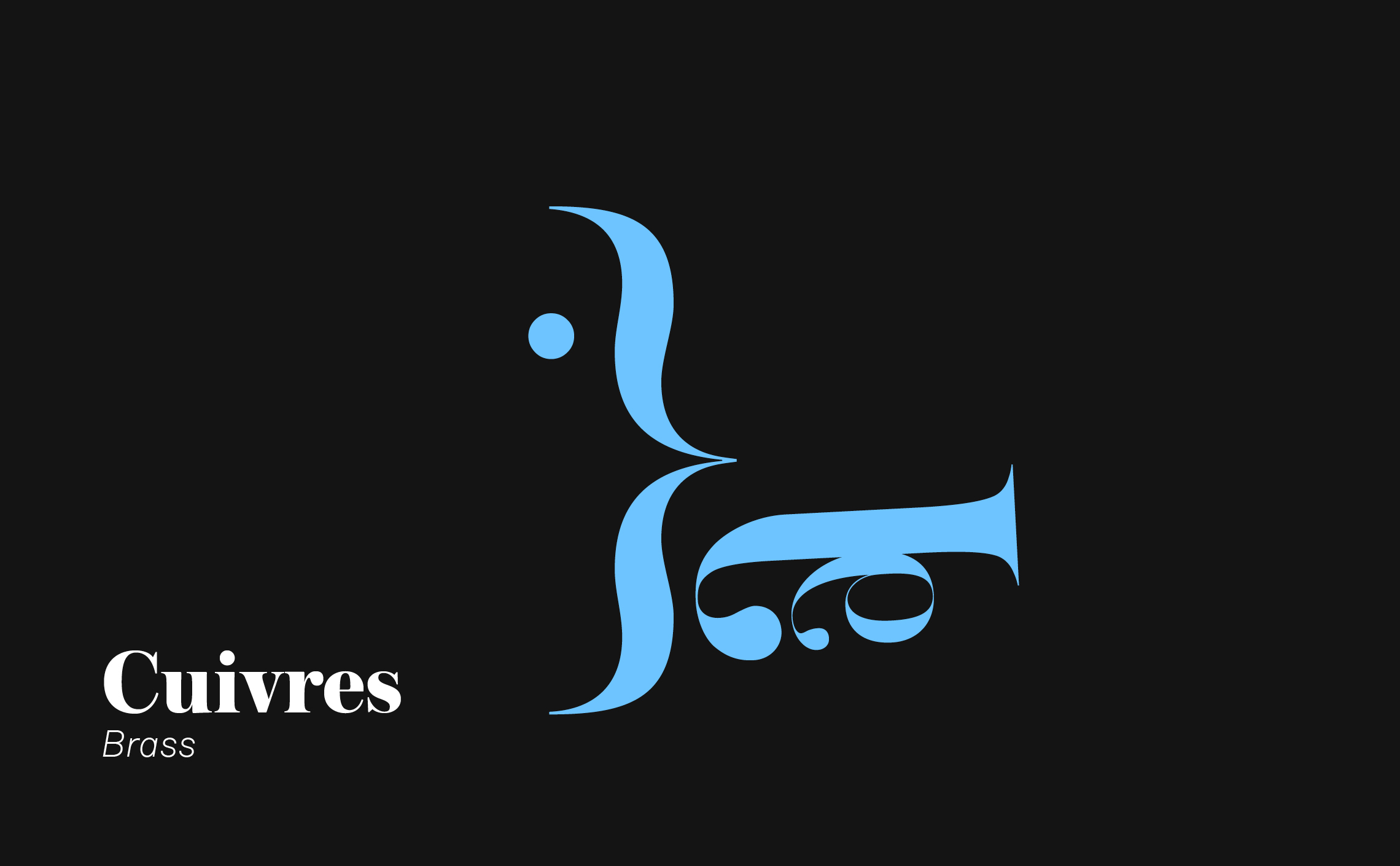 Dans le même esprit que le logo, nous proposons de jouer avec la typographie pour créer un univers visuel musical. Les différentes typologies d'instruments prennent vie sous la forme de compositions typographiques. Jeux de mouvements et de décalages apportent un effet frais et ludique, tout en venant désacraliser l'image de la musique classique.