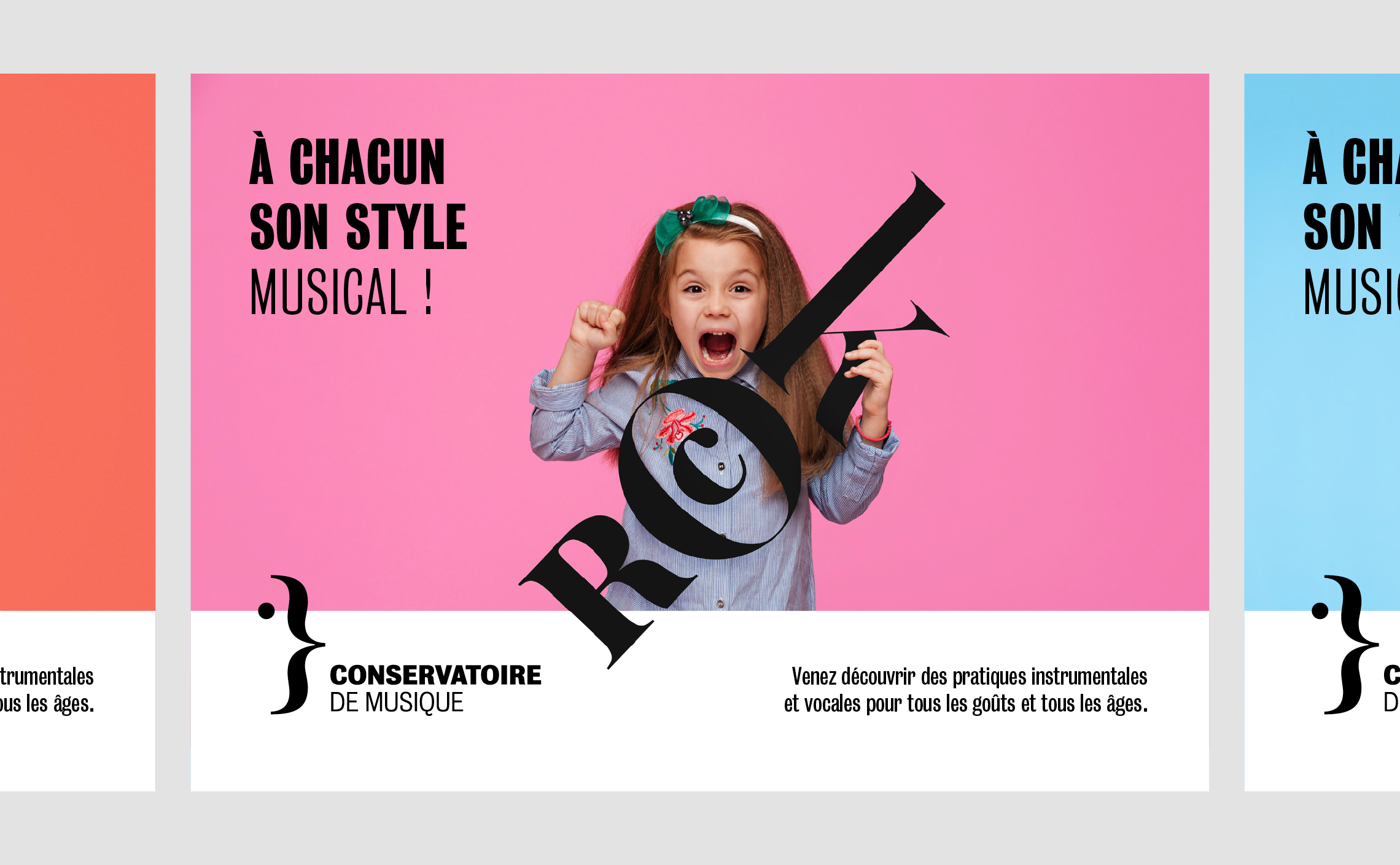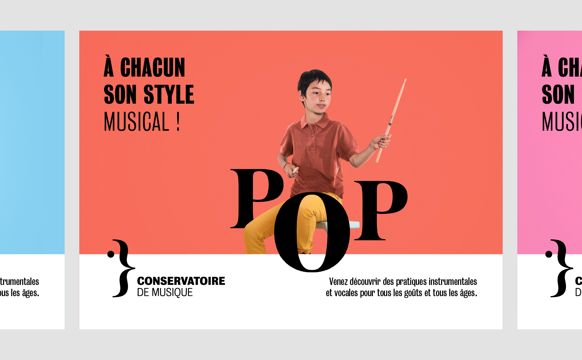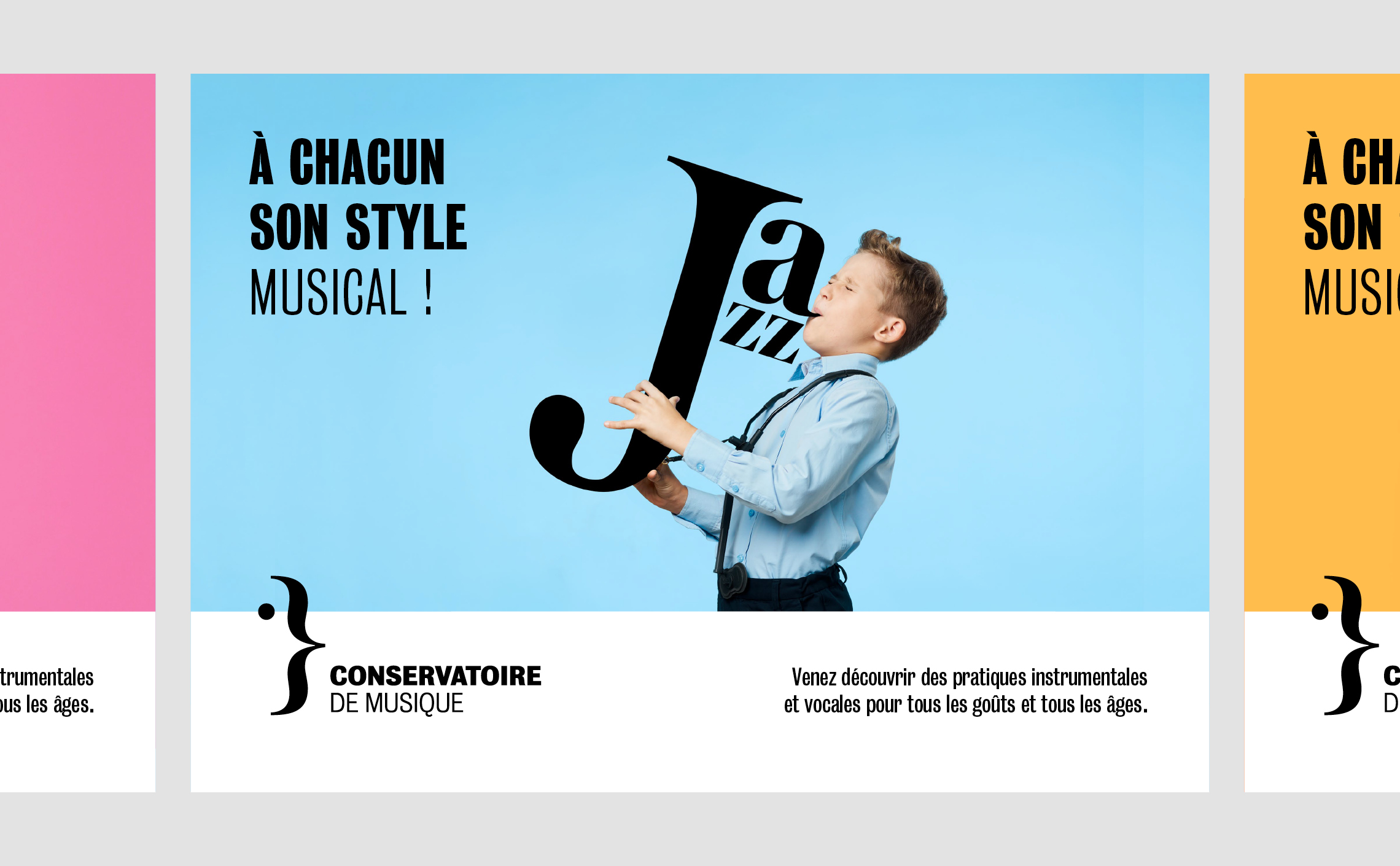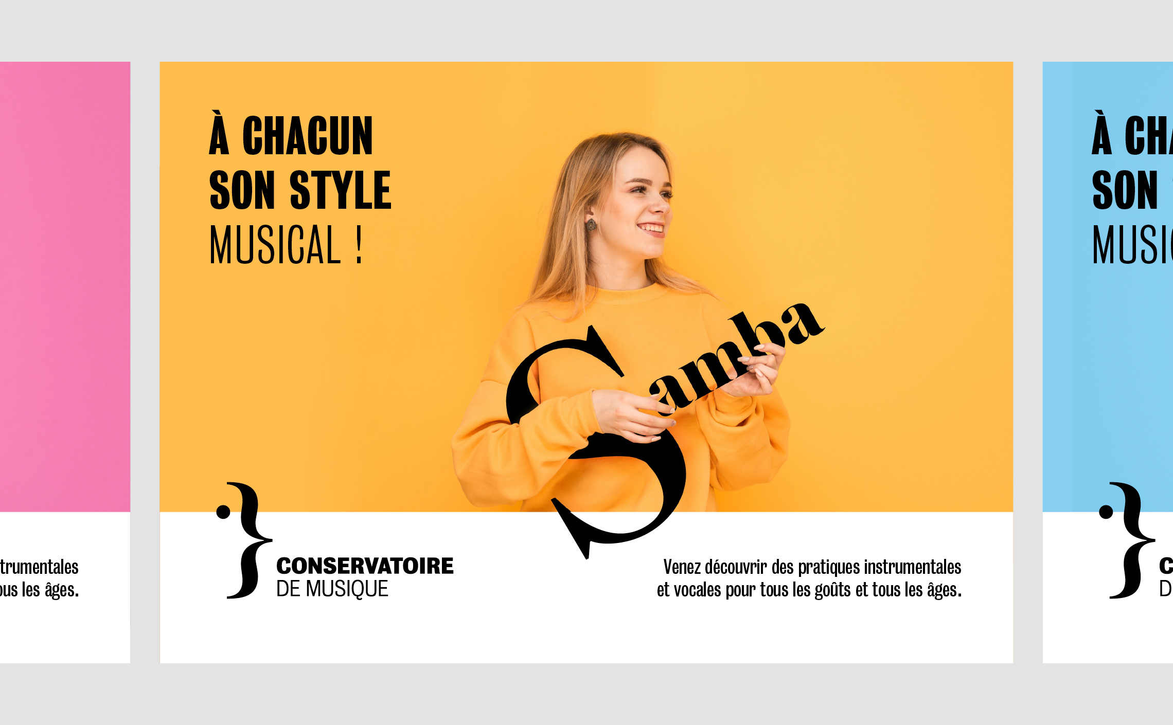 À chacun son style musical ! Pour accompagner la communication, nous avons conçu une famille de visuels illustrant l'éclectisme musical. Il s'agissait en premier lieu de lutter contre l'idée qu'un conservatoire n'enseigne que la musique classique. Samba, Rock, pop, jazz... toutes les esthétiques musicales ont leur place.