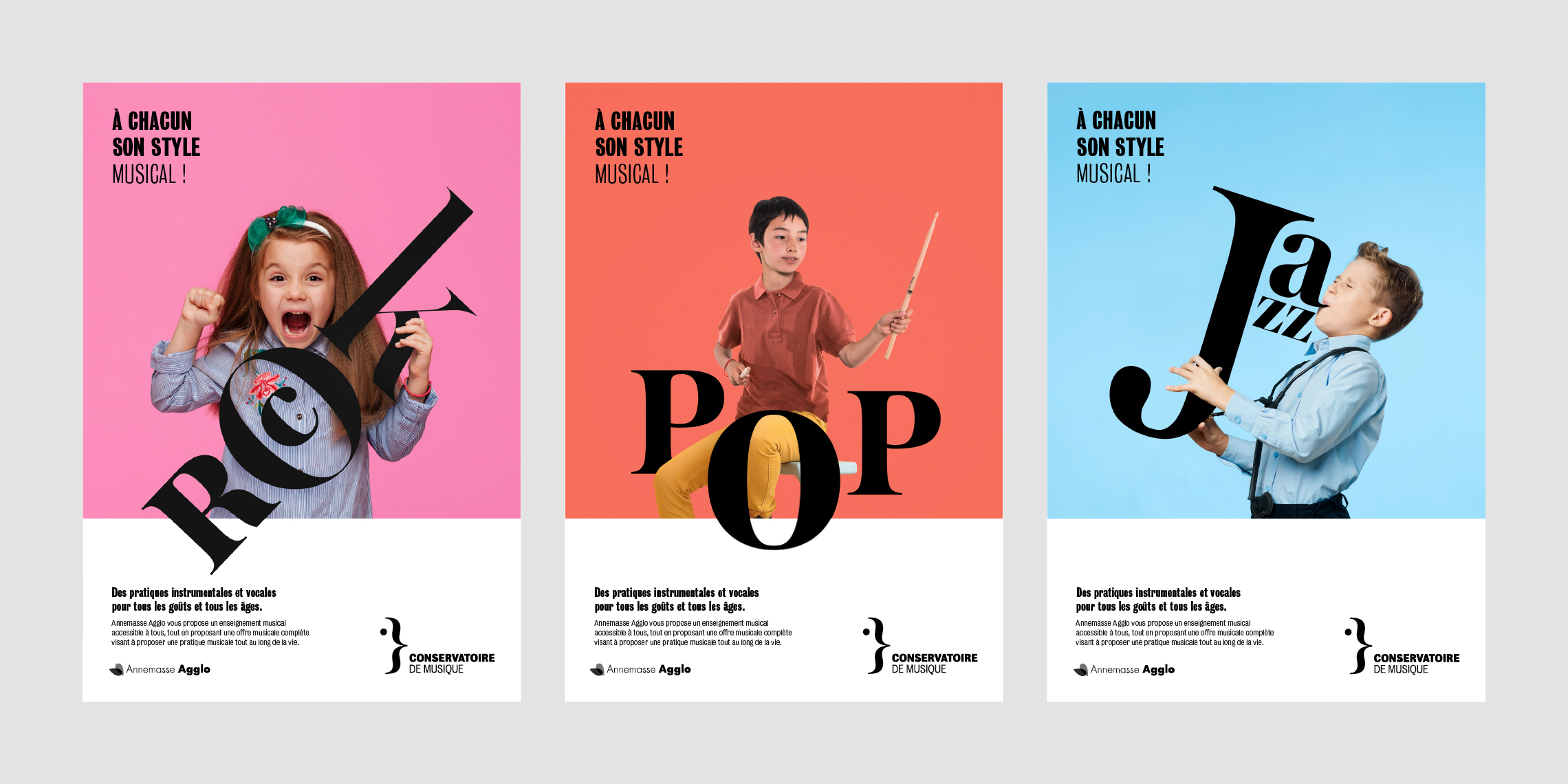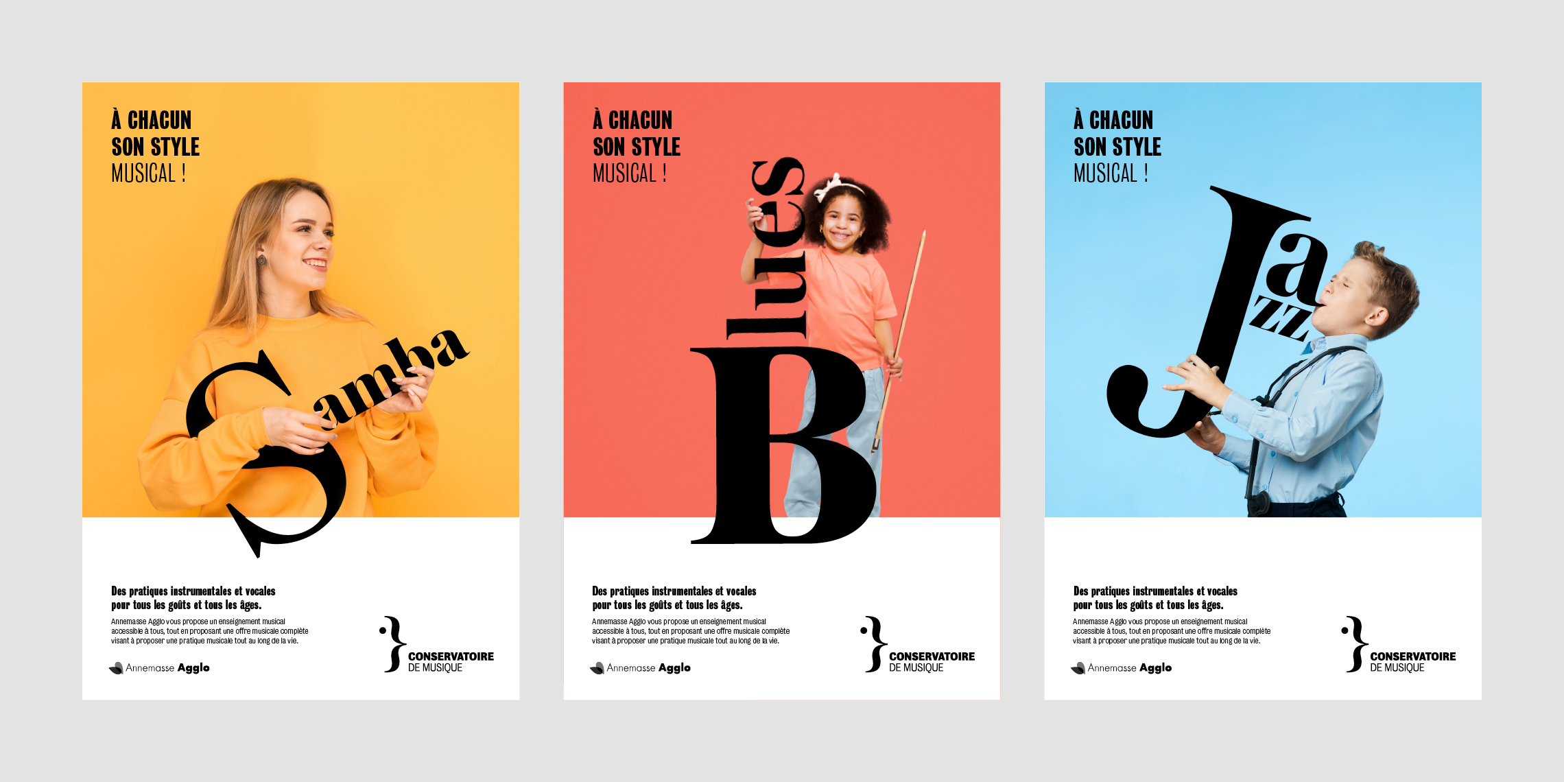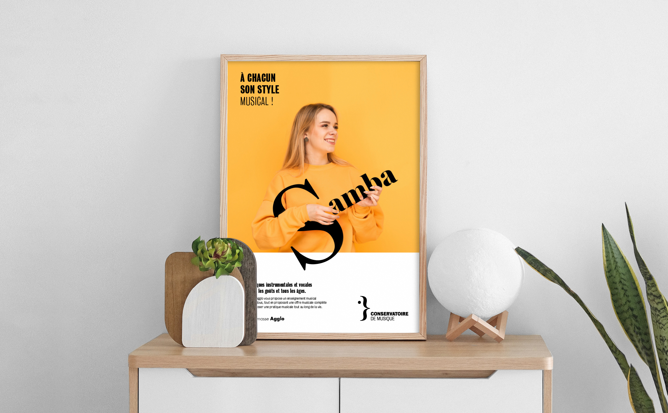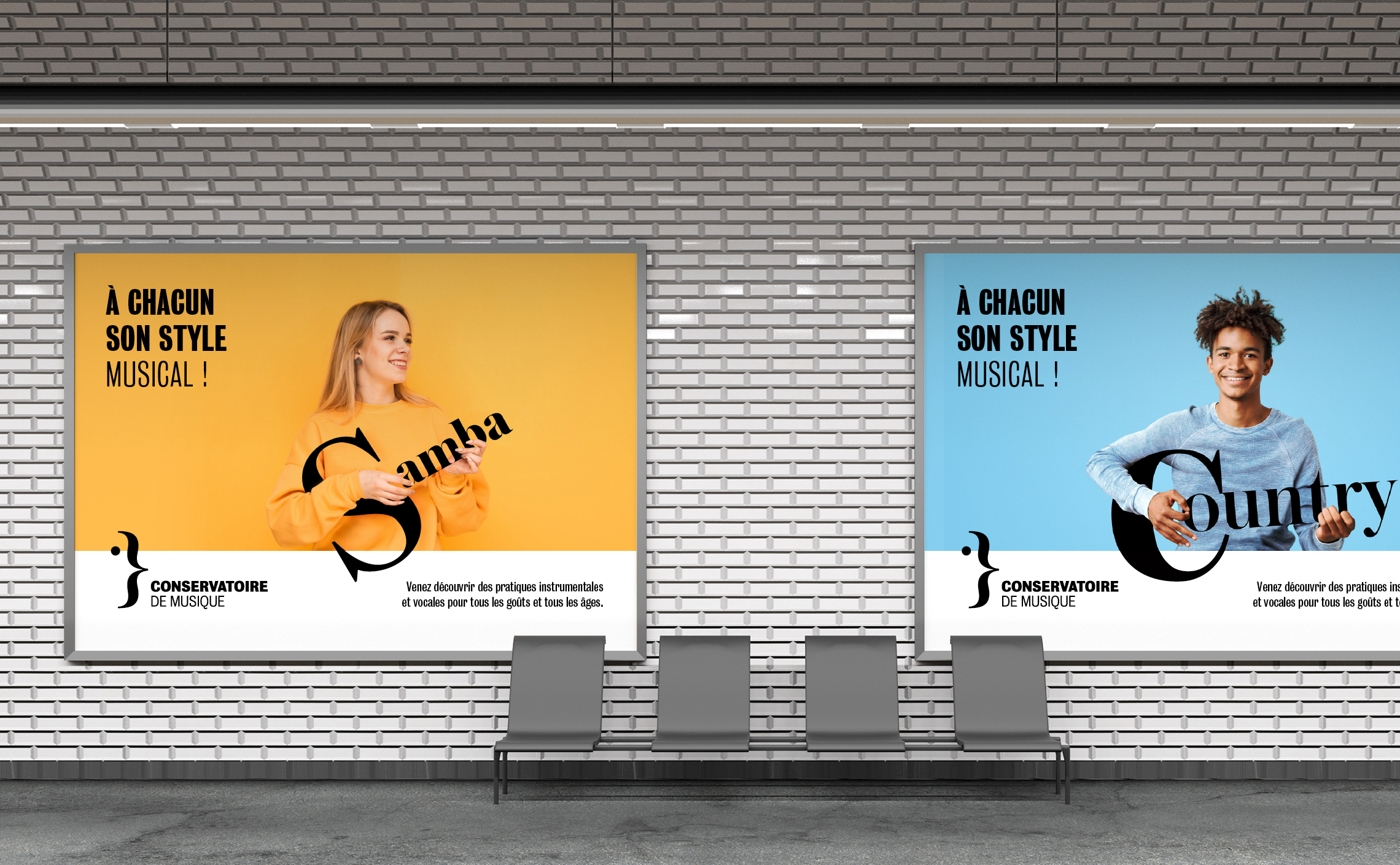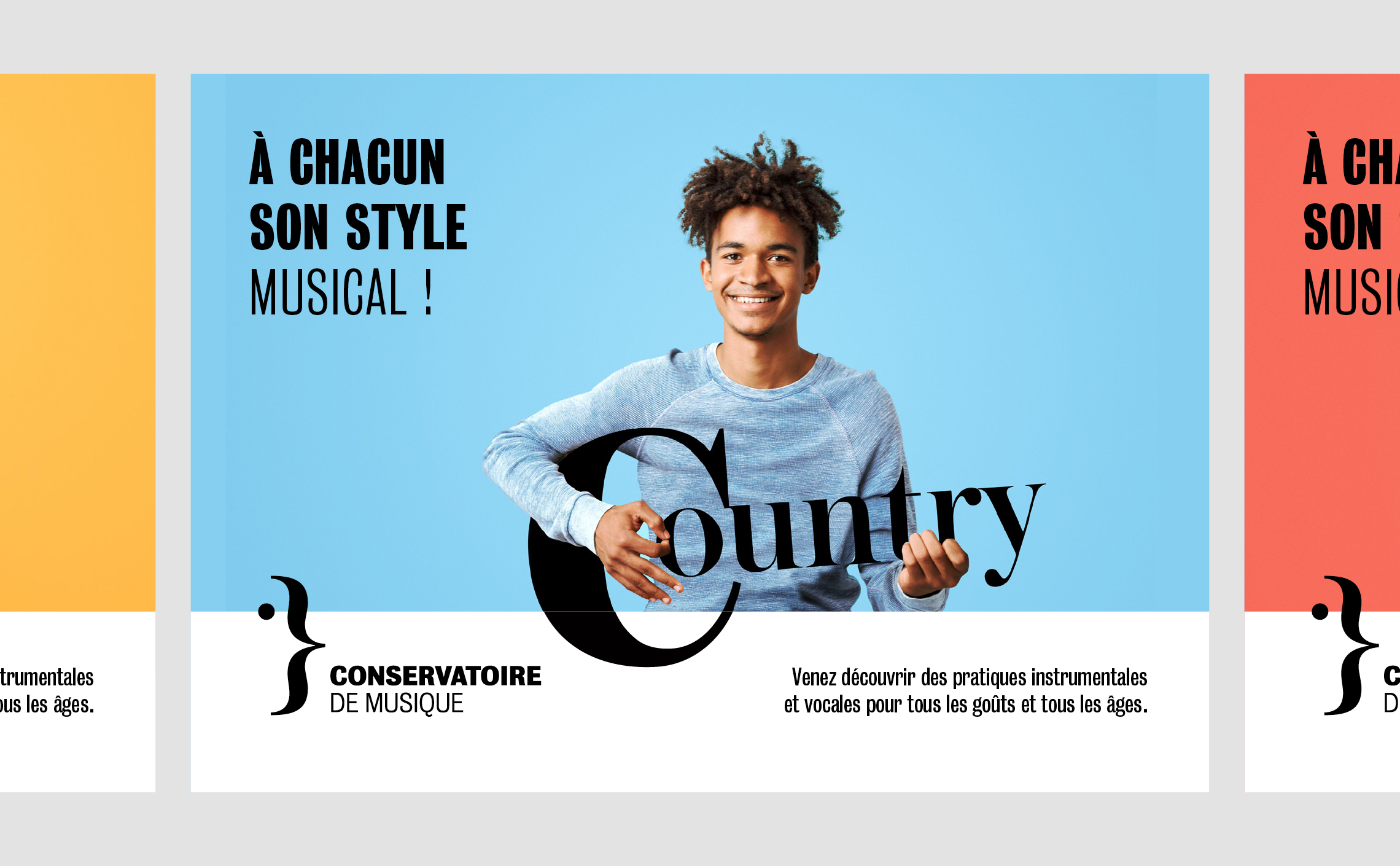 À chacun son style musical ! Pour accompagner la communication, nous avons conçu une famille de visuels illustrant l'éclectisme musical. Il s'agissait en premier lieu de lutter contre l'idée qu'un conservatoire n'enseigne que la musique classique. Samba, Rock, pop, jazz... toutes les esthétiques musicales ont leur place.