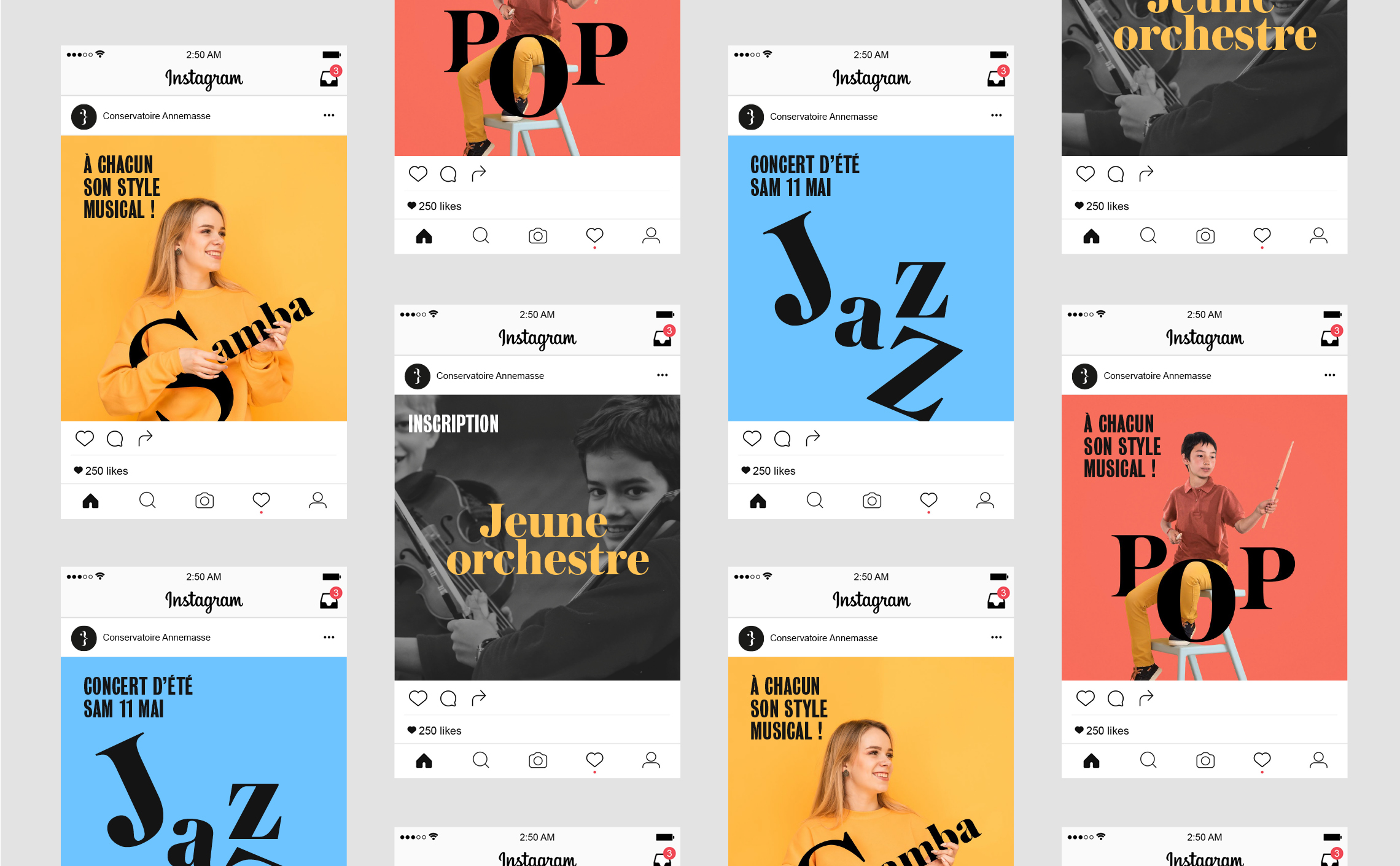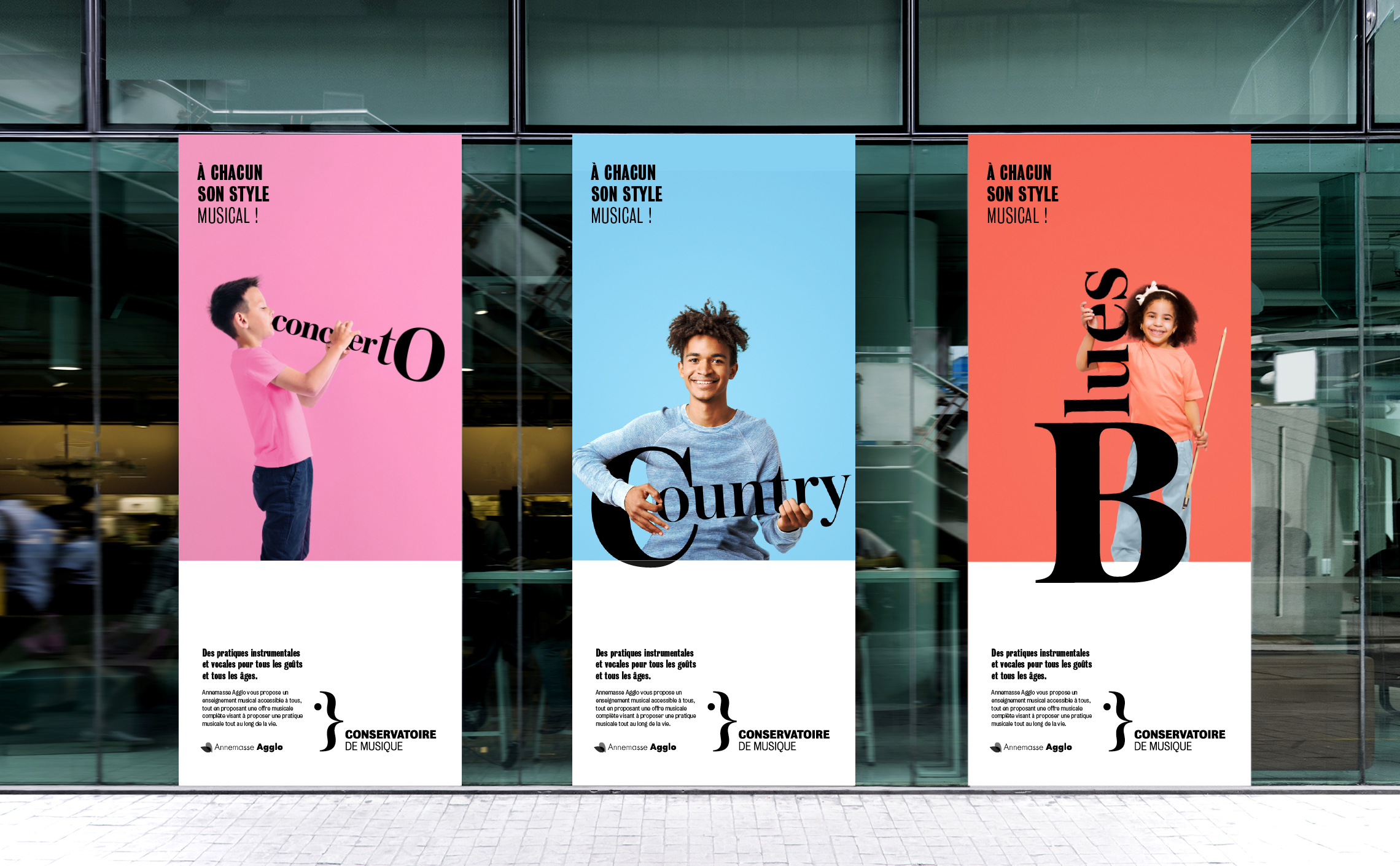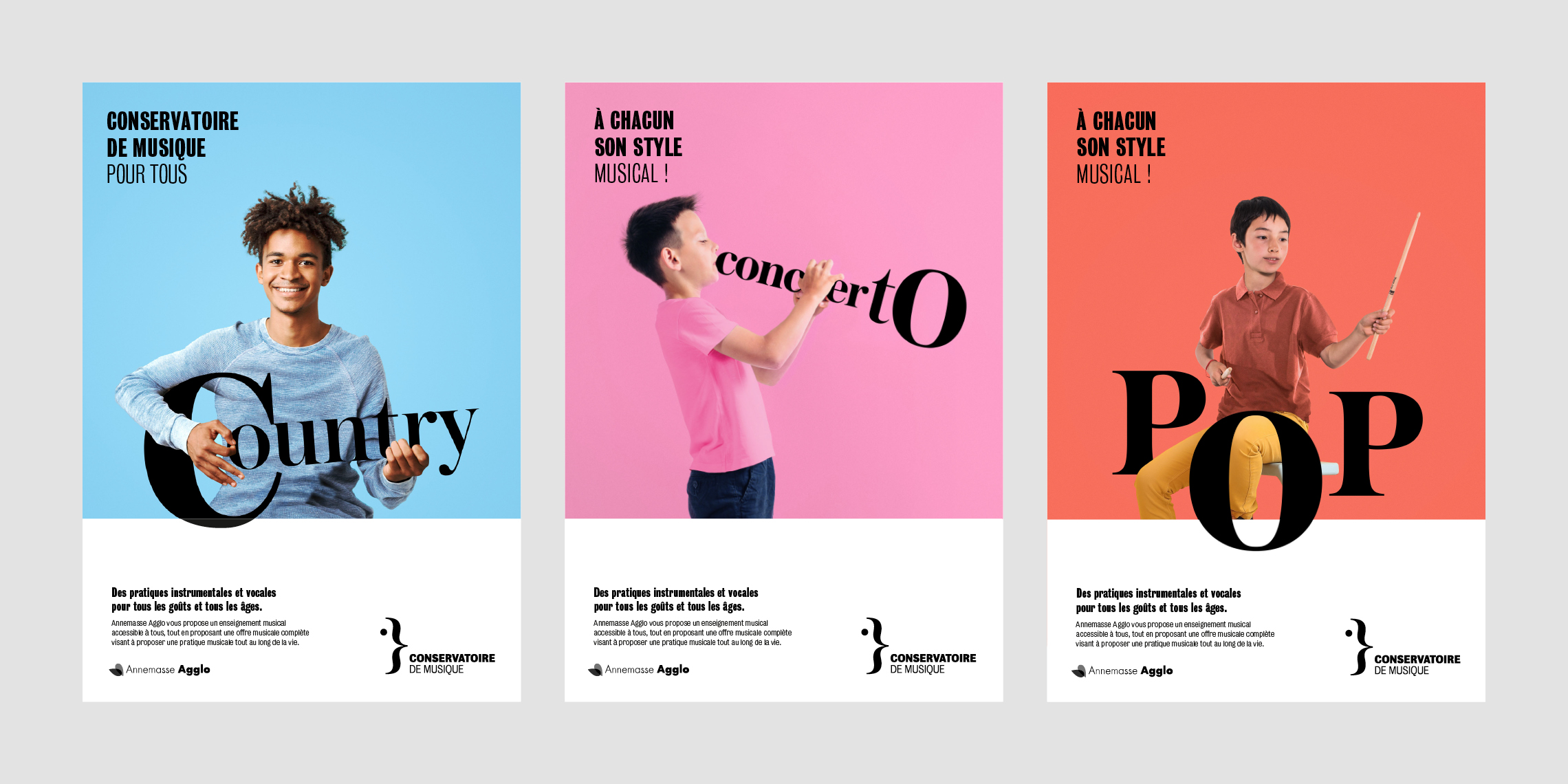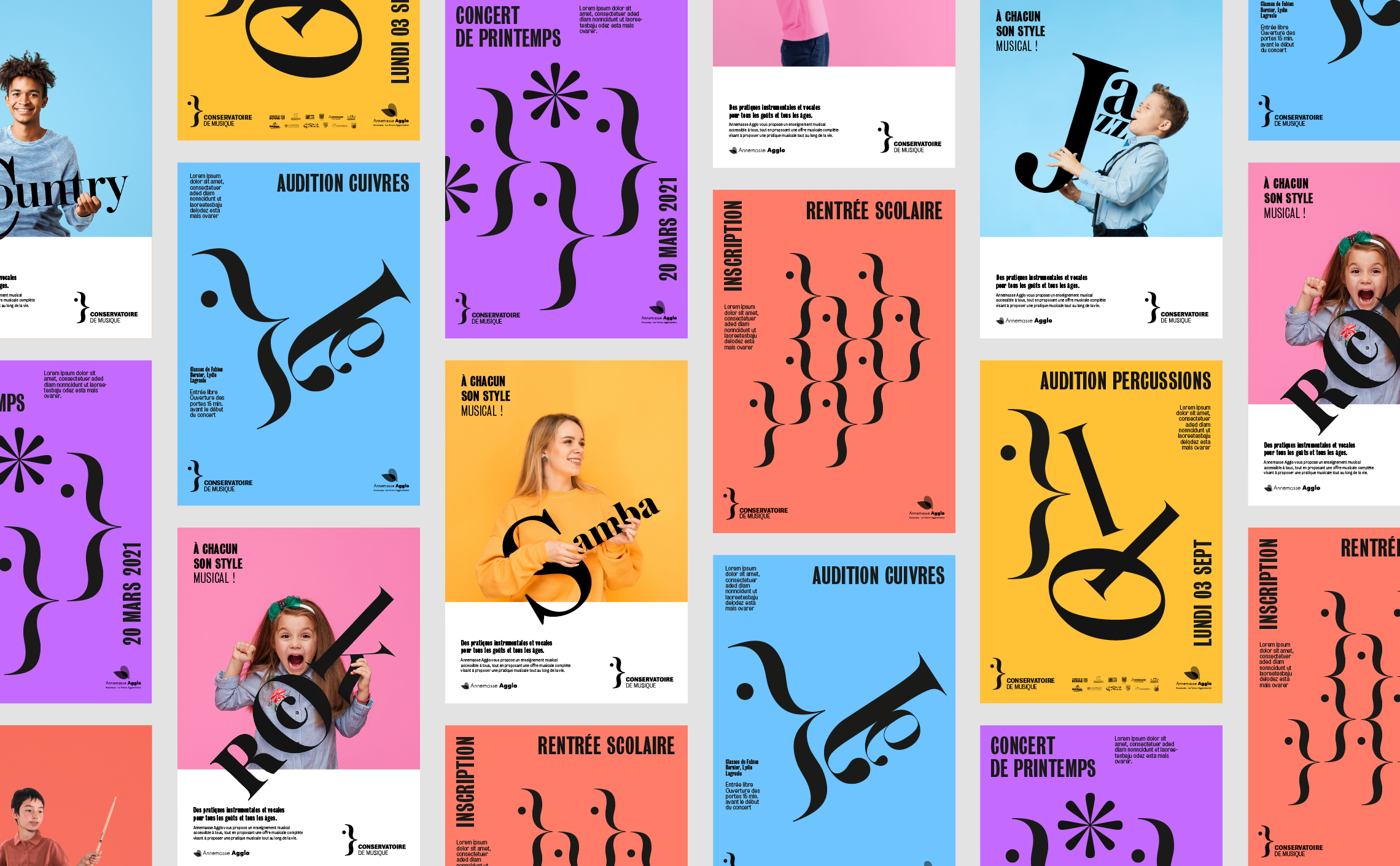 À chacun son style musical ! Pour accompagner la communication, nous avons conçu une famille de visuels illustrant l'éclectisme musical. Il s'agissait en premier lieu de lutter contre l'idée qu'un conservatoire n'enseigne que la musique classique. Samba, Rock, pop, jazz... toutes les esthétiques musicales ont leur place.