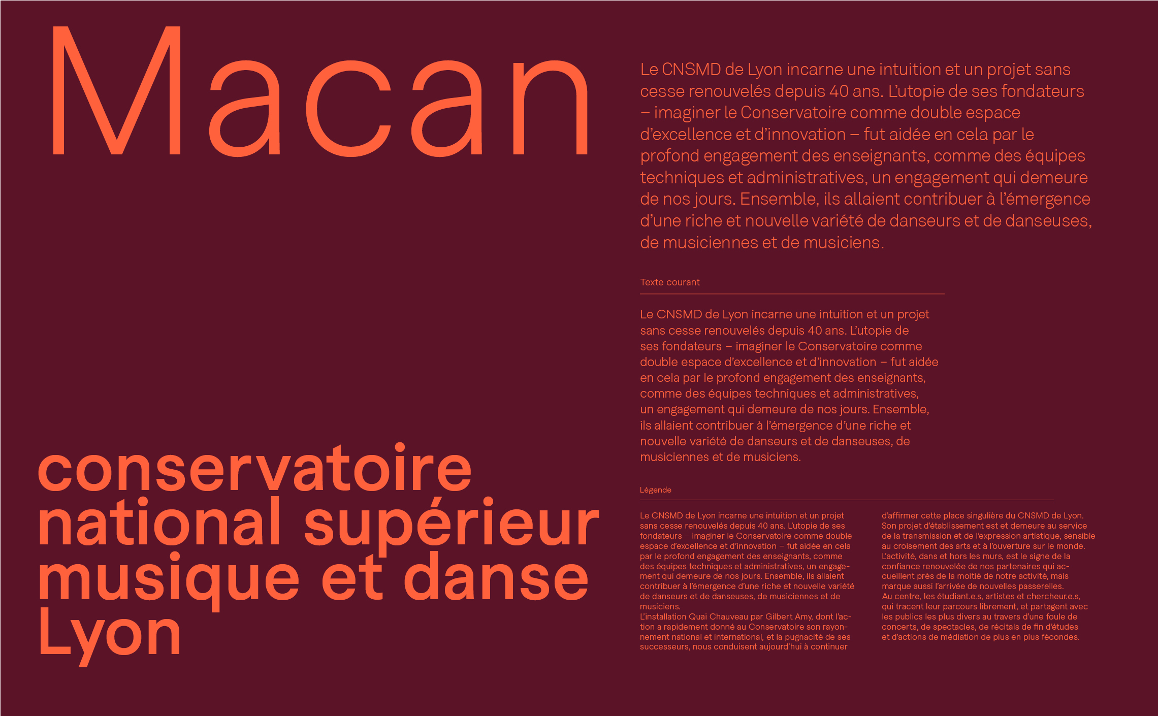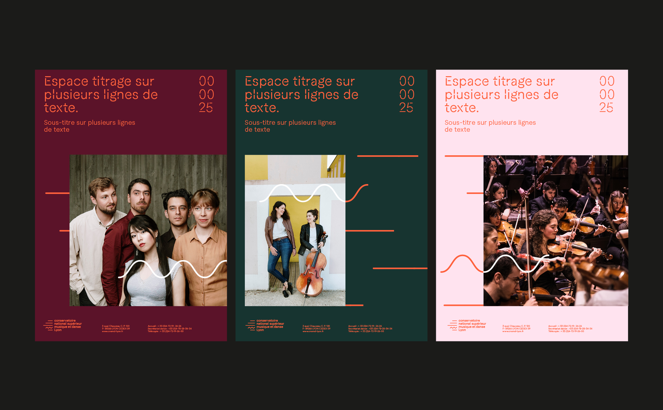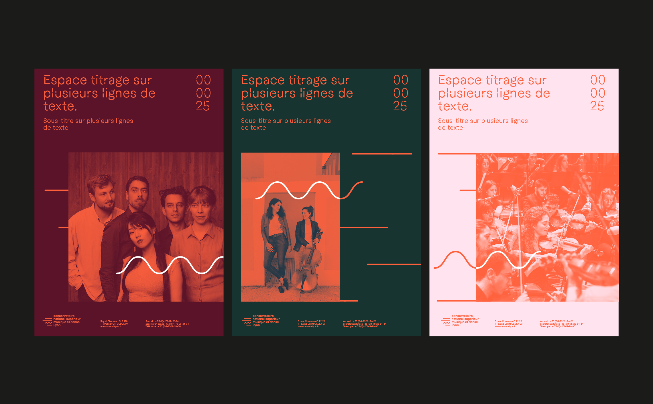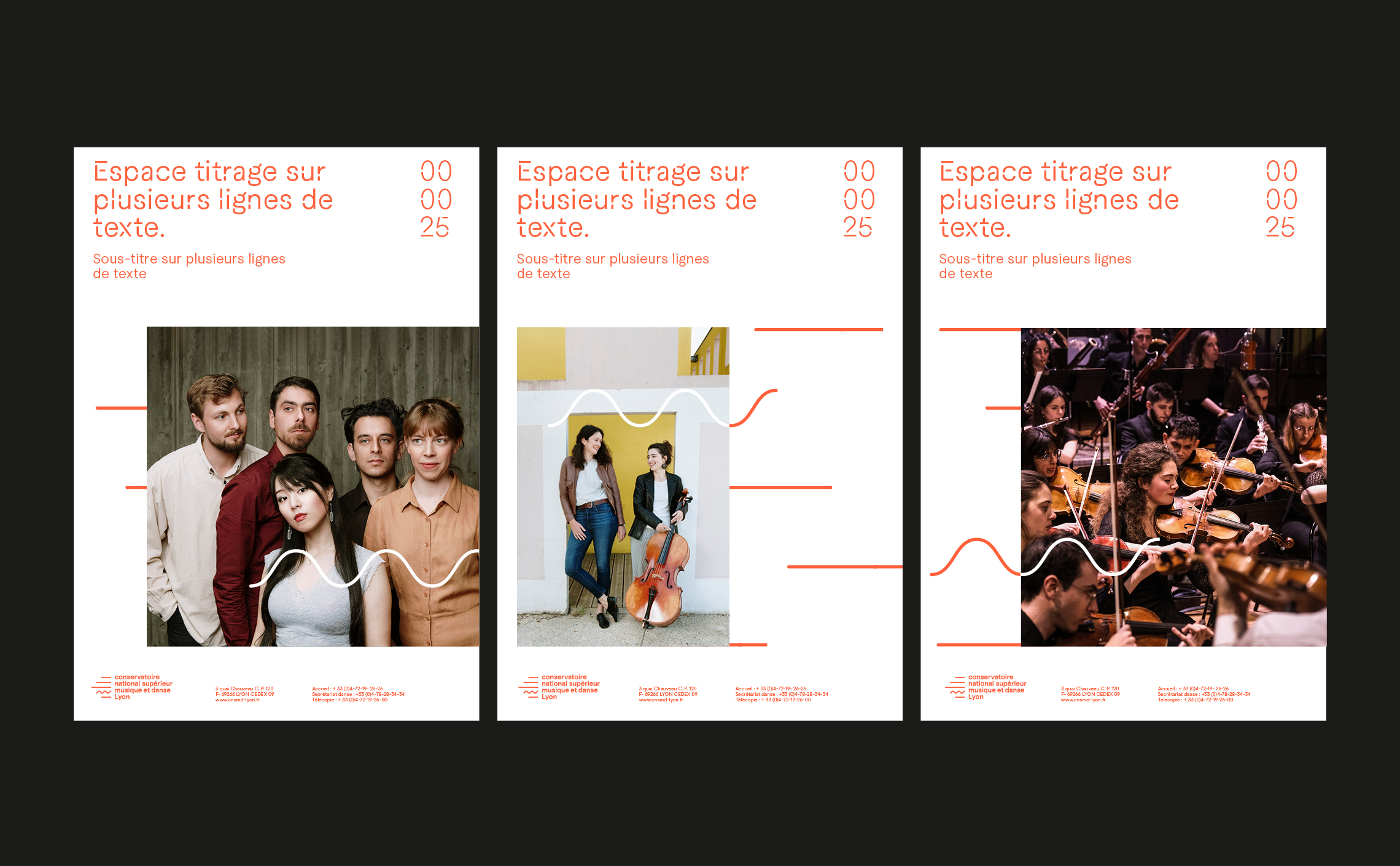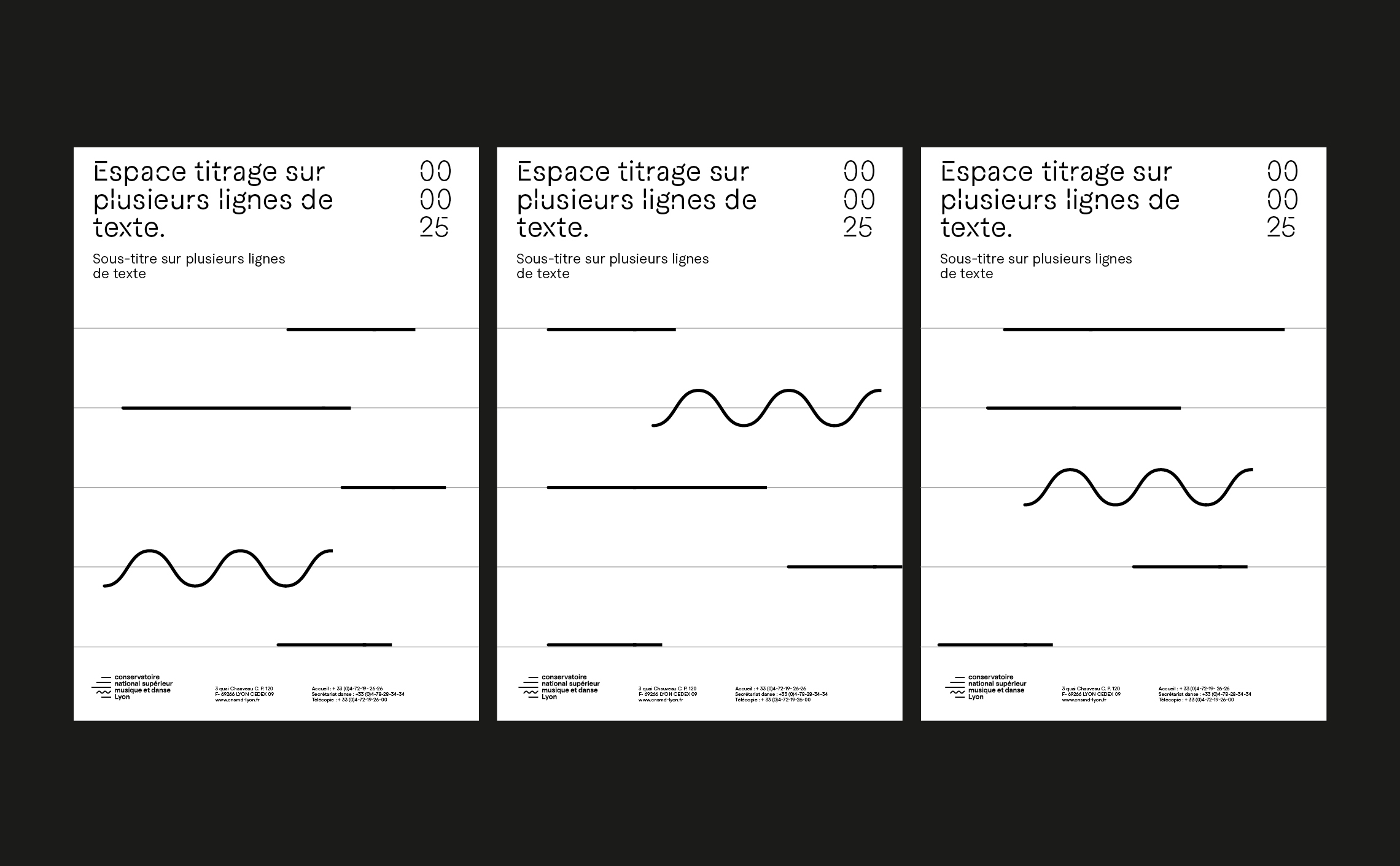 Grâce à son caractère unique, cette typographie fonctionne comme un marqueur visuel, insufflant une identité propre aux supports de communication et aux différents éléments graphiques. Ainsi, même lorsque le logo du CNSMD Lyon n’est pas présent, l’utilisation de la typographie maintient une continuité stylistique et renforce la reconnaissance de l’institution auprès du public. Cette approche typographique permet de prolonger l’identité du CNSMD Lyon de manière subtile mais efficace, assurant une cohérence visuelle à travers tous les supports de communication.