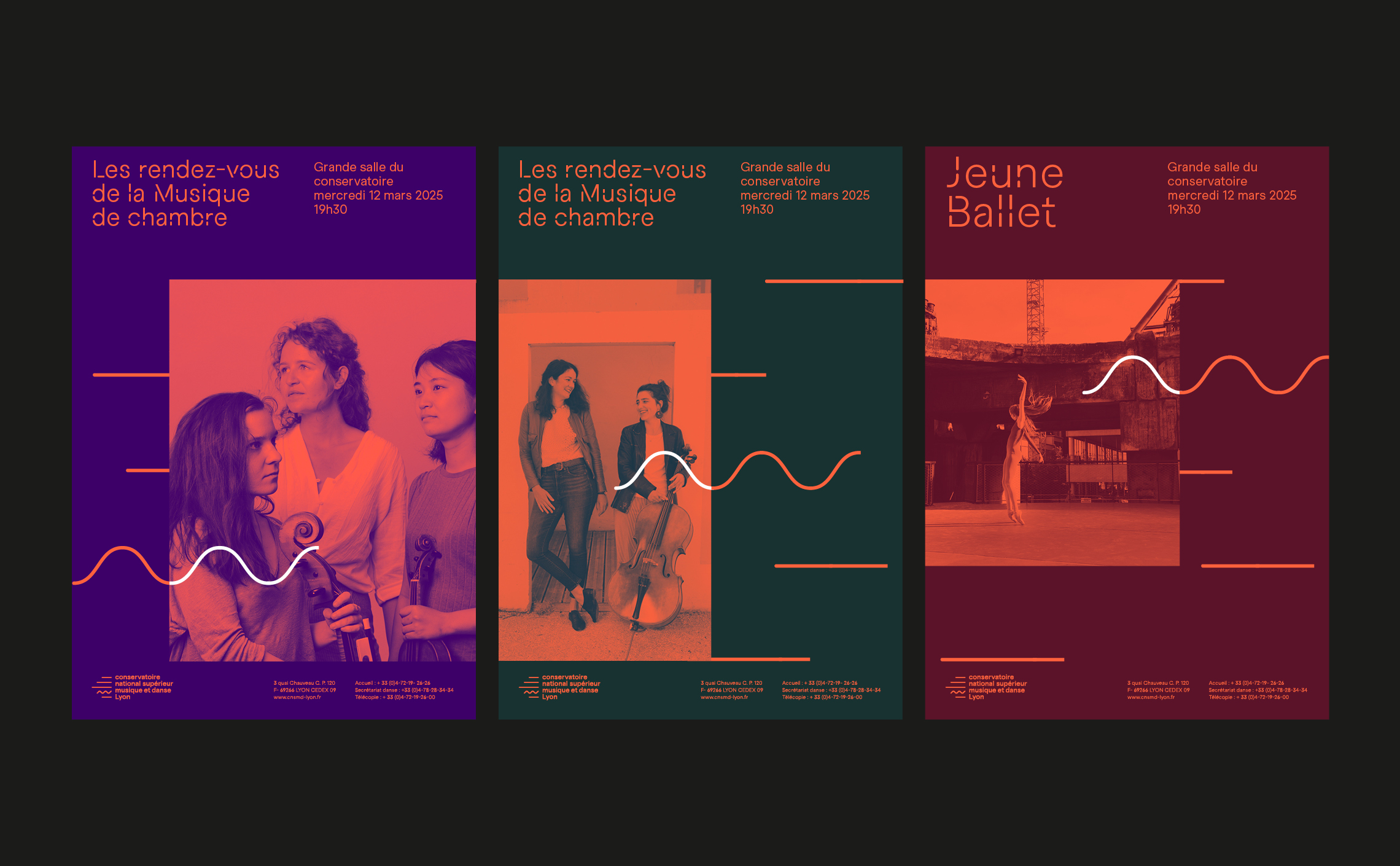 Conçue pour être vivante et évolutive, elle s'adapte à un large éventail de supports, du print aux formats animés, offrant ainsi une expérience visuelle immersive et cohérente. Plus qu'un design simple, cette identité incarne l'âme du CNSMD Lyon, un lieu où la musique et la danse s'entrelacent en parfaite symbiose.
