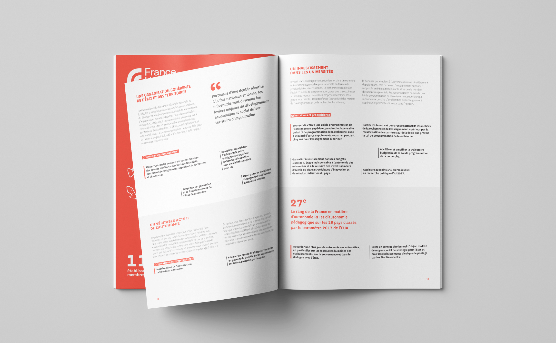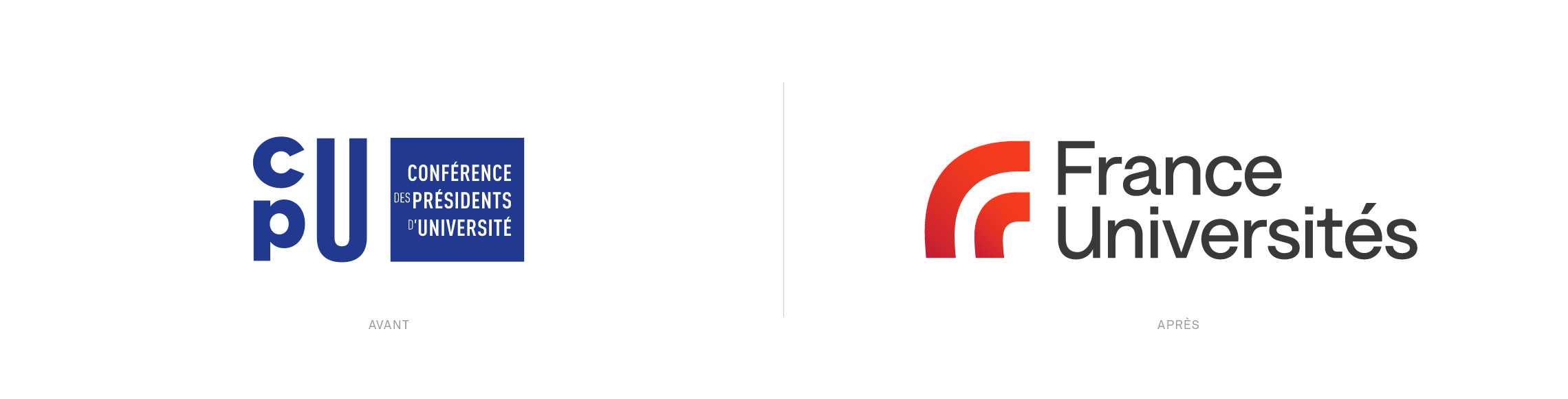Le nouveau logo qui accompagne ce changement de nom devait impérativement garder l’impact graphique de l’ancien logo acronyme « CPU ». Tout en créant un symbolique fort qui exprime la nouvelle vision de l’association. Pour répondre à ce brief, Graphéine a conçu une lettrine emblématique qui incarne France Universités en réunissant la forme de la lettre « F » — représentant le territoire français — avec une évocation des bancs de l’amphithéâtre universitaire. Ainsi, cet emblème modernise et revitalise le symbolique du premier logo créé en 1995.