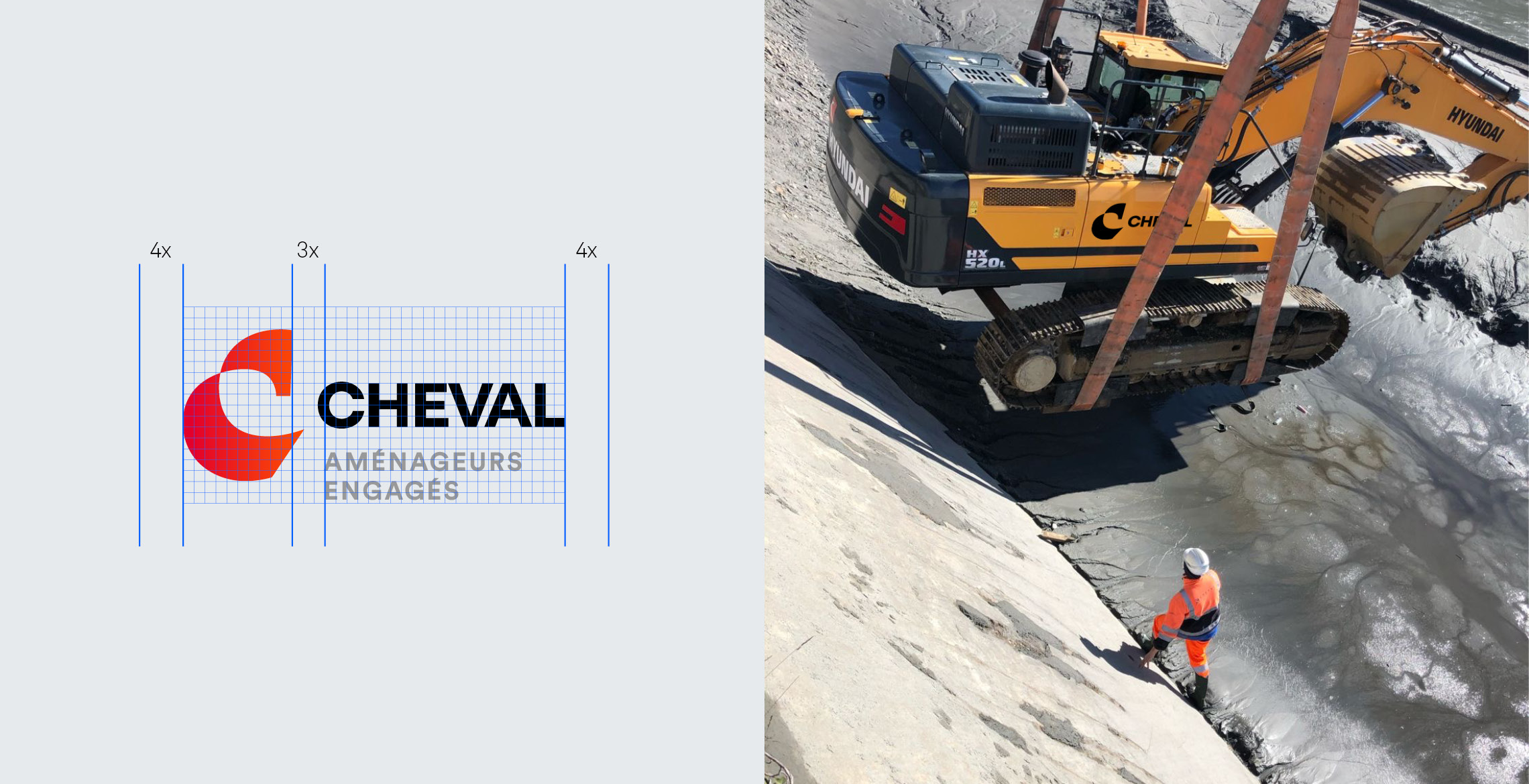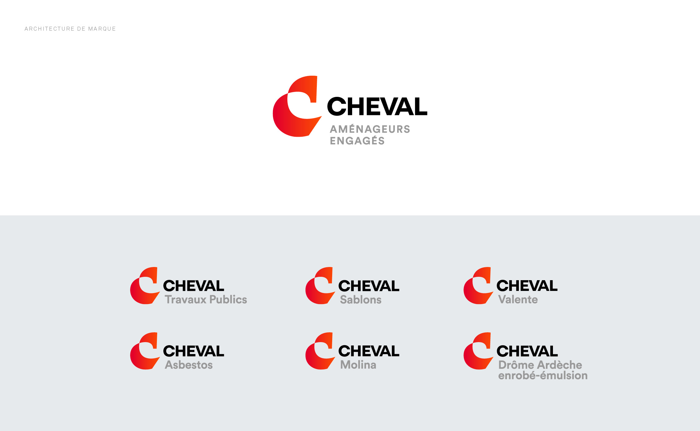 Le Groupe Cheval est une entreprise de travaux publics en pleine croissance. Le rachat successif de plusieurs filiales nécessitait de repenser leur architecture de marque. L’enregistrement d’une raison d’être dans les statuts de la société motivait par la même occasion une évolution de leur identité visuelle afin de mieux correspondre à leurs valeurs.