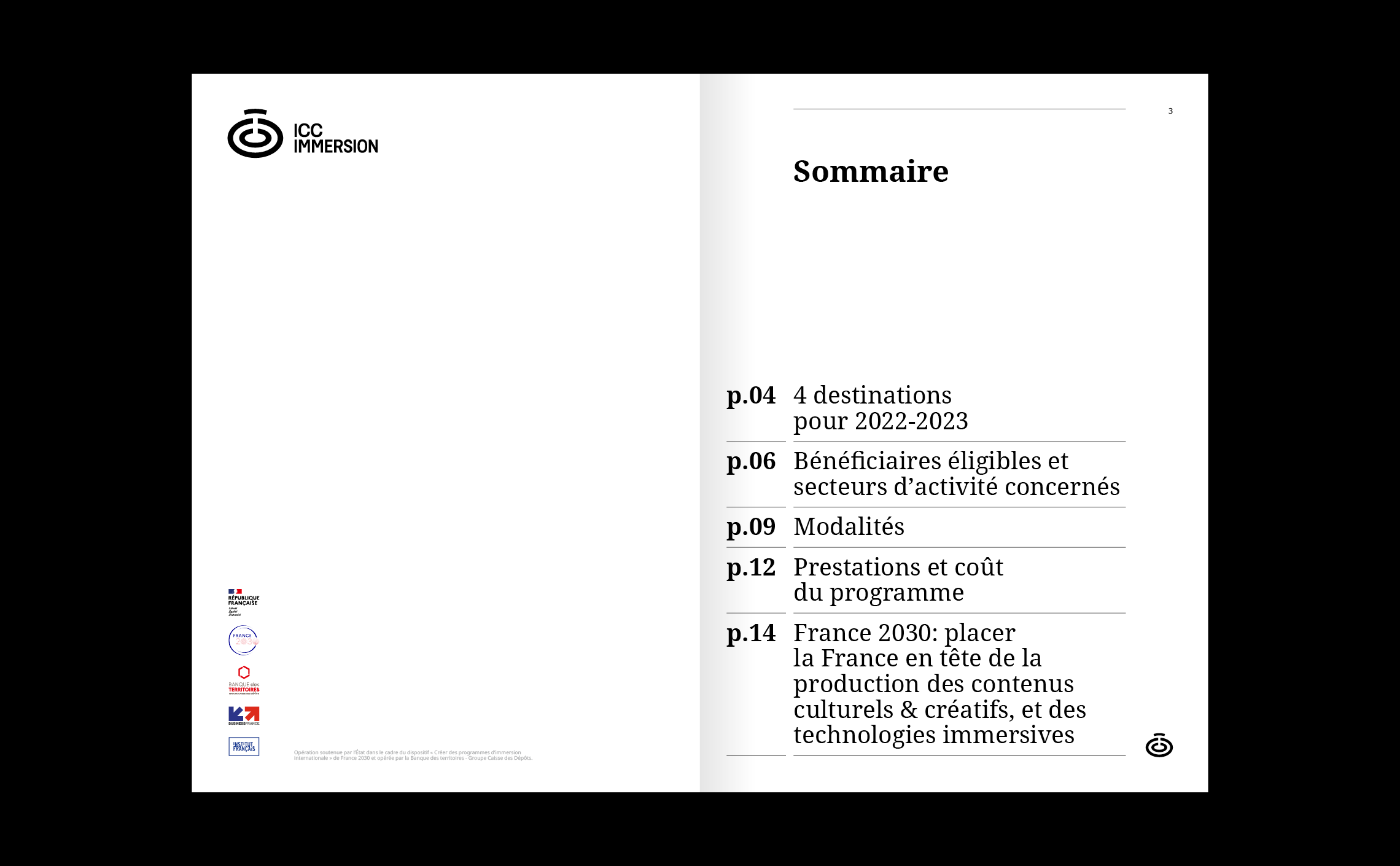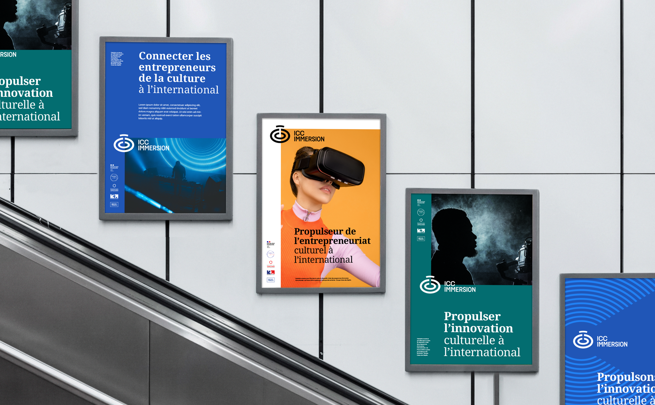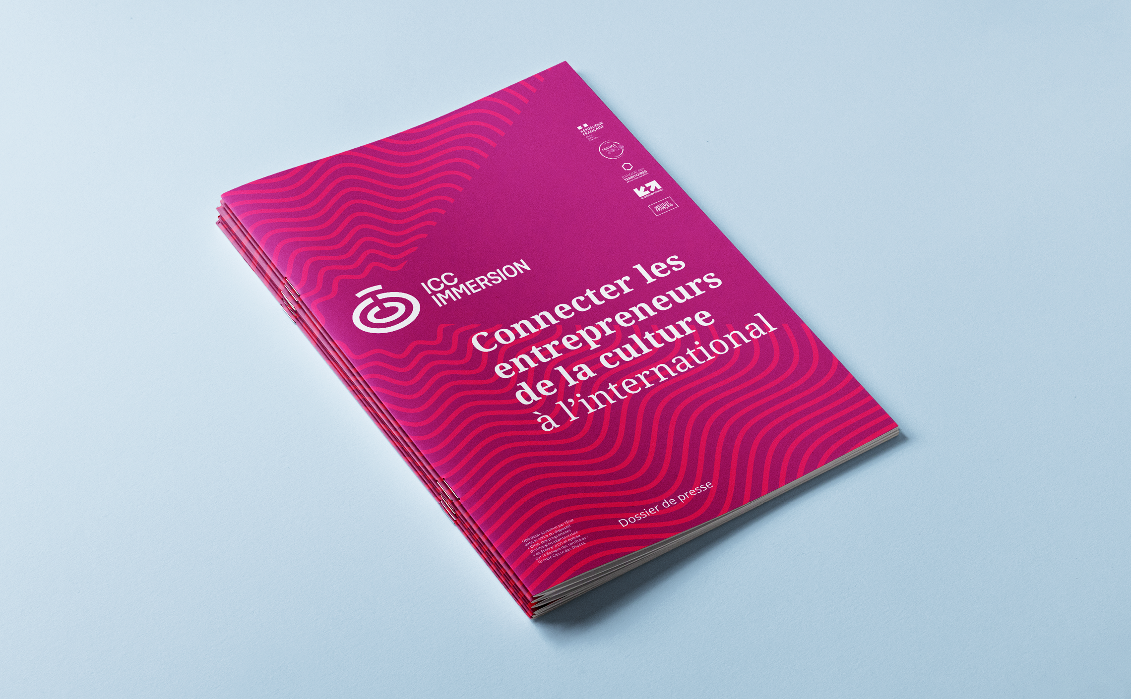Graphéine a accompagné les équipes de l'Institut Français et de Business France dans la création d'une identité visuelle pour le label « ICC immersion ». Afin d'être en adéquation avec les valeurs du programme, cette identité a été pensée pour s'épanouir sur une grande diversité de supports de communication. Il était important que sa charte graphique intègre une grande potentialité de déclinaisons en motion design pour l'audiovisuel.