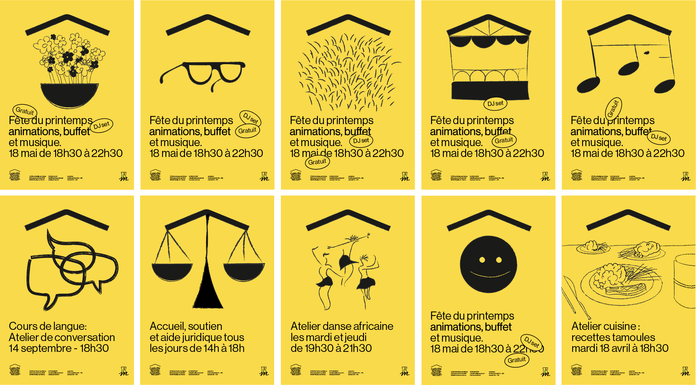Des fonds d'affiches sont conçus et mis à disposition de la direction et du personnel. En écrivant, copiant, imaginant et dessinant, il devient ainsi très facile de créer des visuels ou de diffuser tout type de message à l'intérieur et à l'extérieur du Centre Social. Ces supports pourront aussi servir de base d'activité de dessin pour les enfants, et comme support pédagogique pour les personnes primo-arrivantes en apprentissage de la langue.