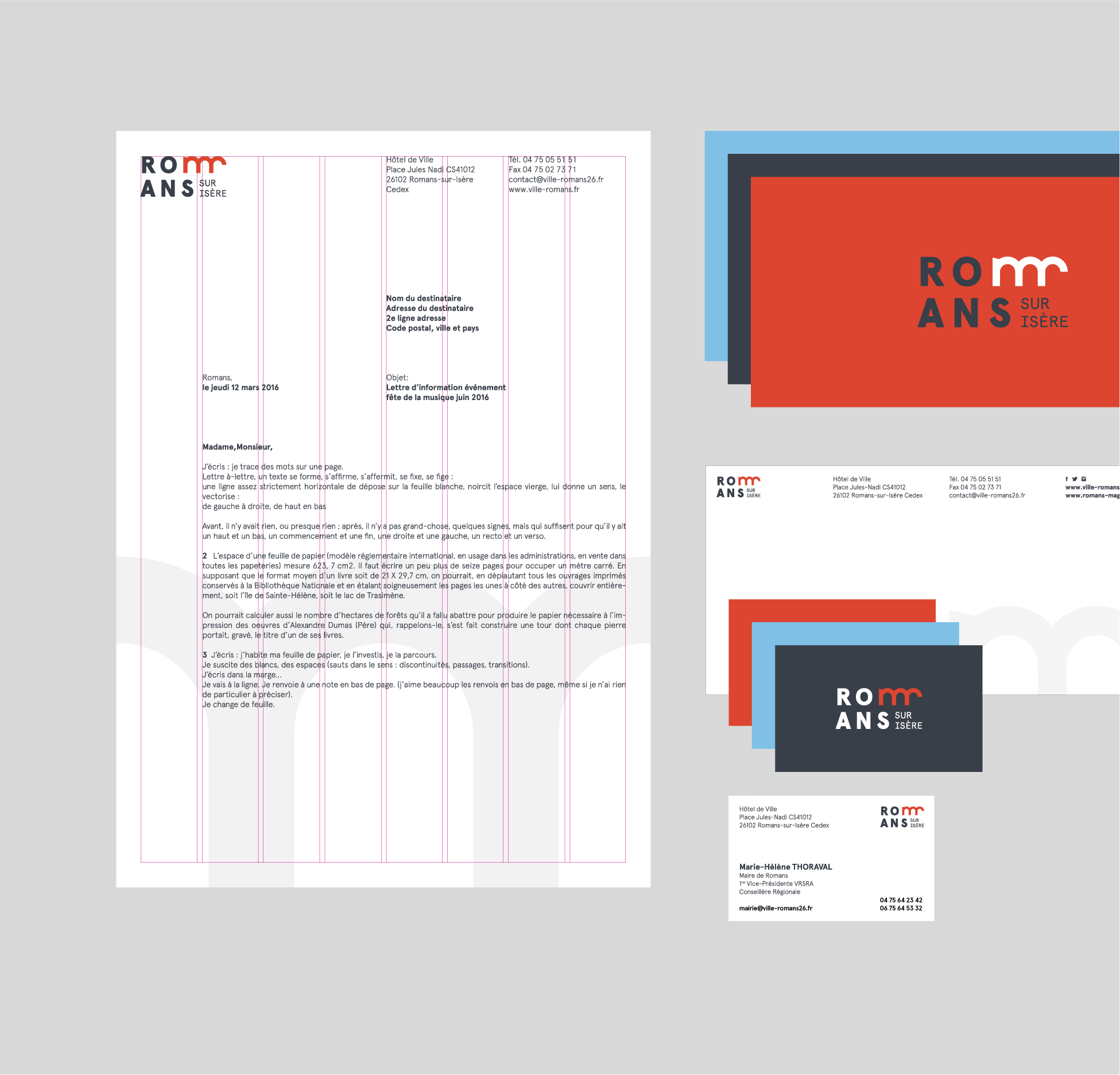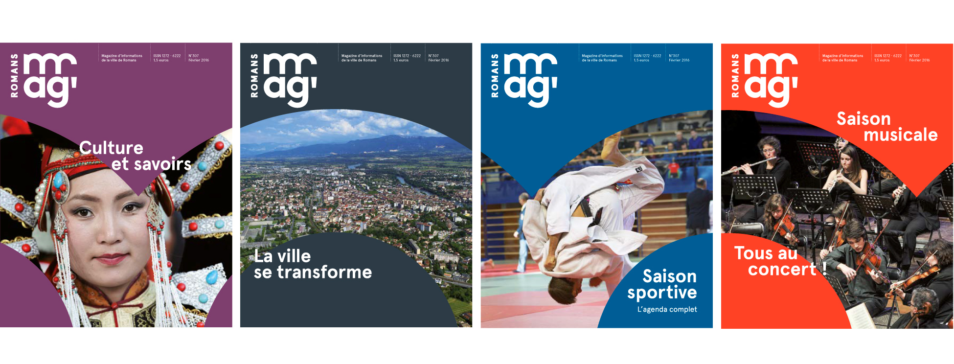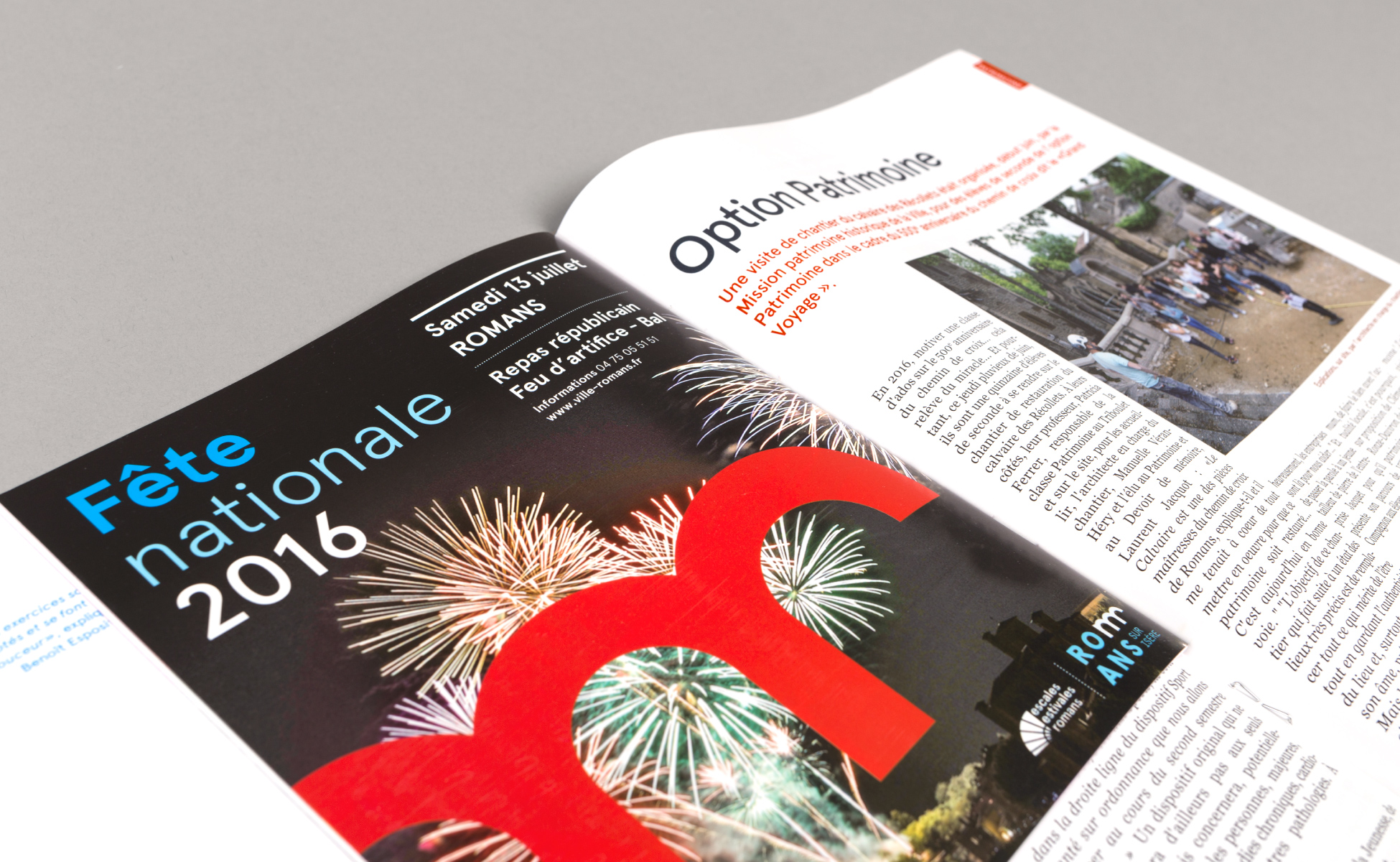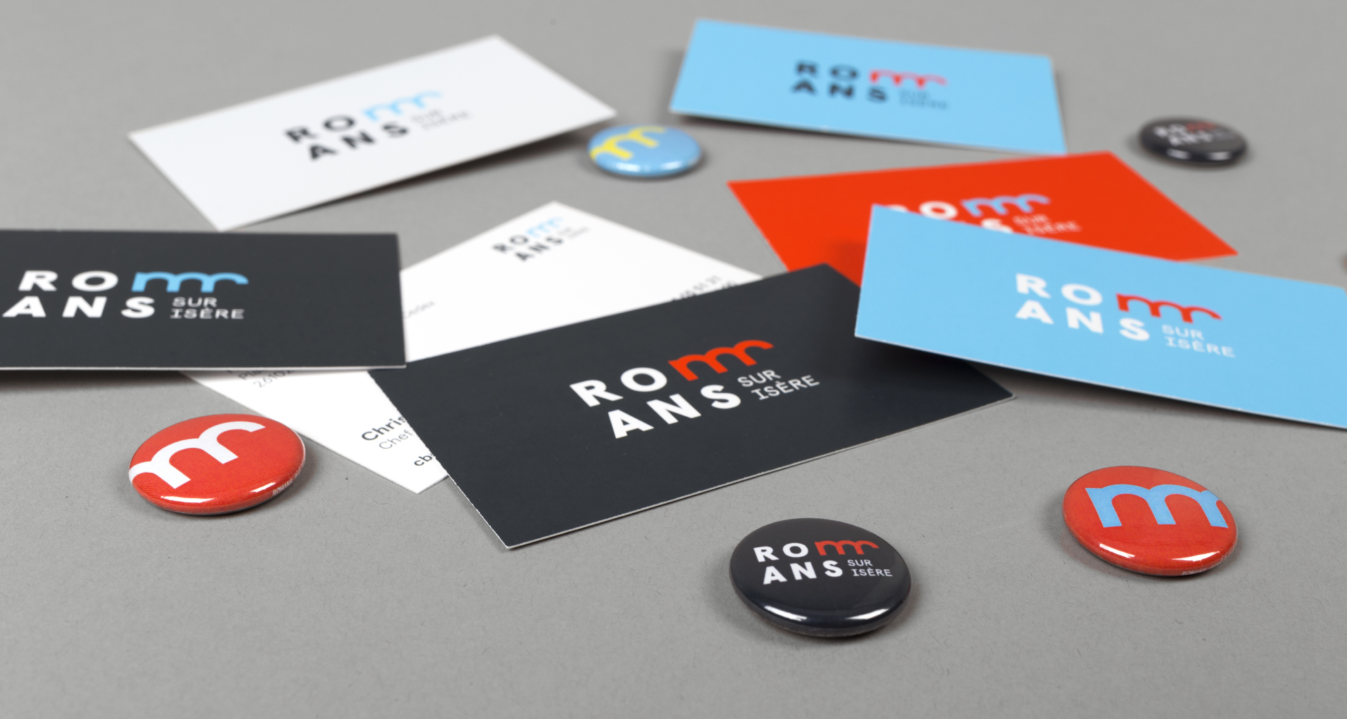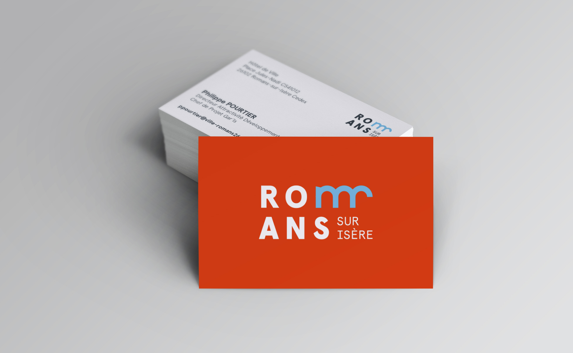 Création de l'identité visuelle de Romans-sur-Isère, ville située sur la rive droite de l'Isère à 20 km de Valence (Drôme). Avec la ville voisine de Bourg-de-Péage, établie de l'autre côté de l'Isère, elle forme une agglomération de 50 000 habitants.