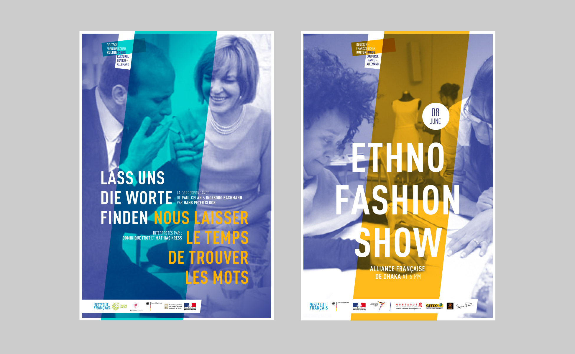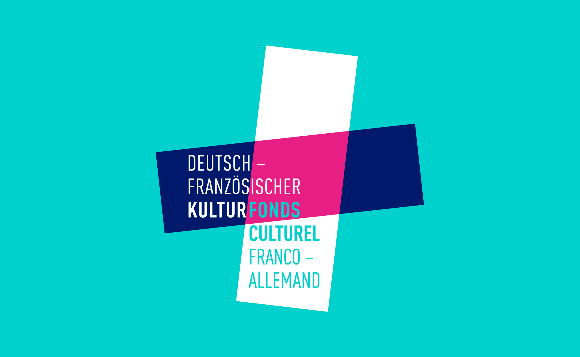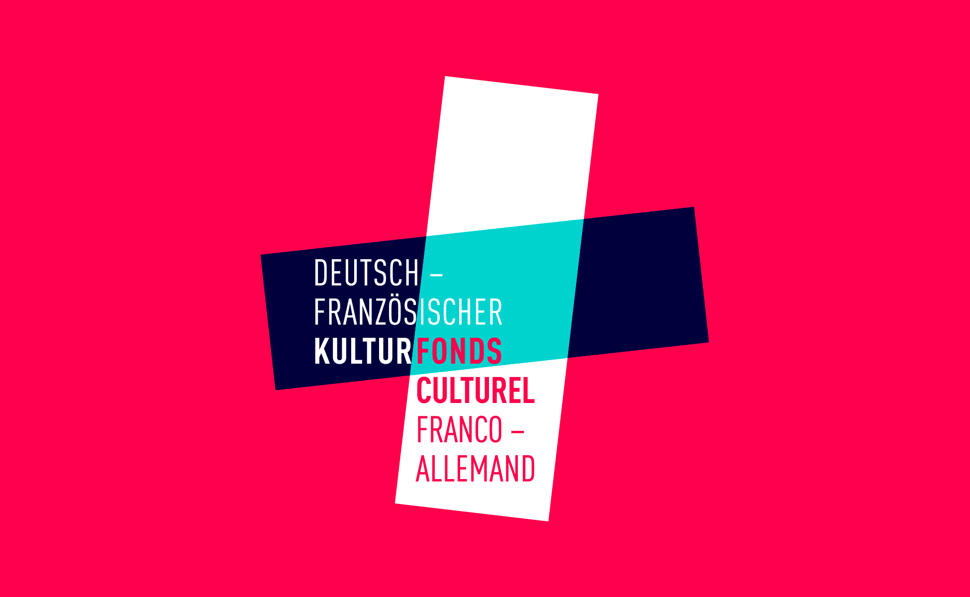 Cette identité visuelle du Fonds Culturel Franco-Allemand s’articule autour de la notion d’échange croisés. L’Allemagne est symbolisée par un axe horizontal, et la France par un axe vertical. Une couleur est attribuée à chacun de ces deux axes.