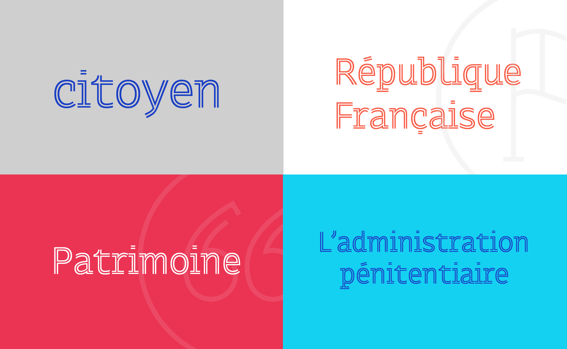 Le Ministère de la Justice a sollicité Graphéine pour la création d'une nouvelle identité visuelle. Comme l’ensemble des Ministères, la Justice arbore irrévocablement le système décliné sur la base du logotype de la République Française. Avec cette contrainte de mettre en place une nouvelle charte graphique tout en conservant le logo institutionnel, la discussion s'est très vite orientée sur l'idée de baser la nouvelle identité visuelle sur la création d'une typographie sur-mesure, à l'image de ce que nous avions précédemment réalisé, dans un univers tout autre, pour l'abbaye royale de Fontevraud.