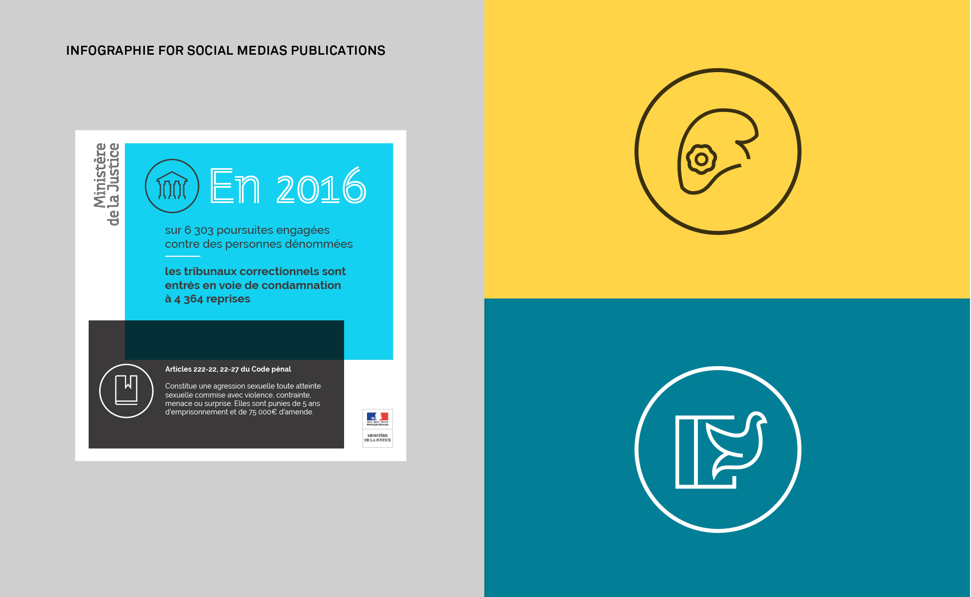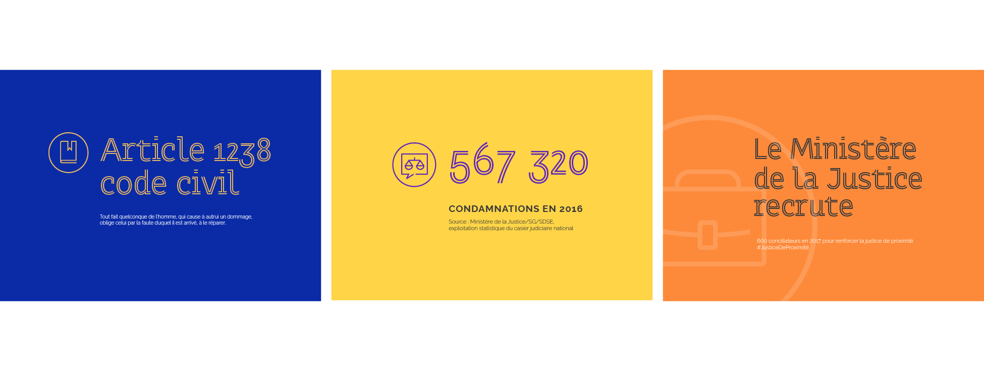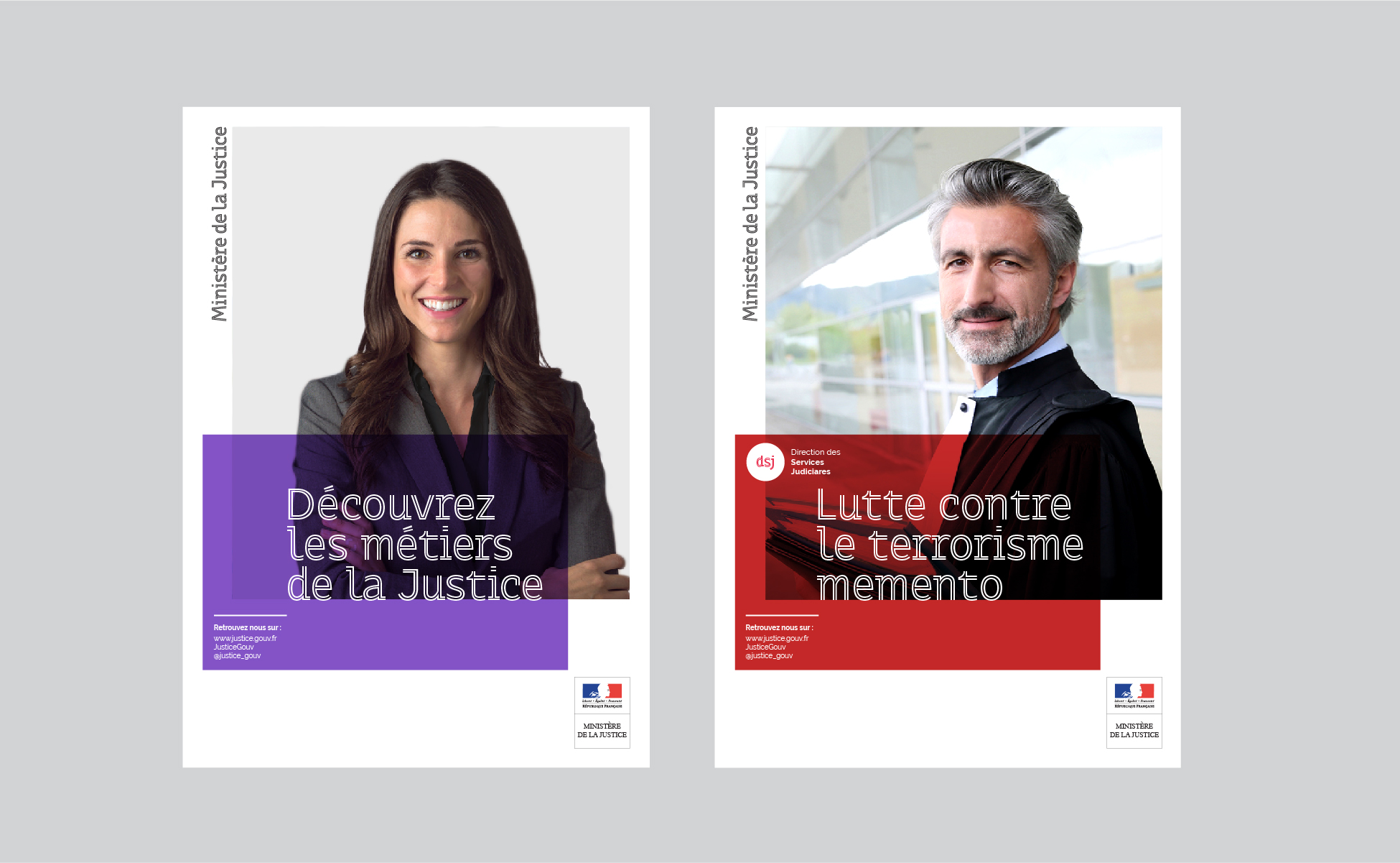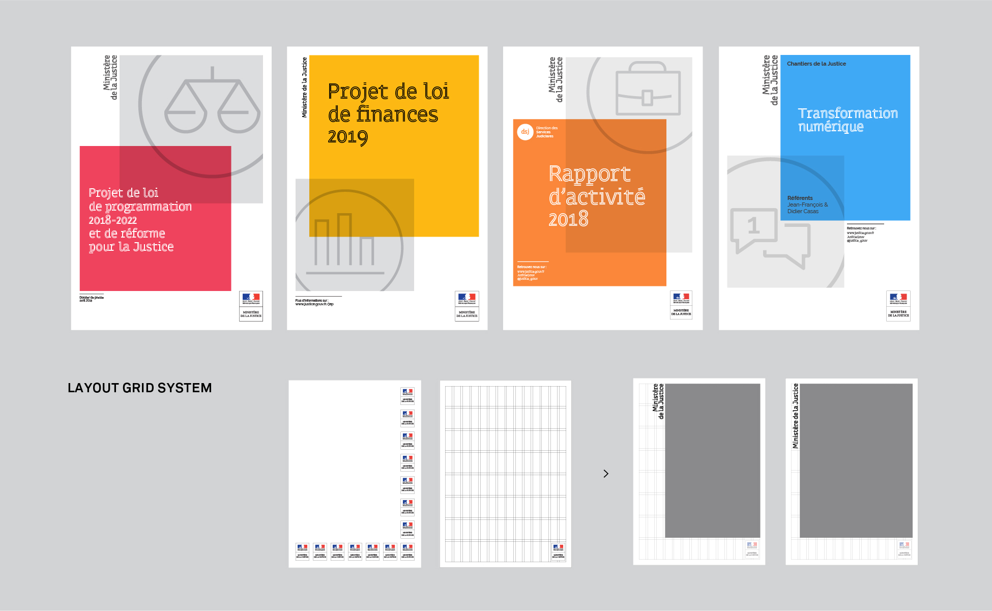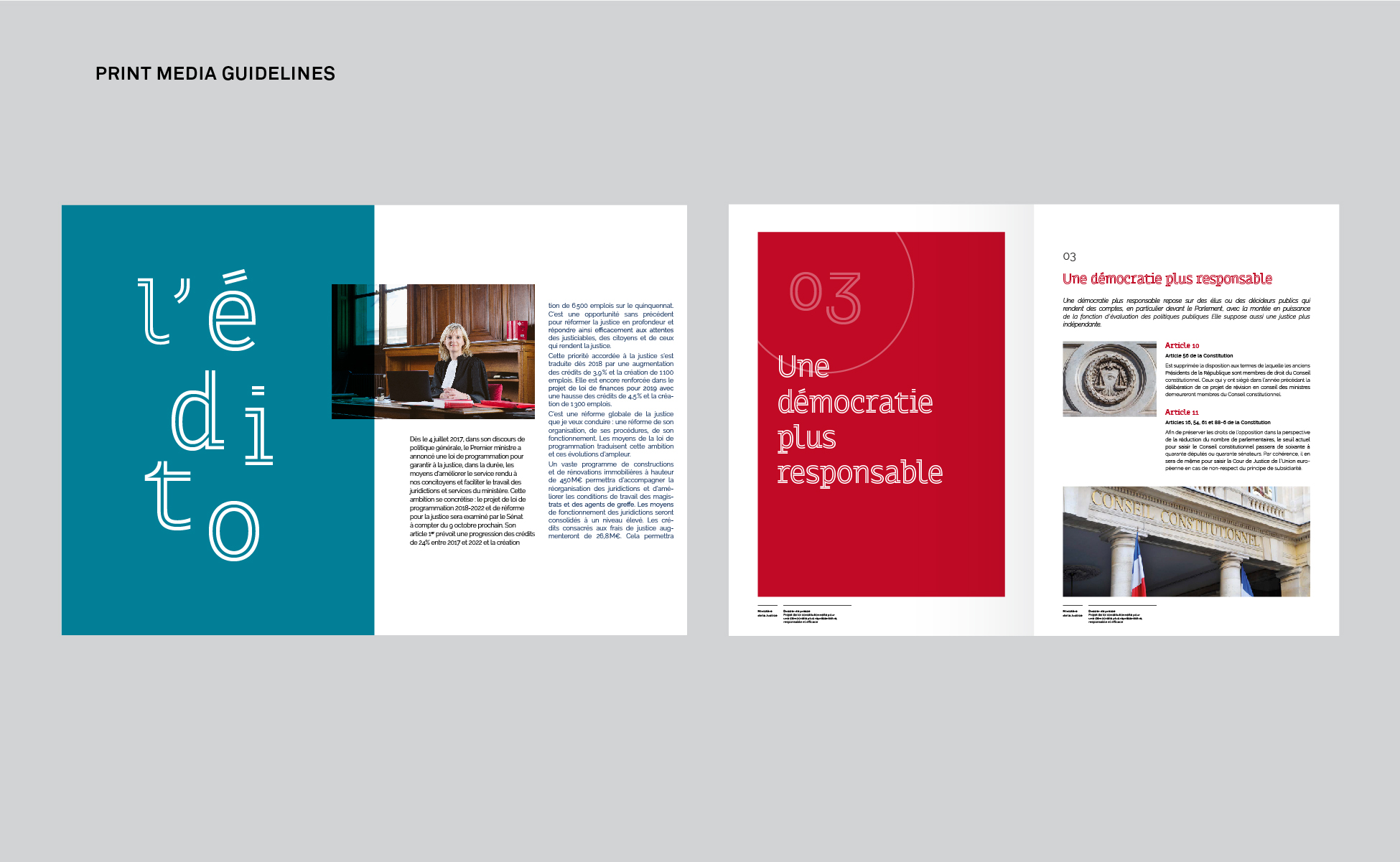 Pour le ministère de la Justice, nous avons dessiné une gamme de pictogrammes incarnant les différentes fonctions et utilités de l’institution. Les pictogrammes reprennent le style typographique au trait ouvert. Enfin, le troisième degré intègre une iconographie photographique et/ou illustrée. La superposition d’aplats colorés et de photographies apporte du rythme et donne du relief aux mises en page. L’ensemble des maquettes construites sur cette grille modulaire permettent une grande flexibilité de composition pour les équipes de communication qui se réapproprient le système en interne.