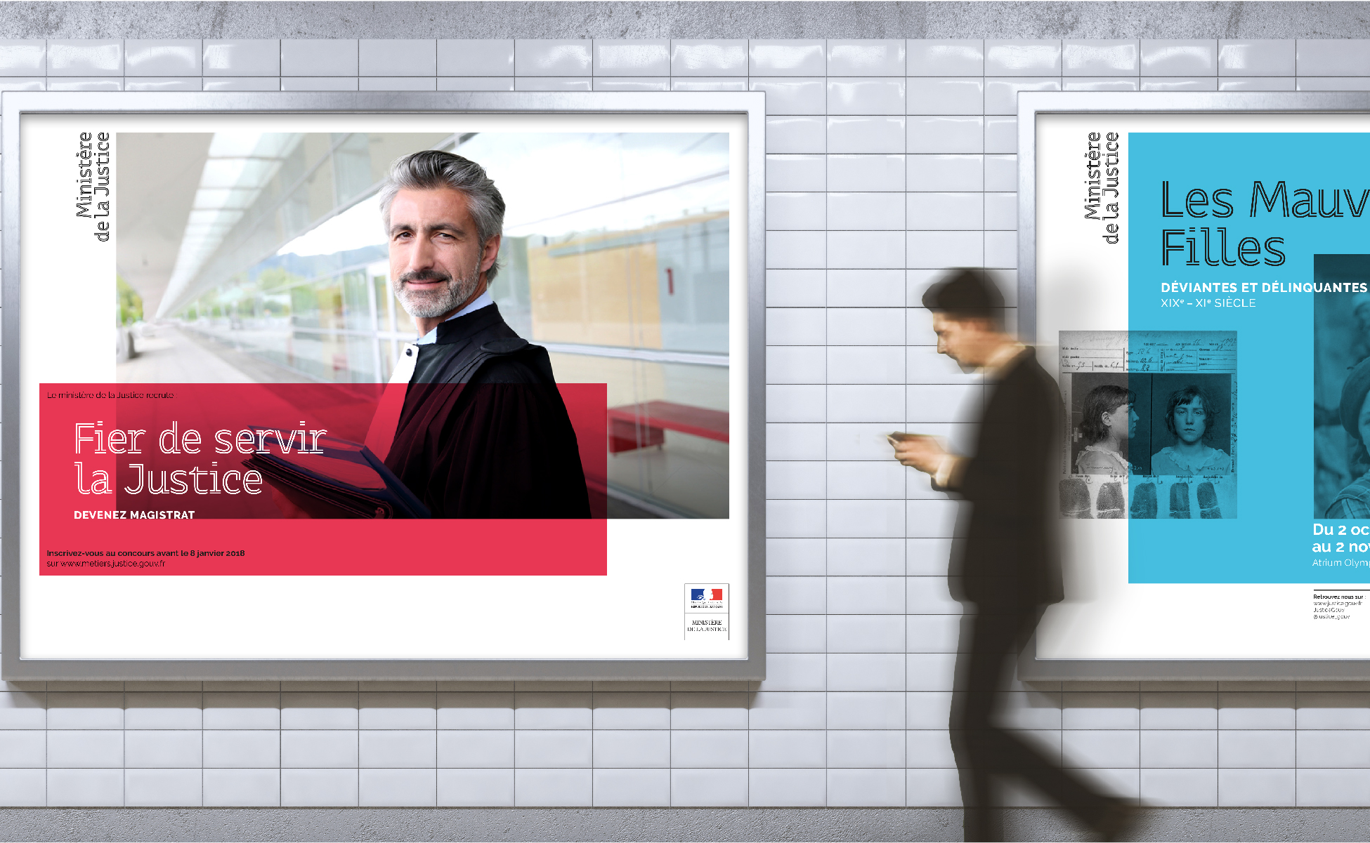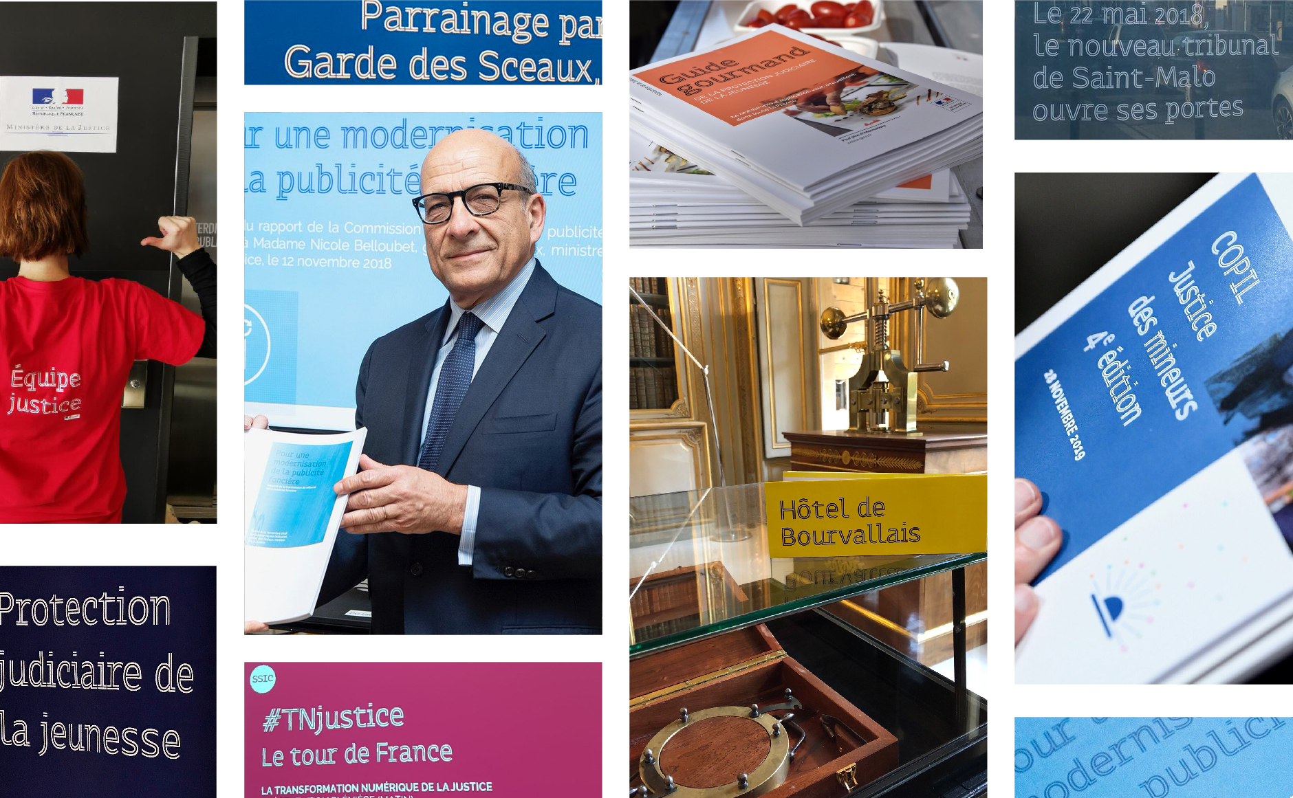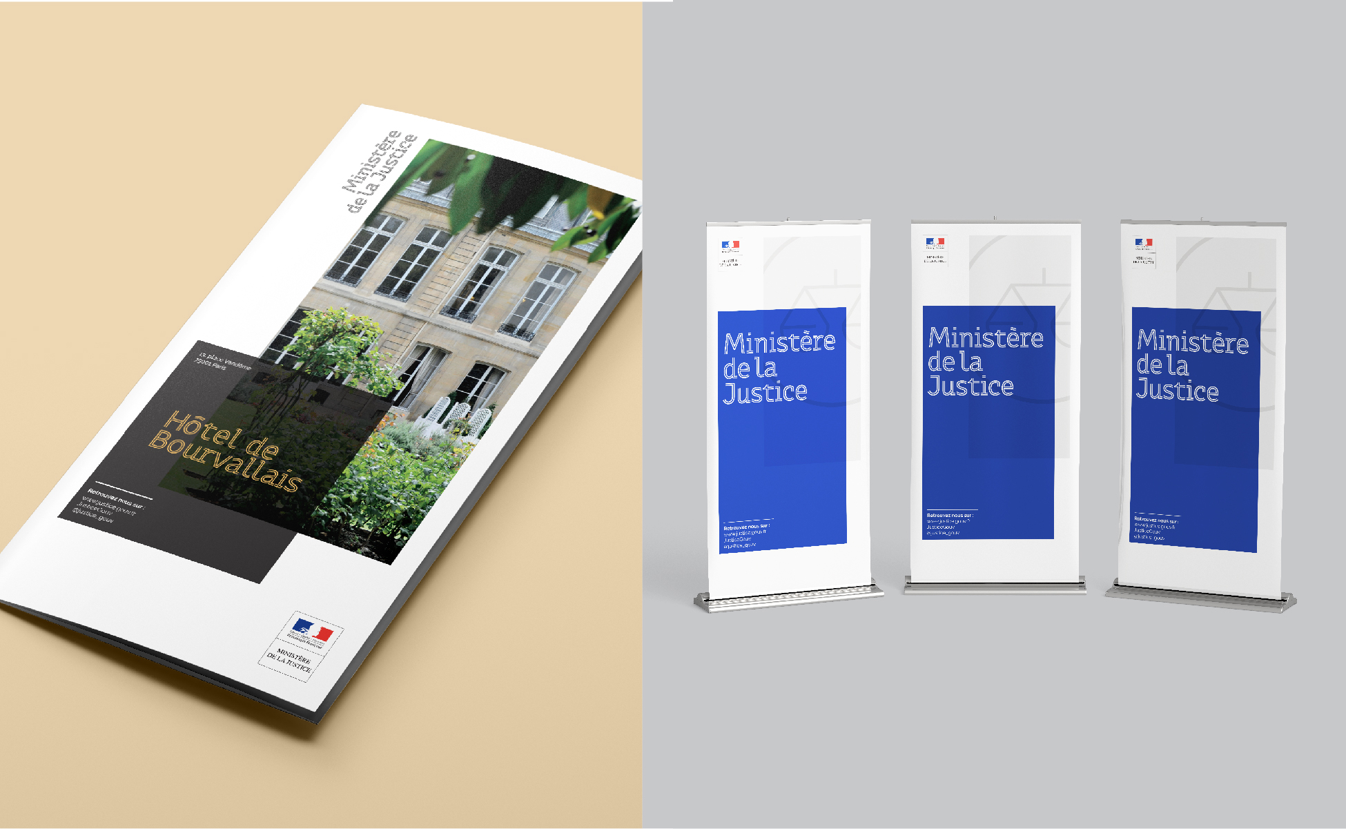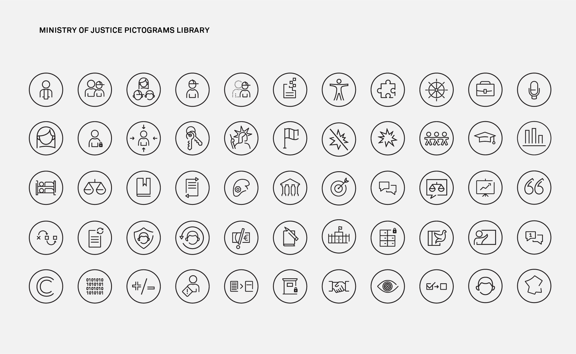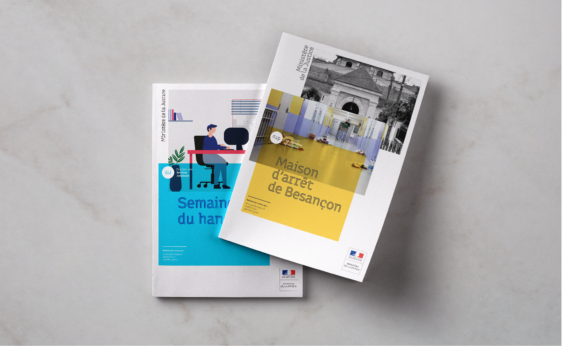 Pour le ministère de la Justice, nous avons dessiné une gamme de pictogrammes incarnant les différentes fonctions et utilités de l’institution. Les pictogrammes reprennent le style typographique au trait ouvert. Enfin, le troisième degré intègre une iconographie photographique et/ou illustrée. La superposition d’aplats colorés et de photographies apporte du rythme et donne du relief aux mises en page. L’ensemble des maquettes construites sur cette grille modulaire permettent une grande flexibilité de composition pour les équipes de communication qui se réapproprient le système en interne.