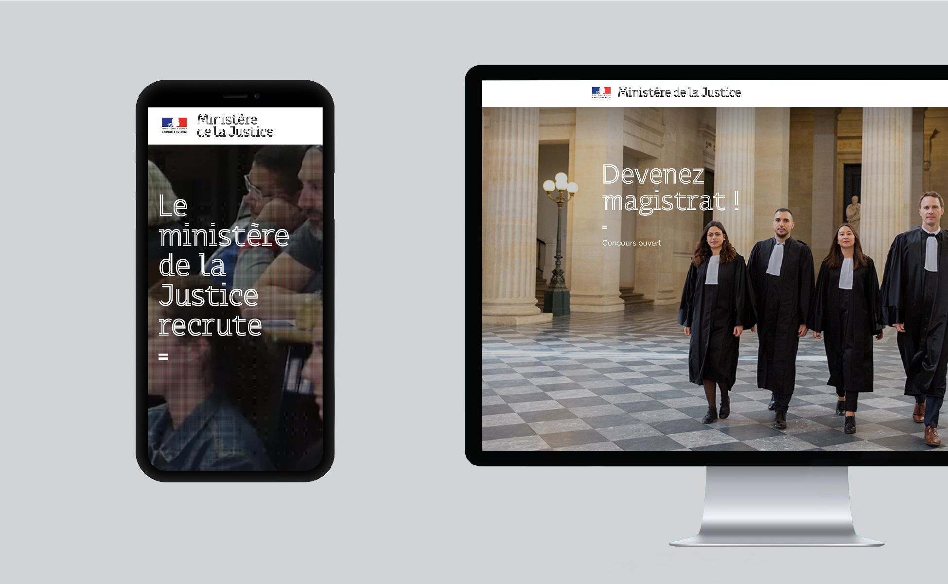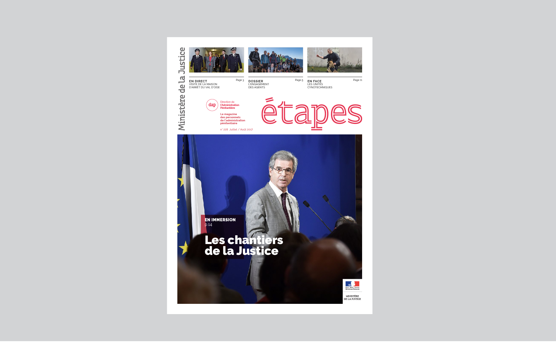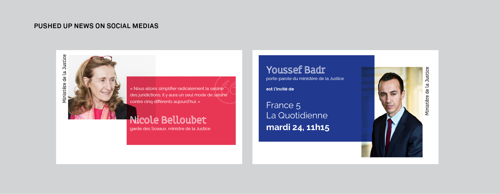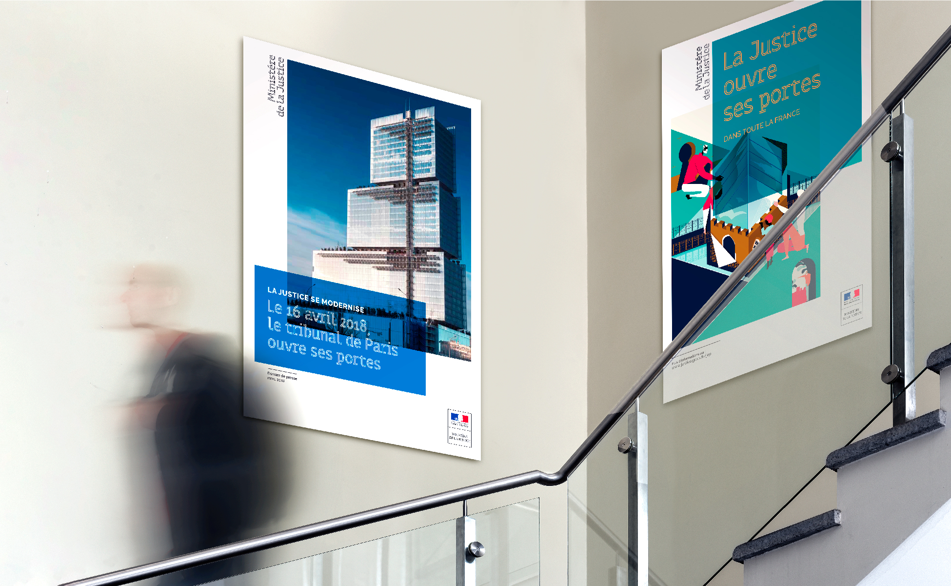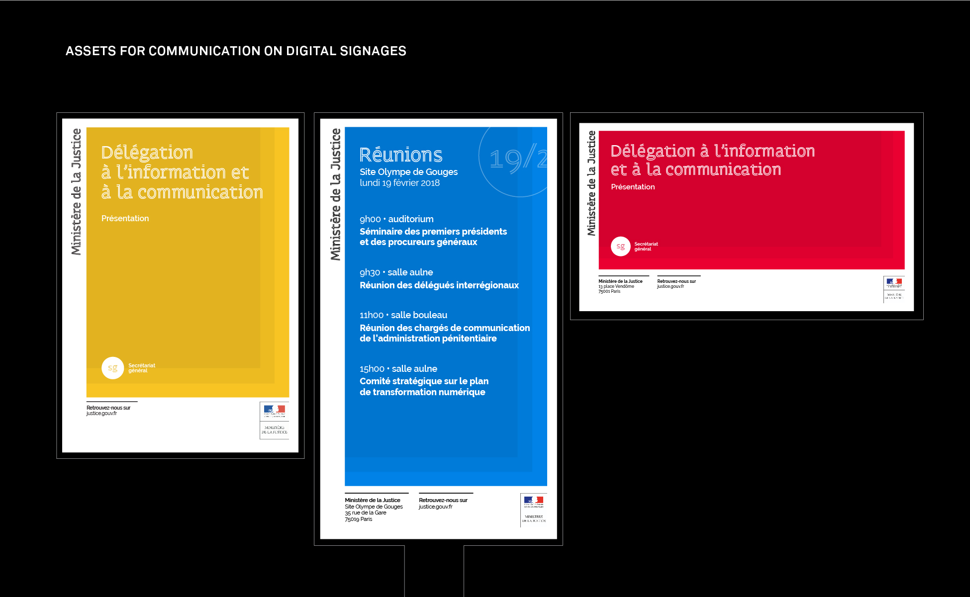 Pour le ministère de la Justice, nous avons dessiné une gamme de pictogrammes incarnant les différentes fonctions et utilités de l’institution. Les pictogrammes reprennent le style typographique au trait ouvert. Enfin, le troisième degré intègre une iconographie photographique et/ou illustrée. La superposition d’aplats colorés et de photographies apporte du rythme et donne du relief aux mises en page. L’ensemble des maquettes construites sur cette grille modulaire permettent une grande flexibilité de composition pour les équipes de communication qui se réapproprient le système en interne.