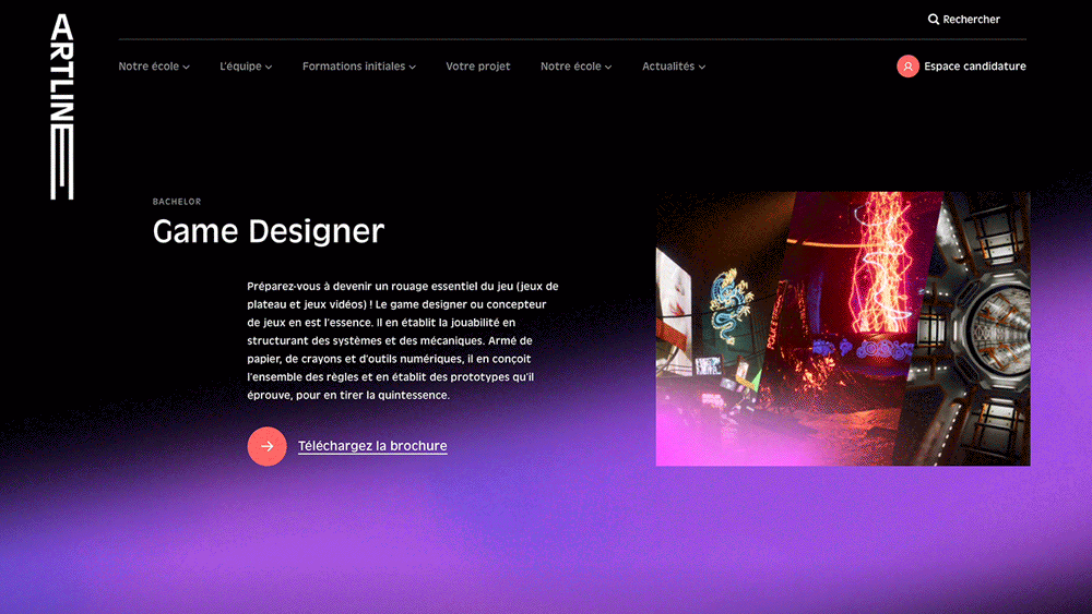 Cette identité visuelle reflète l’aventure, le parcours de l’étudiant, ainsi que les valeurs de cette école en tout point unique. Le logo, la brochure, le motion design ainsi que la communication print cohabitent dans un système graphique joueur et ludique confèrent à Artline, une image cohérente.