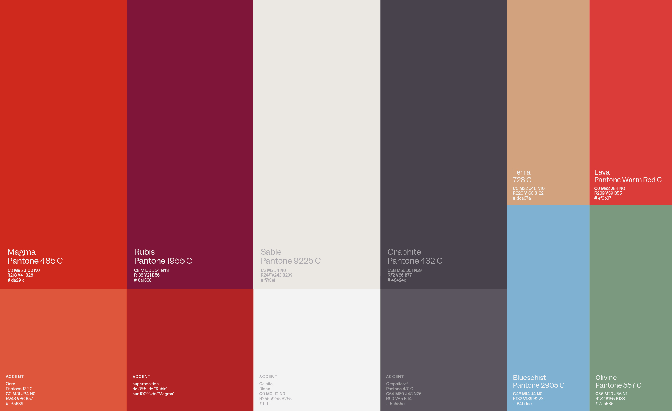 La palette de couleurs primaires comprend quatre couleurs d’accentuation qui sont conçues comme des compléments aux couleurs de base Magma, Rubis, Sable et Graphite. La gamme de couleurs secondaires IPGP est conçue comme une suite fonctionnelle et complémentaire de nuances.