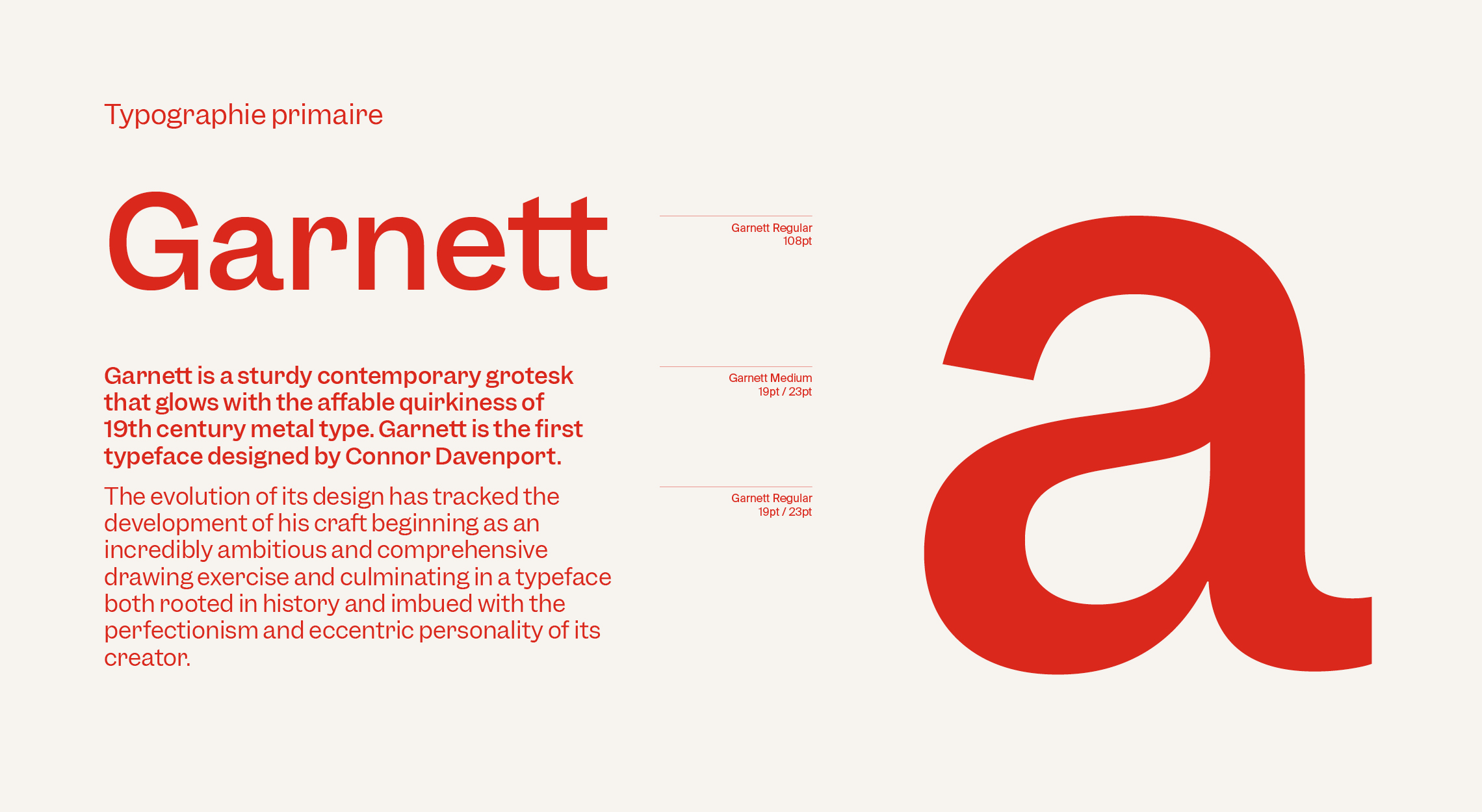 Le Garnett devient la typographie primaire de la charte graphique IPGP. C’est une grotesque contemporaine robuste conçue par Connor Davenport et distribuée par la fonderie Sharptype. Elle se distingue par la personnalité affable des caractères métalliques du 19e siècle. Le rôle de Garnett est d’attirer l’attention sur les messages les plus importants communiqués par IPGP et elle est donc utilisée avec prudence et parcimonie pour les grands titres et les textes courts. La typographie pour le texte de labeur est le Suisse Int’l, une sans serif simple et efficace.