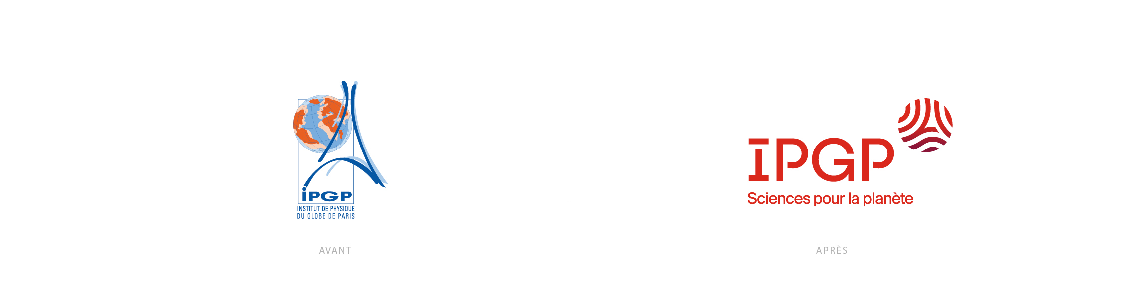 L’ancien logo de l’IPGP posait des problèmes de lisibilité et n’était plus adapté aux supports de communication actuels. Une étude de son graphisme a permis de mettre en évidence sa trop grande complexité, sa nature trop illustrative au design « générique » ; son acronyme « soudée » à l’emblème qui interdit toute flexibilité dans l’usage et les déclinaisons du logotype ; la présence de l’intitulé « Institut de Physique du Globe de Paris » qui explicite l’acronyme mais reste illisible en petite taille.