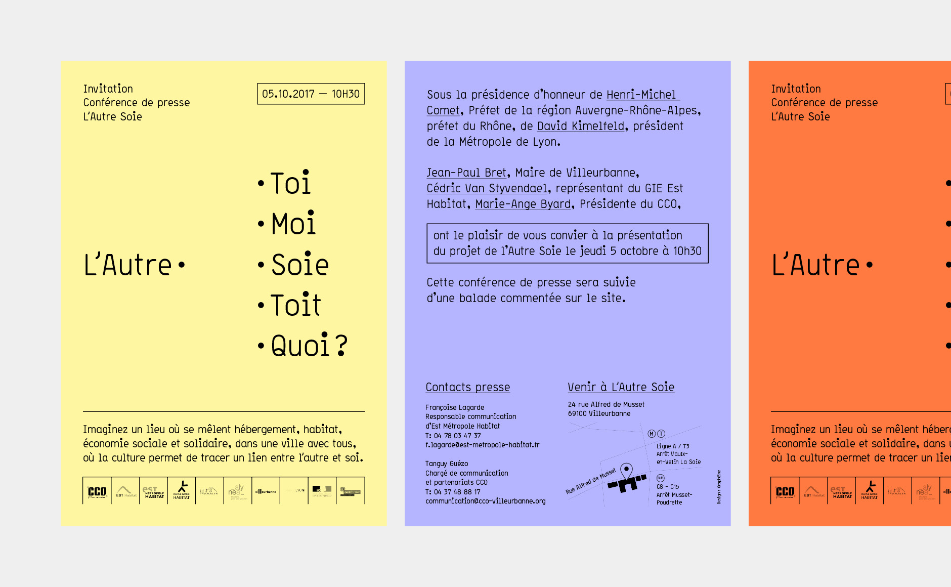 Nous avons également imaginé une architecture de nom pour les différentes entités du projet. Probablement plus un jeu poétique qu'une proposition fonctionnelle. Ce principe a inspiré le carton d'invitation pour l'inauguration... L'autre quoi ? moi ? toi ? toit ? Soie ?...