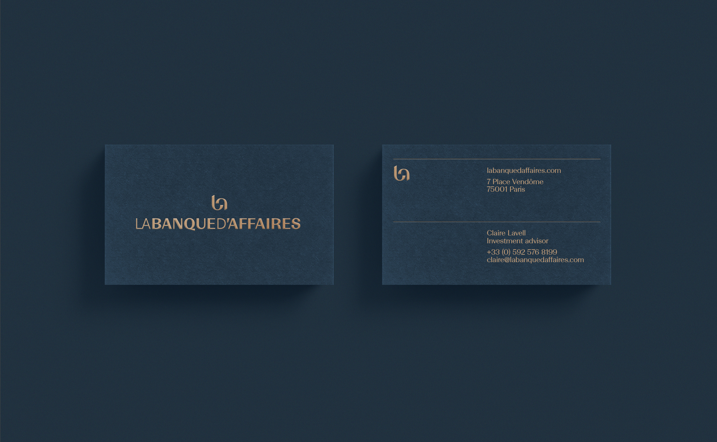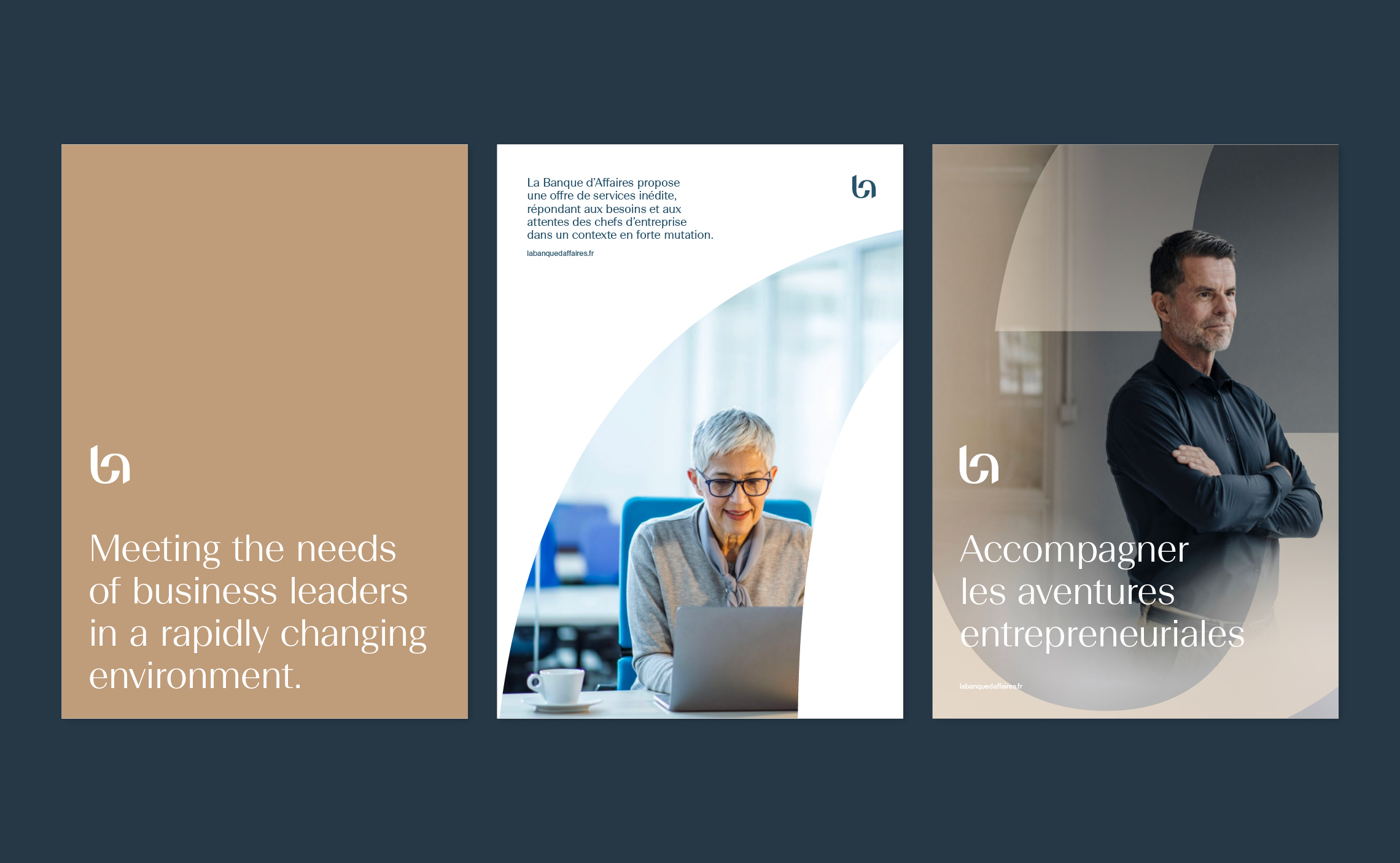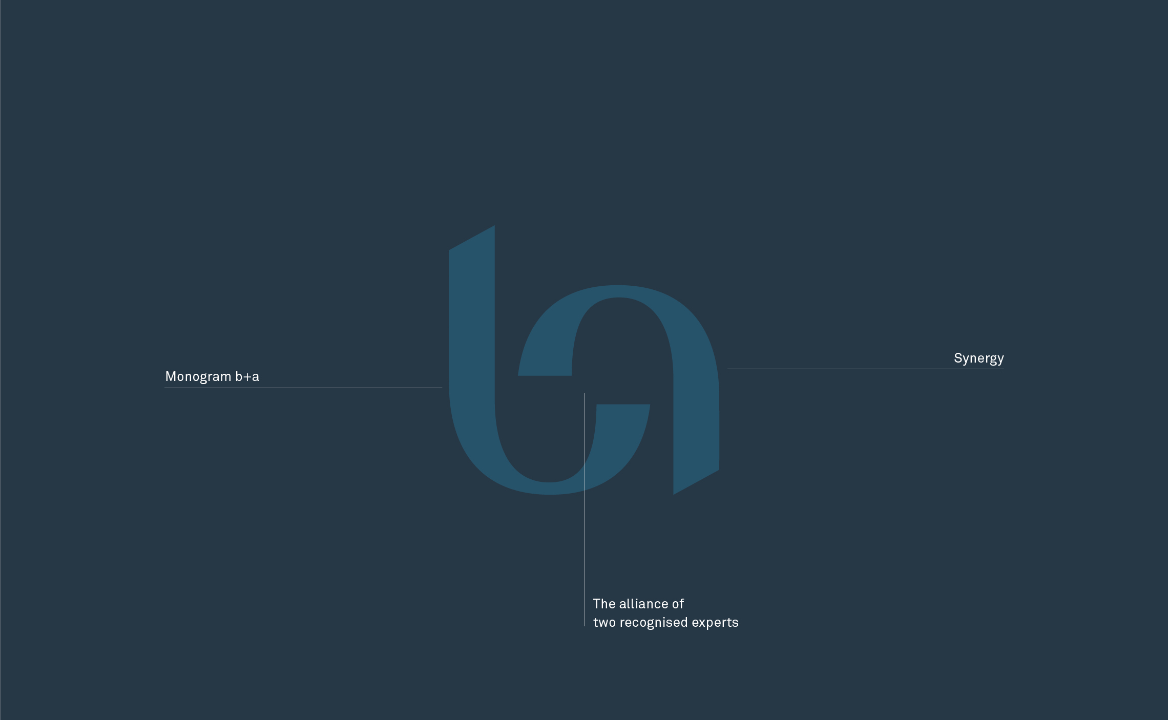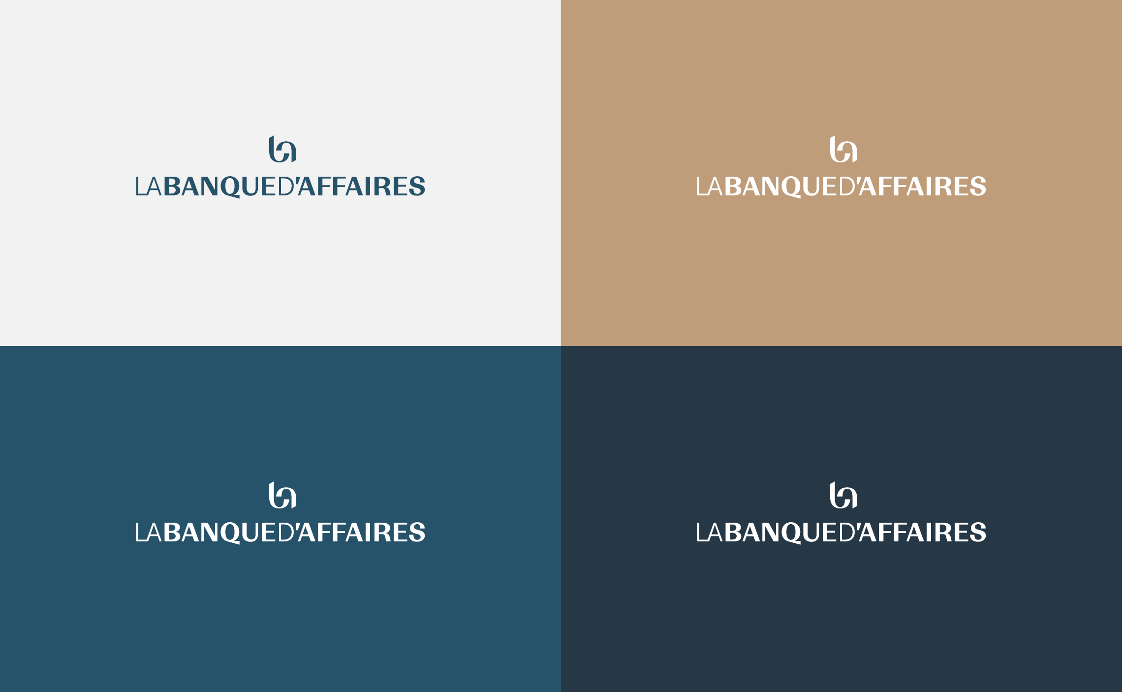Le nom de marque « La Banque d’Affaires » est un intitulé générique très présent dans le milieu bancaire. Il était nécessaire de faire du mot un logotype avec un caractère affirmé. Pour cela, nous avons souhaité créer un maximum de distinctivité et d’originalité en dotant l’identité visuelle d’un emblème et en transformant le nom de la marque en un mot unique. L’emblème prend la forme d'un monogramme et devient le symbole d'un partenariat équilibré. Le monogramme représente la synergie entre les deux entités fondatrices et la notion d’échanges (humains et transactionnels) entre la banque et son client.