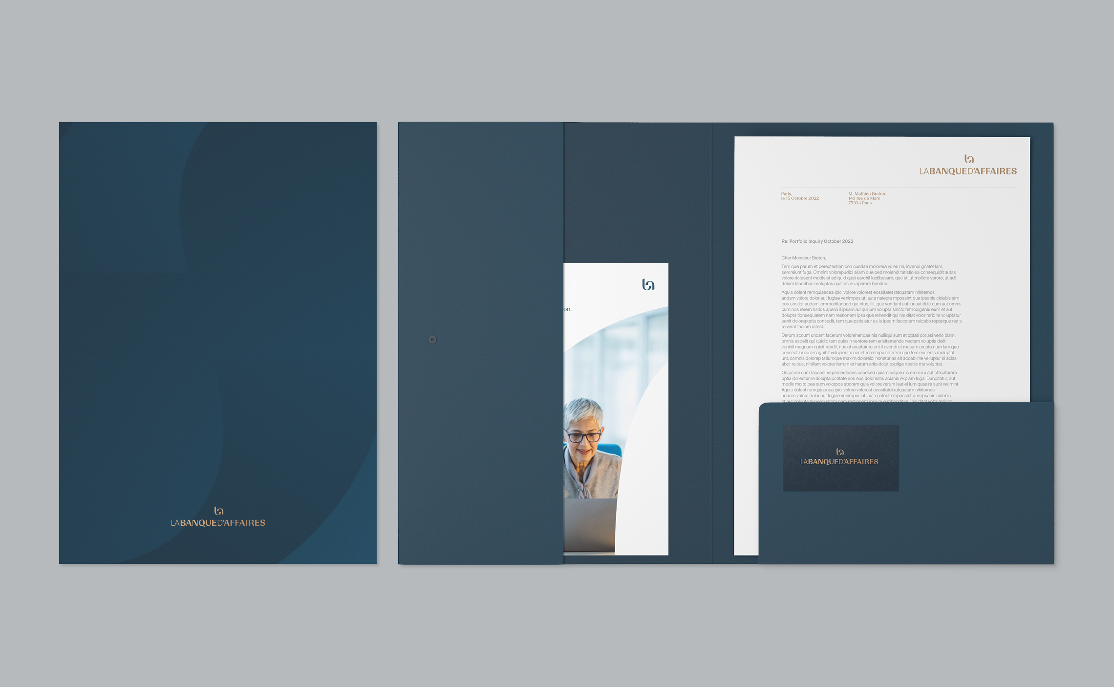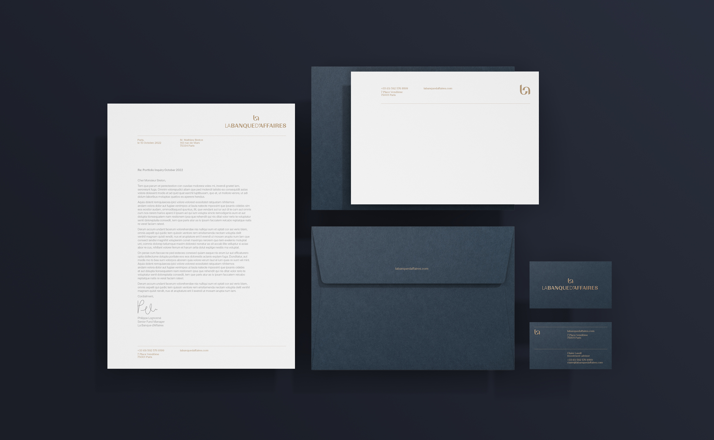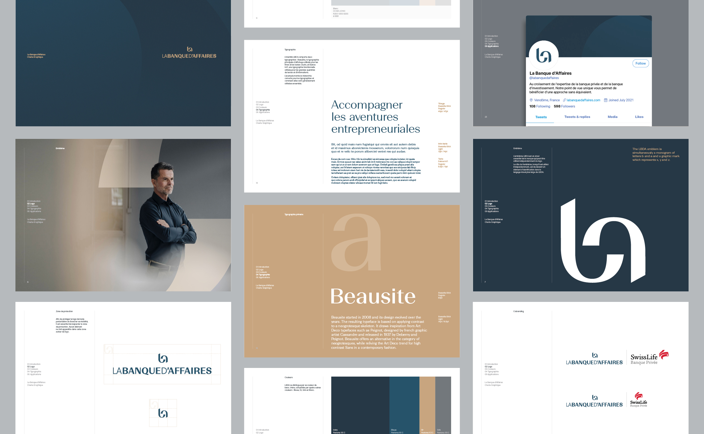 L’identité visuelle La Banque d’Affaires associe deux typographies : Beausite de la fonderie Fatype qui est utilisée comme caractère principal. Beausite s’emploie pour les titres et les textes courts. Tandis que la fonte Suisse Int’l de Swiss Typefaces est privilégiée pour les textes courants longs. Avec une identité visuelle distinctive, La Banque d’Affaires se positionne avec un service inédit et allie les expertises de ses entités fondatrices au service des professionnels.