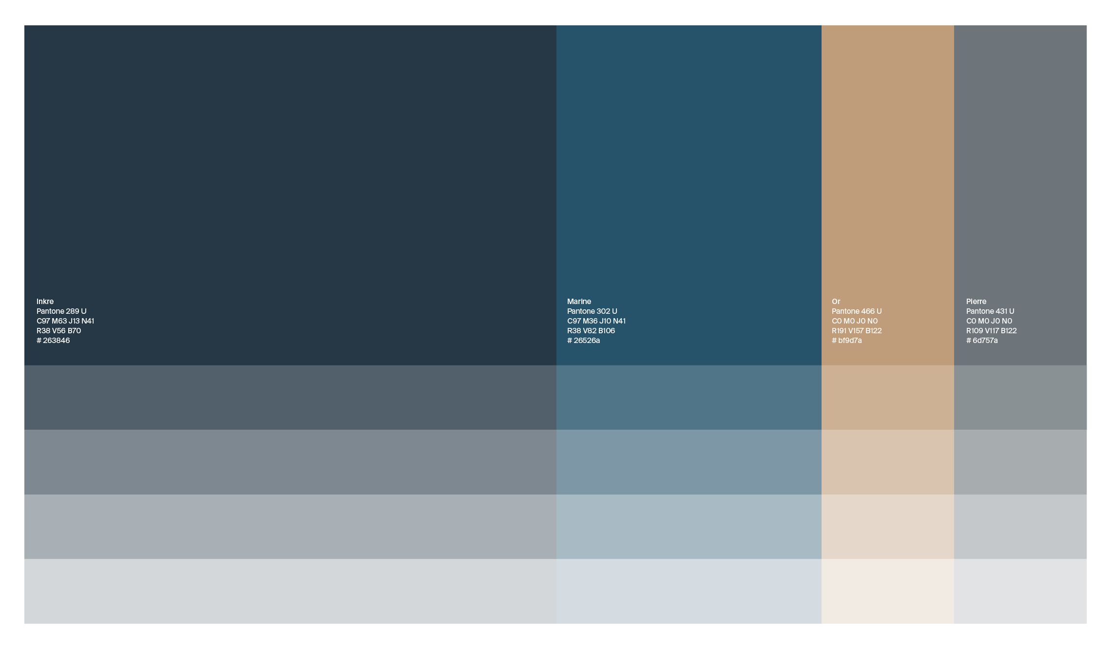Le bleu est une couleur fortement associée au monde bancaire. Nous avons retenu pour la gamme institutionnelle le bleu et l’or afin de connoter un service bancaire haut de gamme.