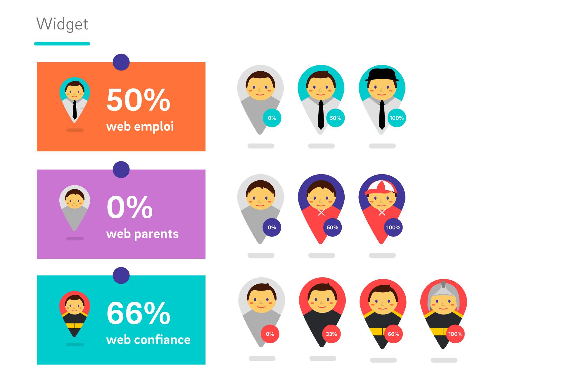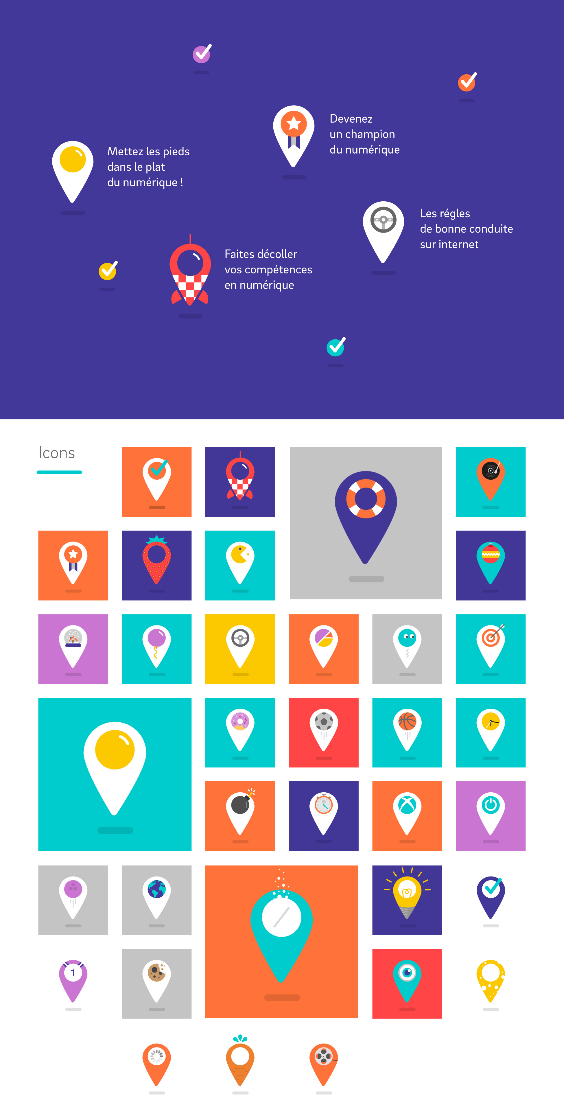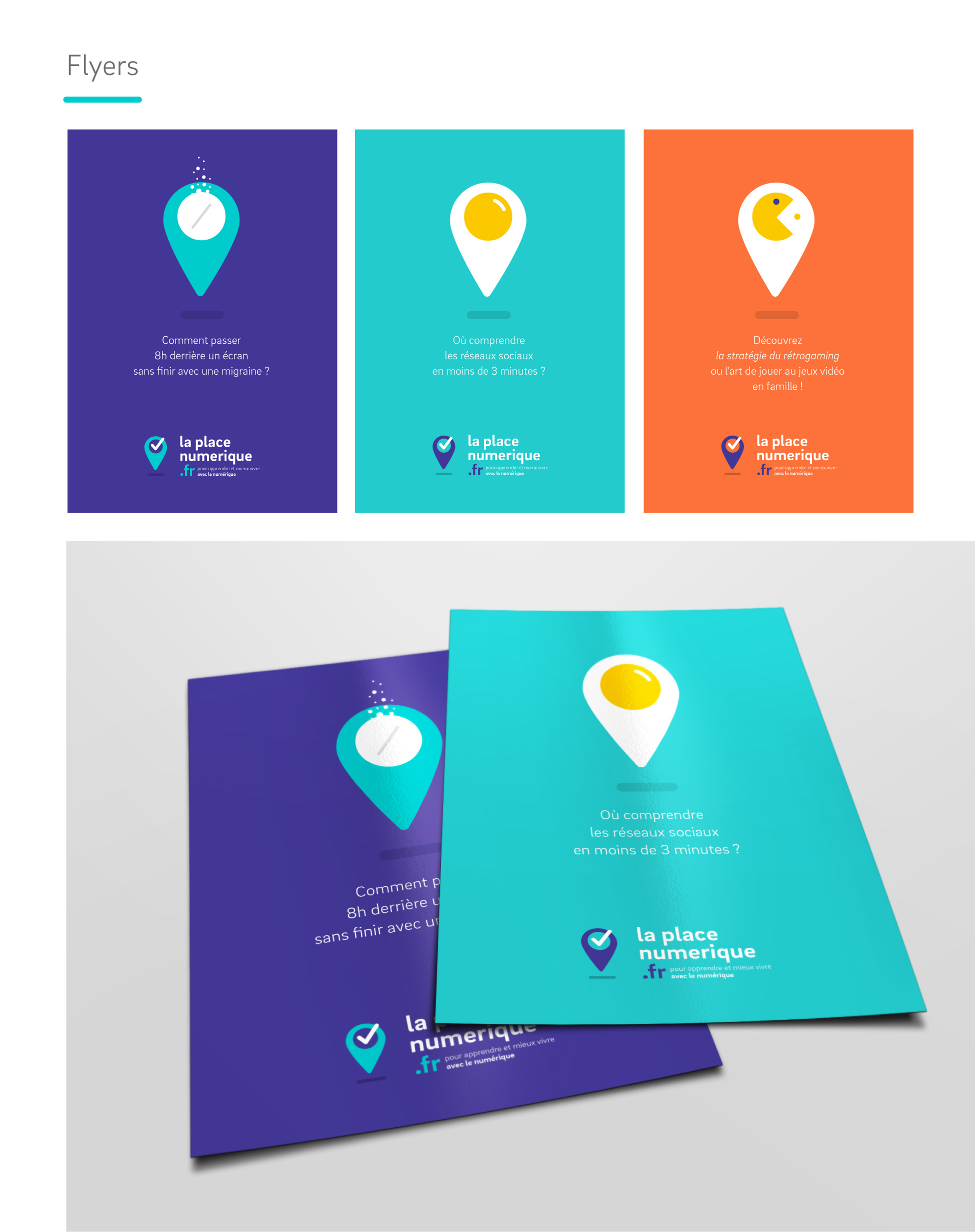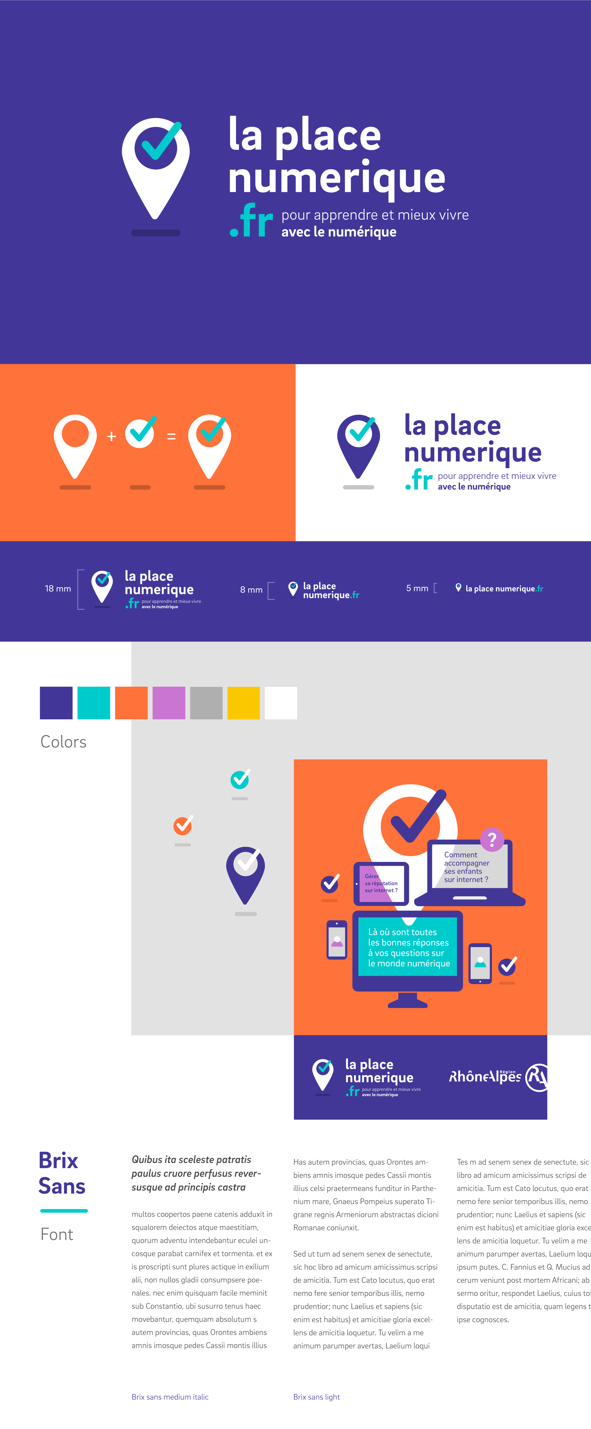 En mélangeant le symbole de géolocalisation issu des interfaces numériques et le symbole de la case cochée, évoquant l’idée d’un apprentissage, on obtient un logo singulier et minimaliste en accord avec l’objet et le nom du dispositif «La place numérique».