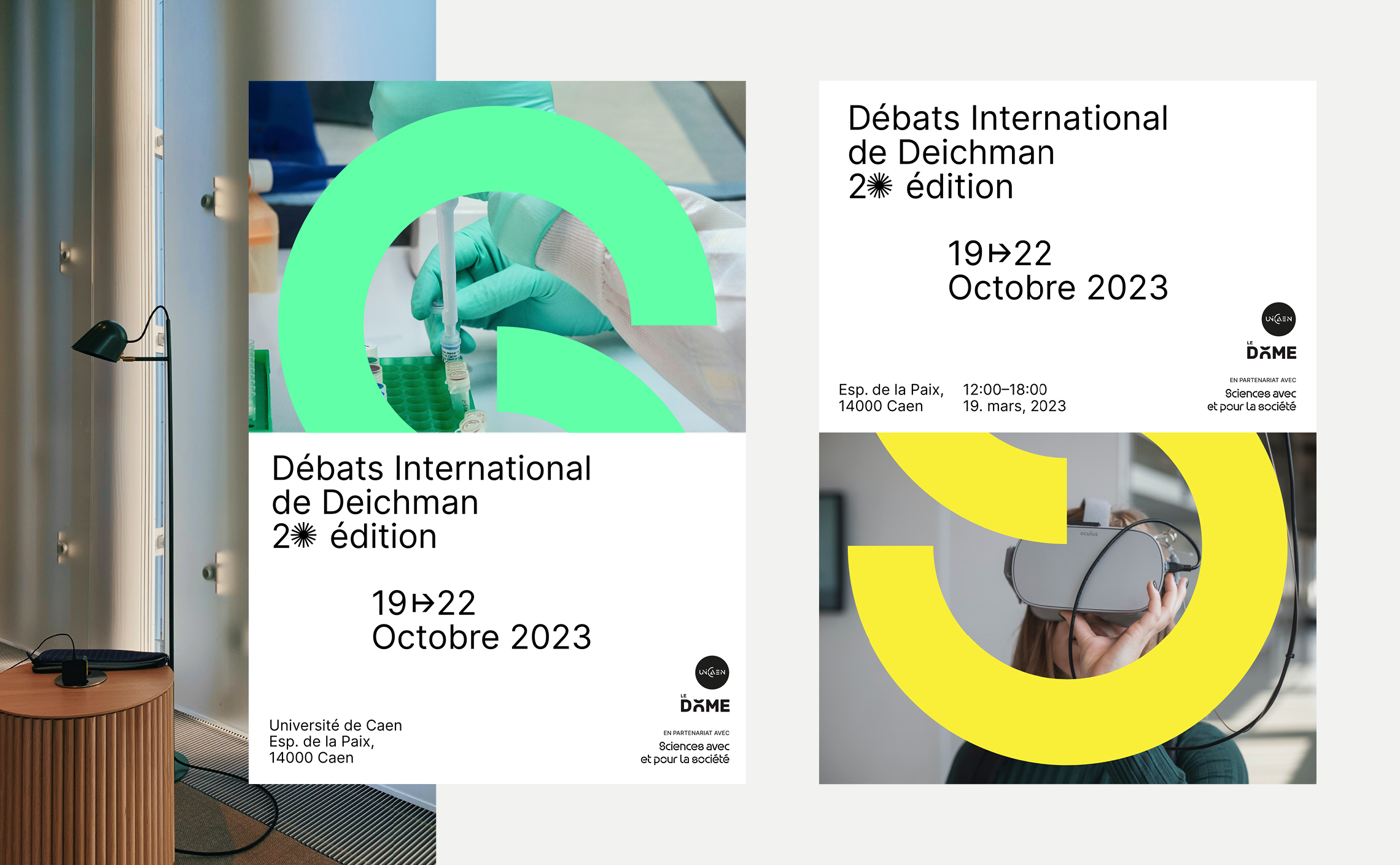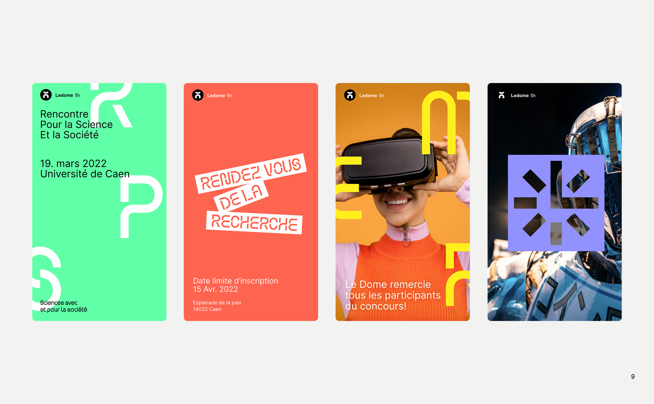 Une identité typographique était aussi une solution efficace pour faire coexister la marque avec les logos existants des 3 entités (UniCaen, SAPS, Le Dôme). Multi-facette, l’identité peut être à la fois sérieuse et professionnelle, à la fois évènementielle et ludique.