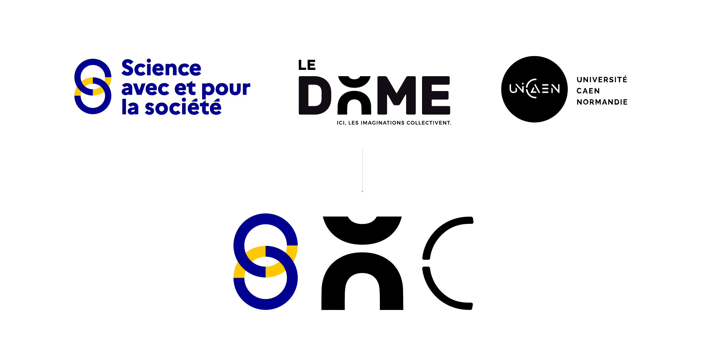 Notre observation initiale a permis de mettre en évidence un point commun entre les logotypes de l'Université de Caen, du Dôme et du label SAPS : un bloc typographique ou l’on retrouve la rencontre de deux formes. Cette rencontre de deux formes symbolisait graphiquement le croisement des sujets au cœur des objectifs du label SAPS, qui a pour but de promouvoir la rencontre entre :