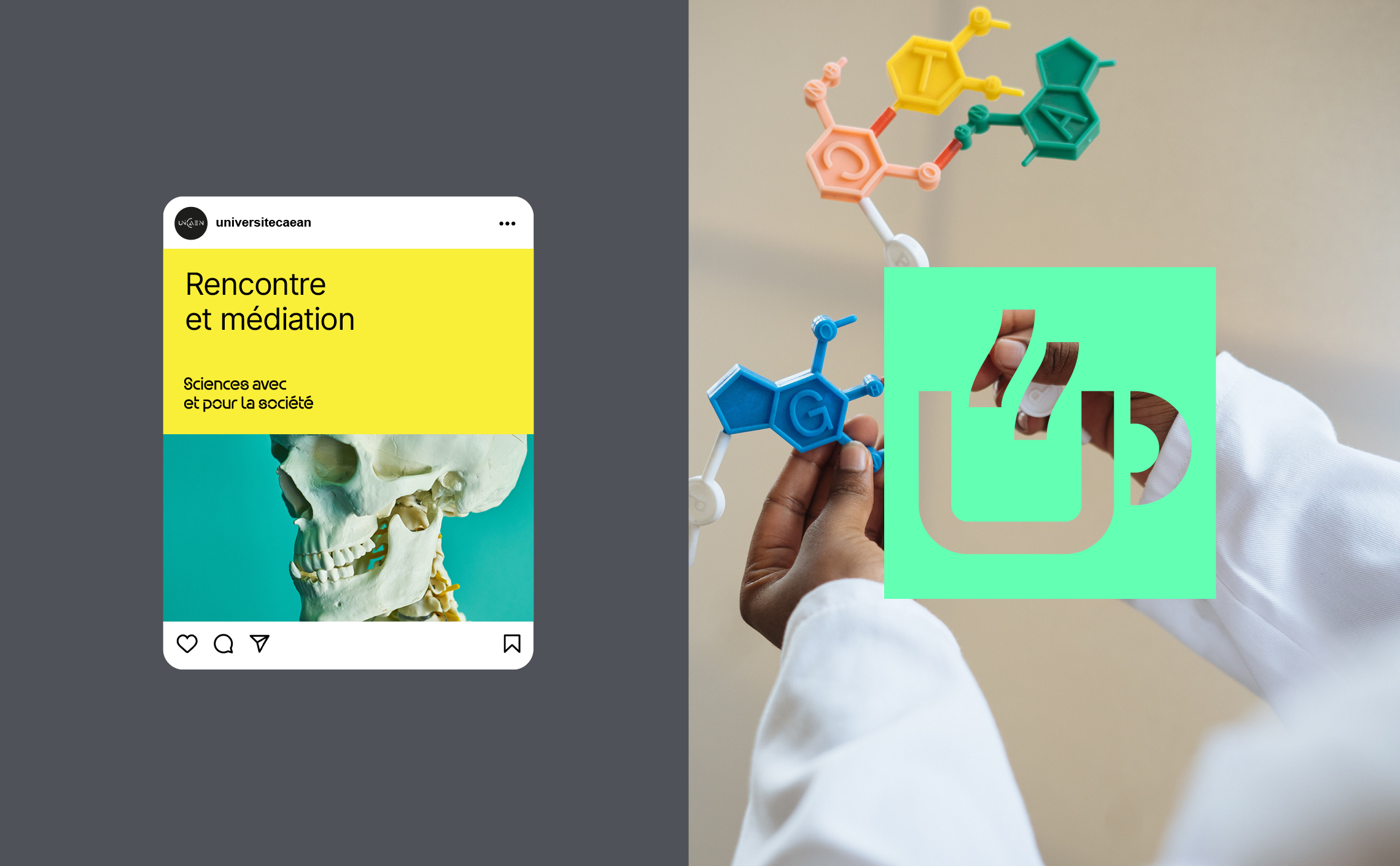 Afin d’attiser la curiosité et l’envie d’un public universitaire et casser l’image souvent trop technique et fastidieuse du domaine de la science et de la recherche, l’univers de la marque développe un style ludique et contemporain pour que le domaine de la sciences et de la recherche soit enfin perçu comme un sujet engageant, collectif et dynamique.