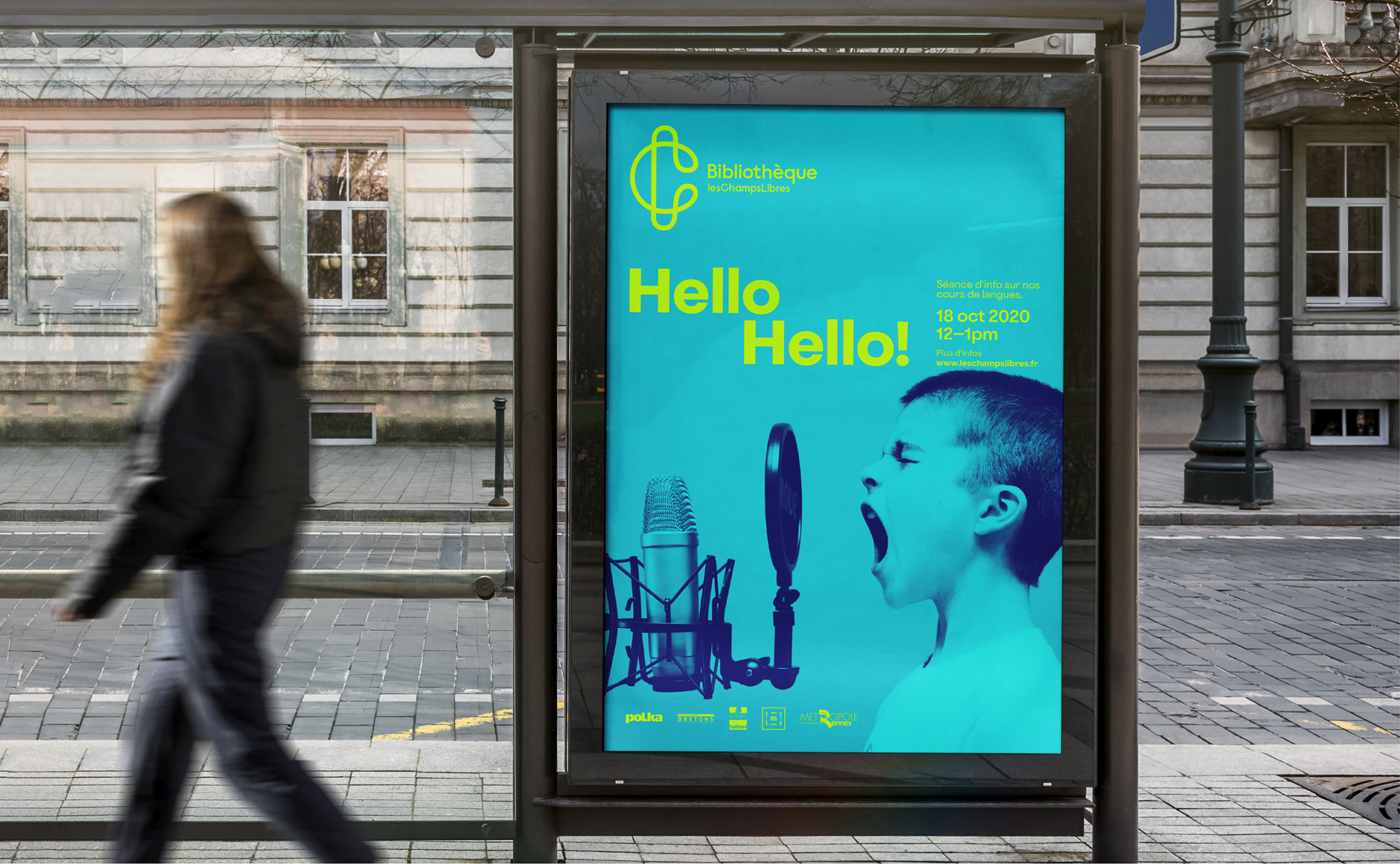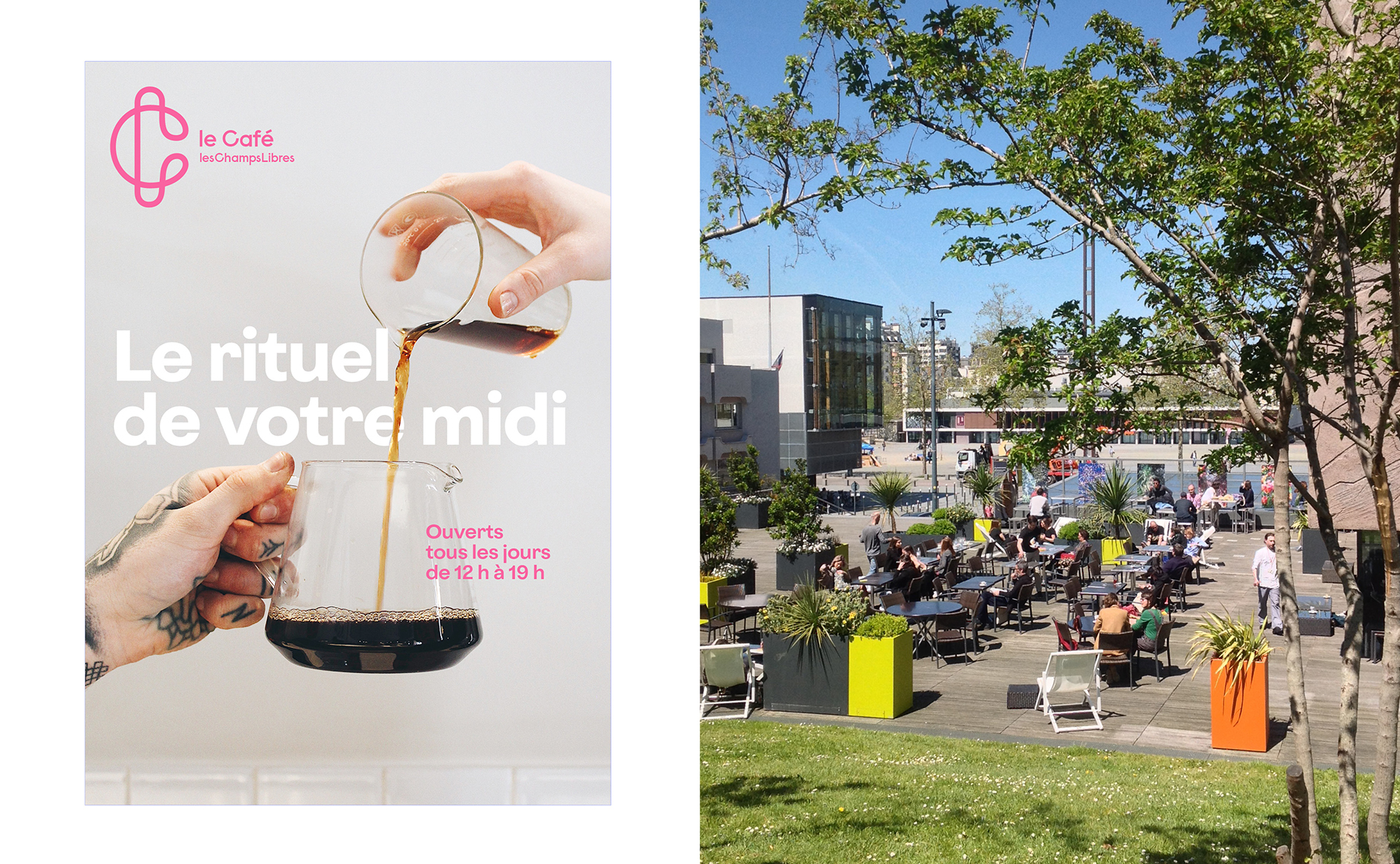 La communication des Champs Libres se déploie sur 4 principes de communication mettant son emblème à l’honneur. « L’enrelaCé caméléon » met l’emblème au centre et le pare différemment au fil des saisons et thèmes. Le langage entrelacé permet lui de construire une communication plus quotidienne en déployant une banque de mots reflets du lieu construits autour de la lettre/emblème C. Deux autres principes visuels jouent avec l’intégration de l’emblème dans l’environnement des Champs Libres et avec ses publics. Ce dernier vient s’entrelacer aux différents plans, embrasse les activités du lieu.